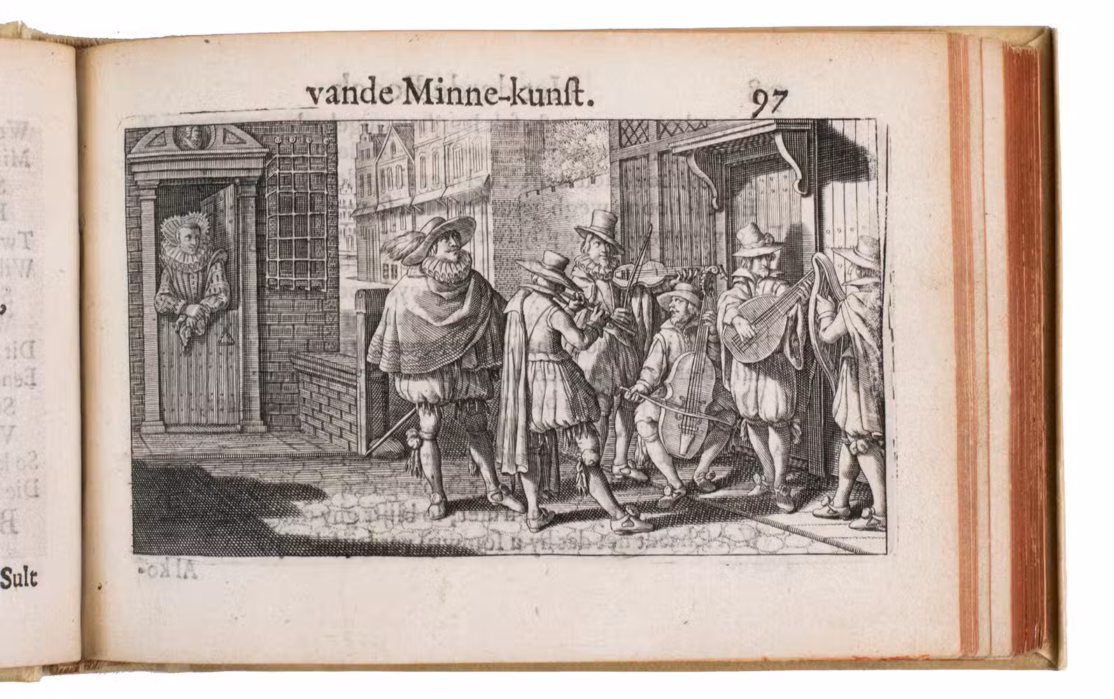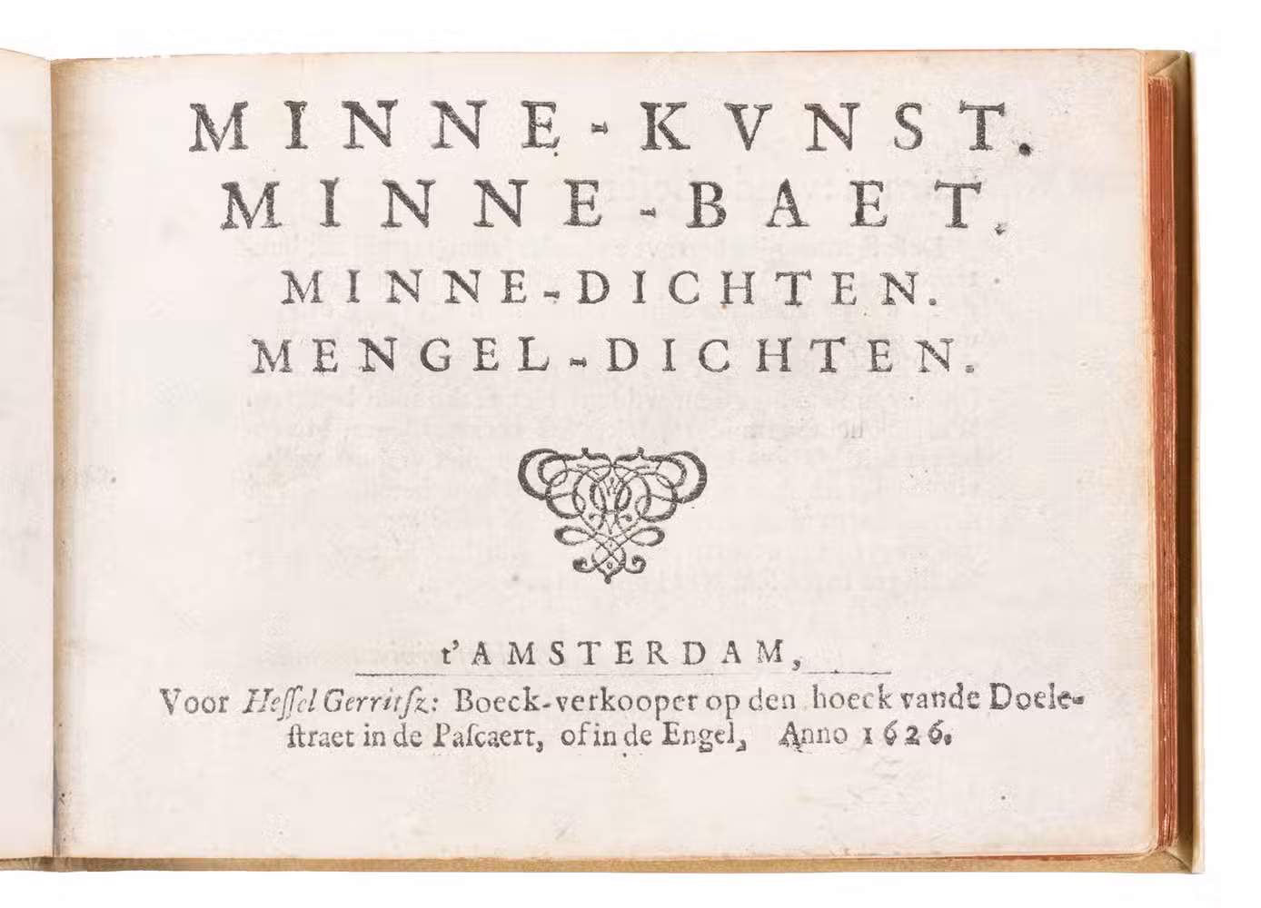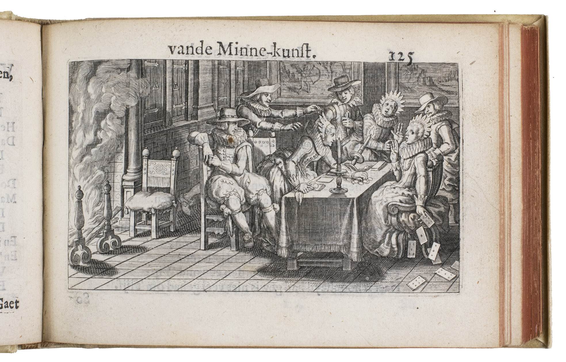 Second edition, enlarged in text and illustrations, of one of the most attractive and rare Dutch songbooks of the early seventeenth century, not only because of the beautiful illustrations, fine printing, and oblong format, but also because of the charm and elegance of its poetry, which consists mainly of erotic love poems. It presents the example par excellence of the fine books intended to instruct and amuse the Dutch "jeunesse dorée". The book, containing the youth-poetry of Johan van Heemskerck (1597-1656), is divided into four parts.