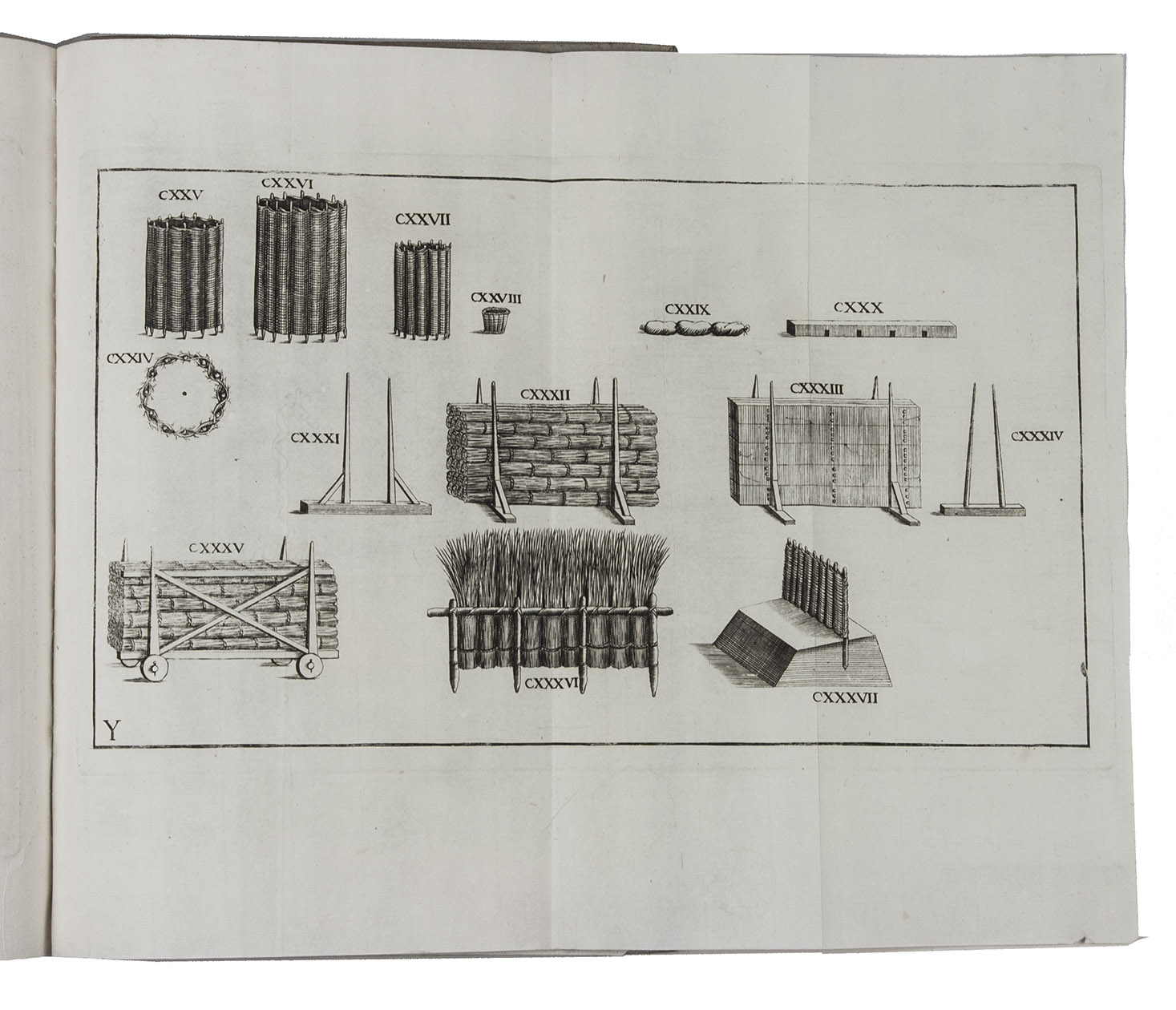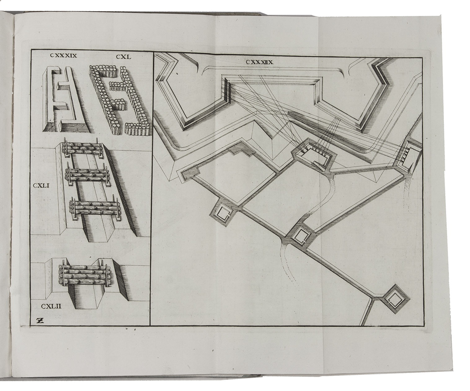 First edition of an important German work on fortification, with 27 folding plates. It forms a complete handbook in three parts, the first covering fortifications of both regular and irregular form, the second covering siege techniques and the third the defence of cities and fortifications. Christoph Heidemann (d. 1684) was military engineer to the Elector of Bavaria. He was a follower of Daniel Specklin (1536-1589), but introduced many improvements in technique and equipment. Like Antoine de Ville (1596-1656), he strongly recommends the construction of orillons at the corners of fortifications to cover the flanks, an idea the Dutch school had rejected. The 168 fine-line engravings include many fortification plans, sections, elevations and views, mostly with scales, but also illustrations of building techniques and equipment, palisades, tunnels, facilities for supplying water, etc. The last plate is signed by Stenglin, perhaps indicating that he engraved them all.