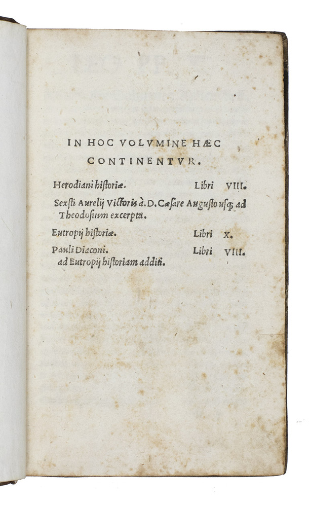 In hoc volumine haec continentur. Herodiani Historiae. Libri VIII. Sexti Aurelii Victoris a d. Caesare Augusto usque ad Theodosium excerpta. Eutropii Historiae. Libri X. Pauli Diaconi libri VIII. Ad Eutropii historiam additi.