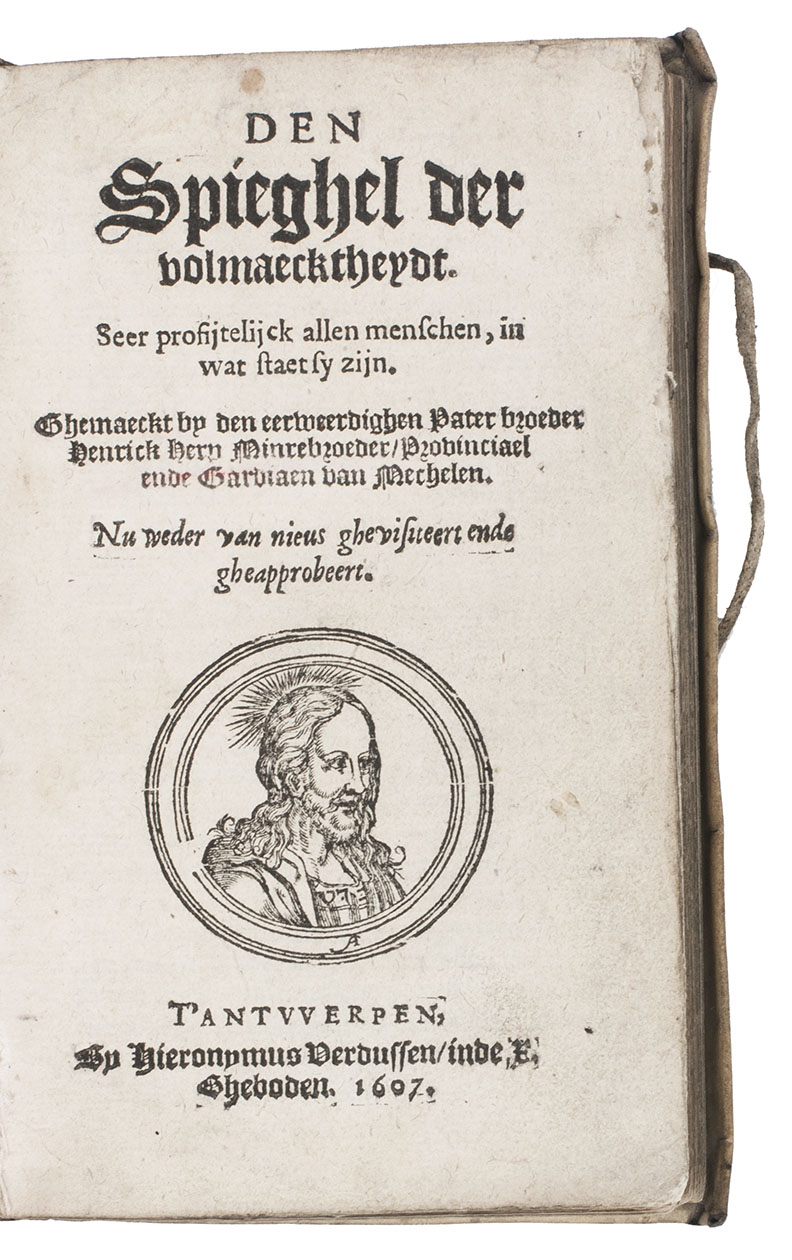 Antwerp, Hieronymus Verdussen, 1607. 8vo. With a woodcut roundel portrait of Jesus on the title-page (signed "A"), a woodcut tailpiece, and decorations built up from cast arabesque fleurons. Contemporary overlapping vellum, leather thong ties. [162], [2 blank] ll.