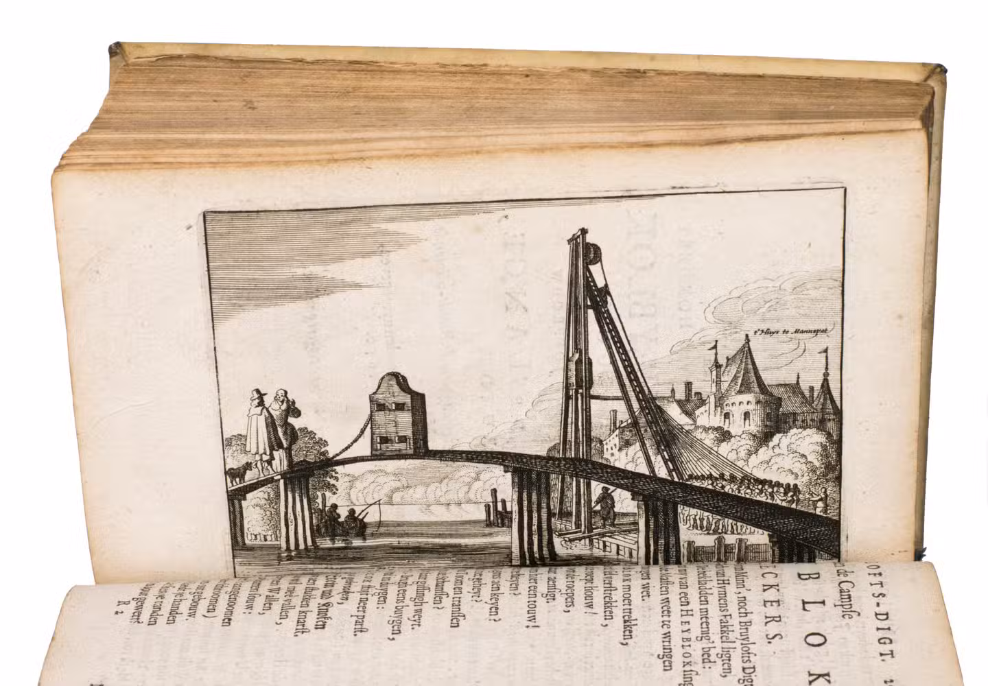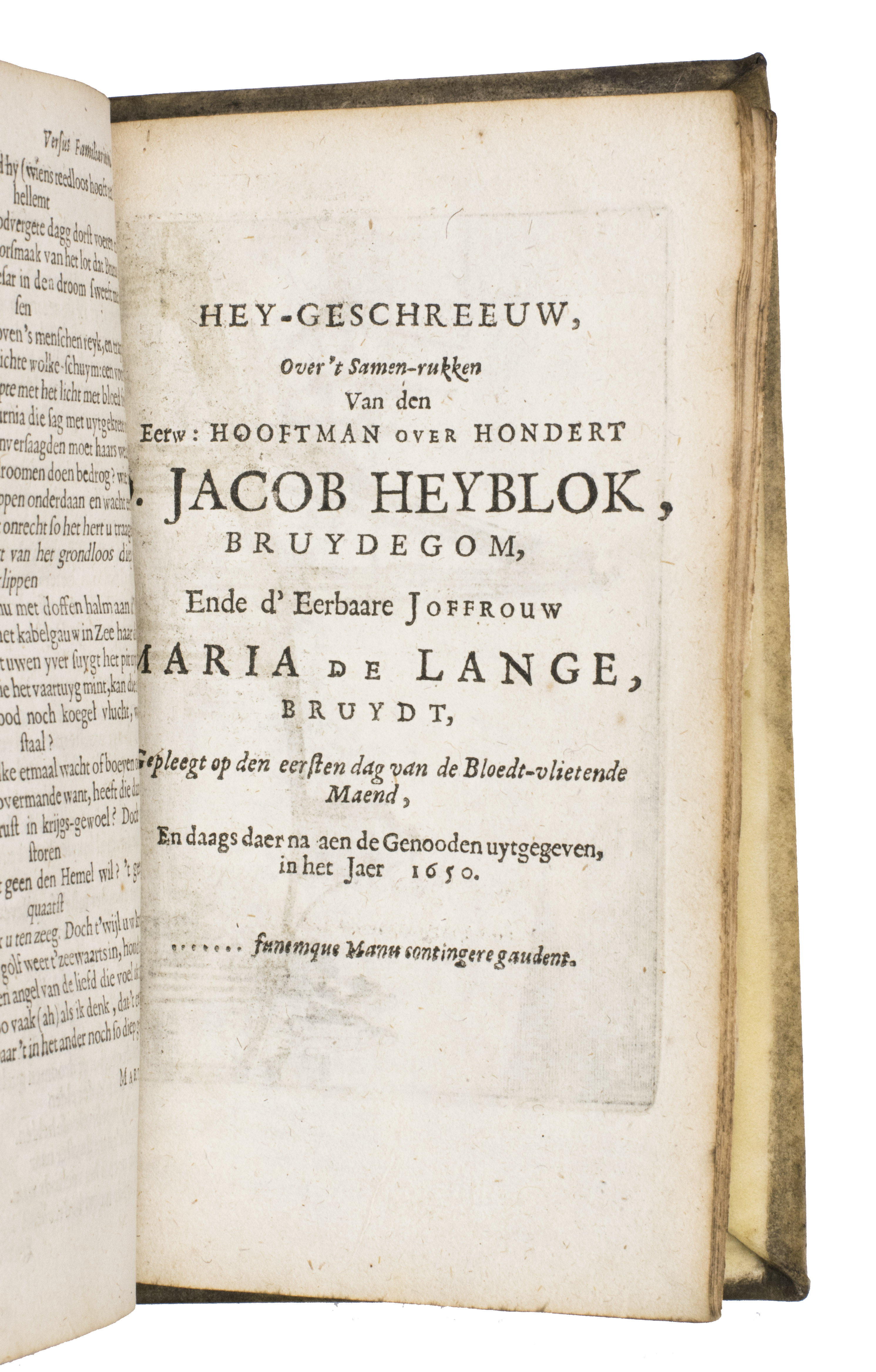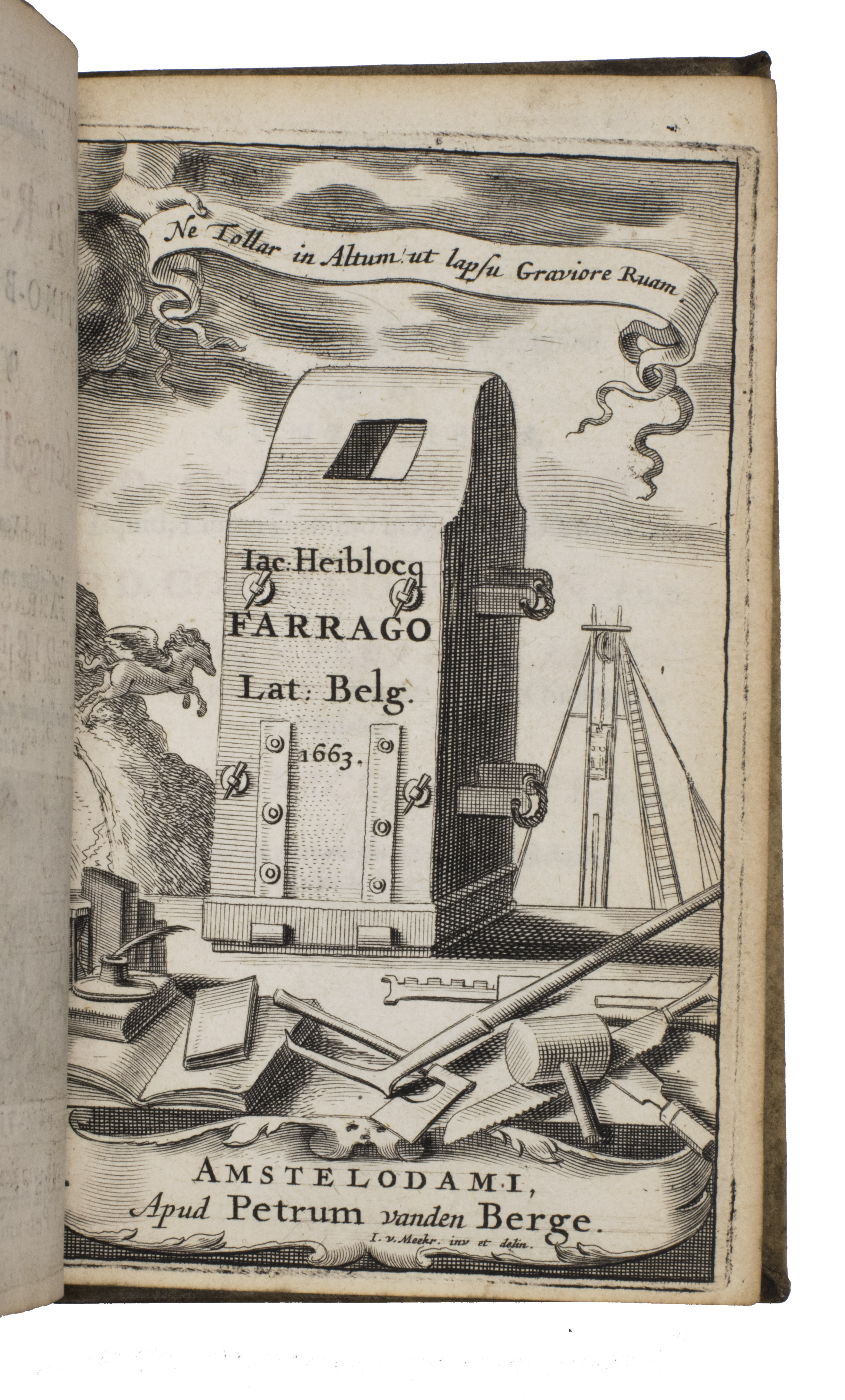 First and only edition of an illustrated collection of occasional poetry in Dutch and Latin by the Amsterdam schoolteacher Jacobus Heiblocq (1623-1690). He was well acquainted with the most famous poets of his time, as illustrated by their laudatory poems published here. Heyblocq's poems were written for important occasions, such as weddings, funerals, birthdays, and births. The work has been illustrated with three engravings, all depicting the block of a pile driver. This is a reference to the author, as this block is known as a "heiblok" in Dutch.