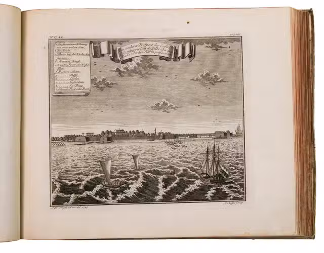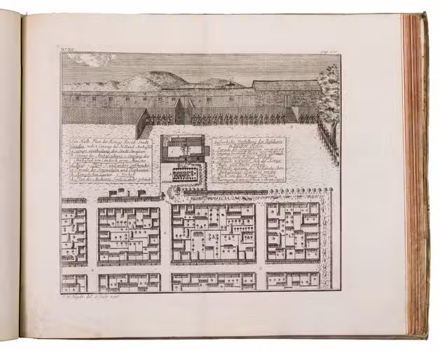 The illustrations show the influence of the VOC in Africa and Asia (ports, cities, factories, etc.), and are engraved after Johann Wolffgang Heydts (1702-1750) original drawings, which he made during his voyage to the East Indies. The plates are of great topographical and ethnological value. Heydt accompanied them with an account of his journey, which also contains much important information.