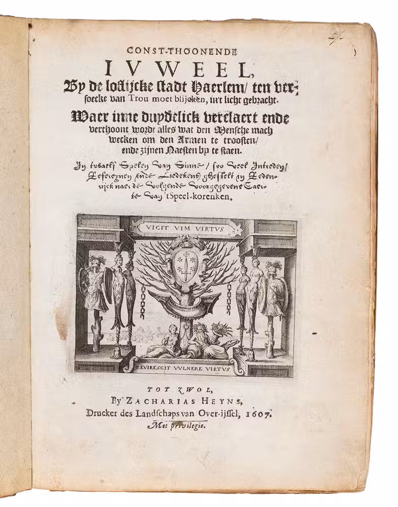 Const-thoonende juweel by de loflijcke stadt Haerlem, ten versoecke van trou moet blijcken, in't licht gebracht. Waer inne duydelick verclaert ende verthoont wordt alles wat den mensche mach wecken om den armen te troosten, ende zijnen naesten by te staen. In twaelf spelen van sinne, so veel intreden, refreynen ende liedekens ghestelt in redenrijck naer de volgende voorgegevene caerte van 't speel-korenken.