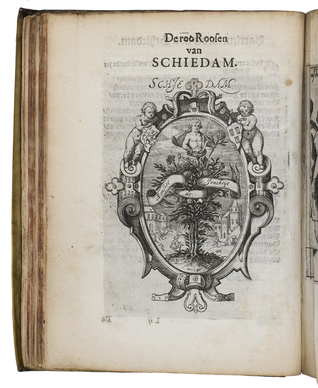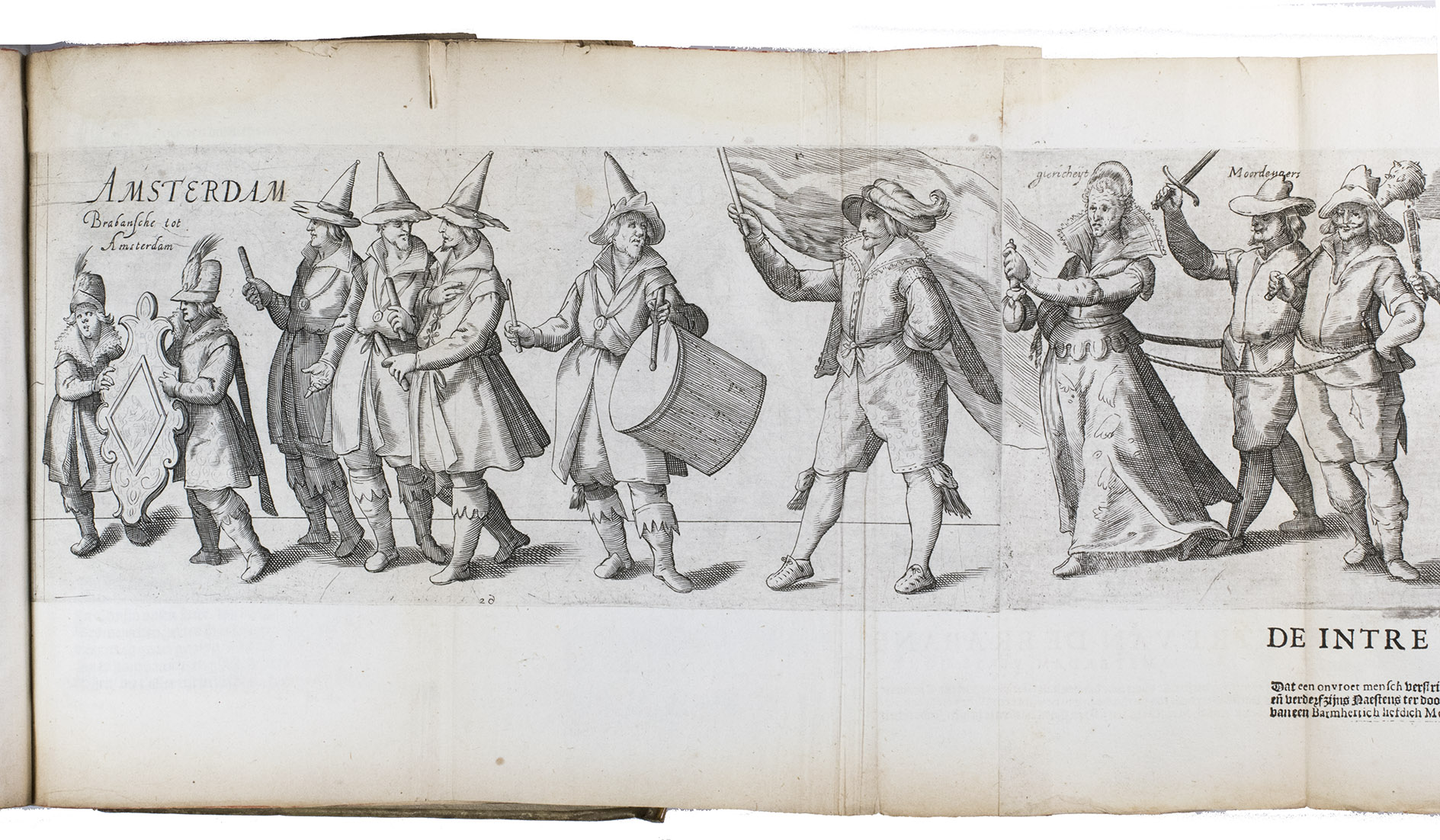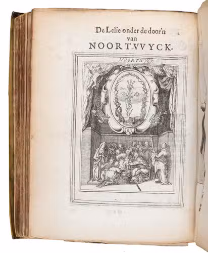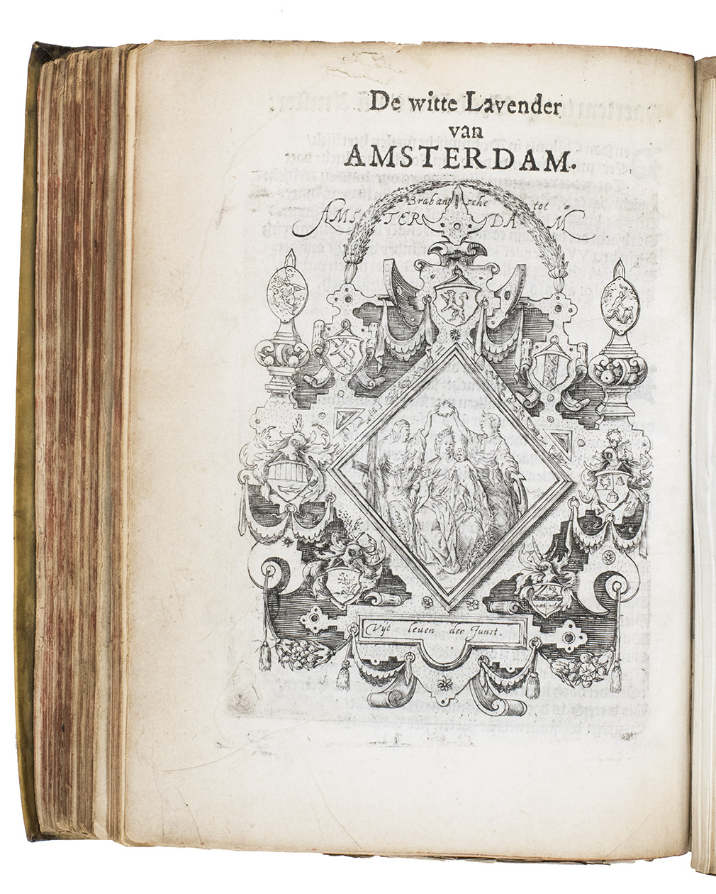 Very rare complete and beautifully illustrated account of the festive literary competition hosted by Haarlems chamber of rhetoric, which brought together participants from chambers of rhetoric throughout the Dutch Republic in October 1606. It gives an account of the prize competition and of the performance by the Haarlem Flemish Chamber for the benefit of the poor, without competing for the prize. These public theatrical performances of allegorical theatre plays had not only a high educational and moral quality for youth, but youth participated in the performances as well, as can be seen in the plates showing the entrees of the chambers presenting their actors to the public.