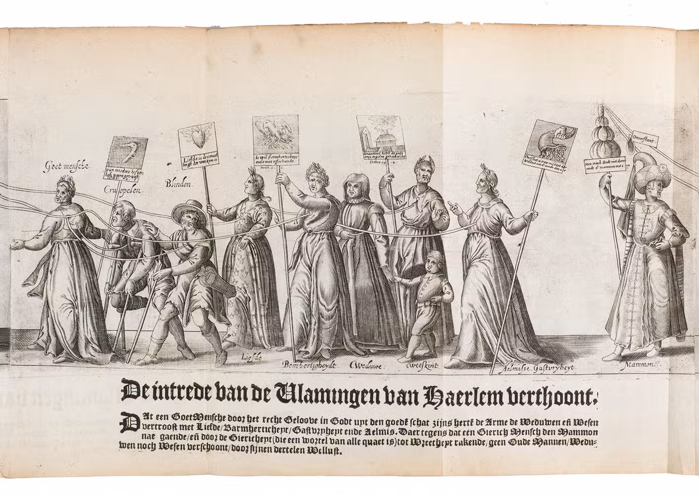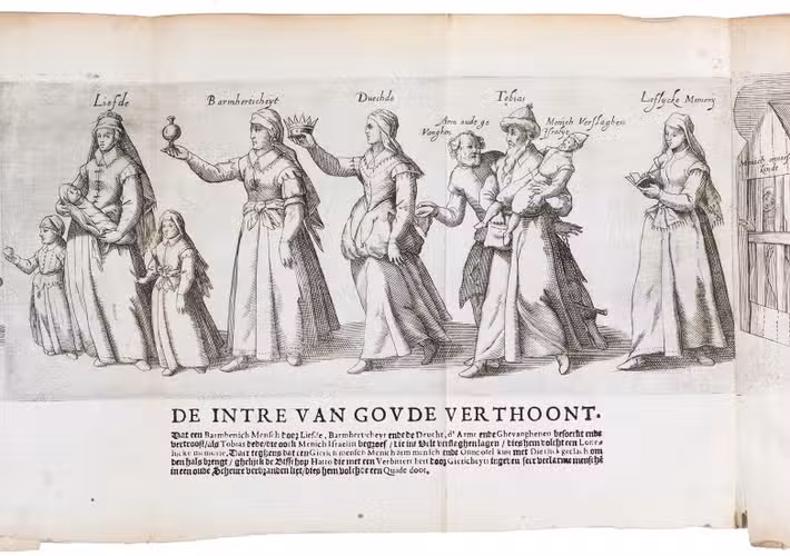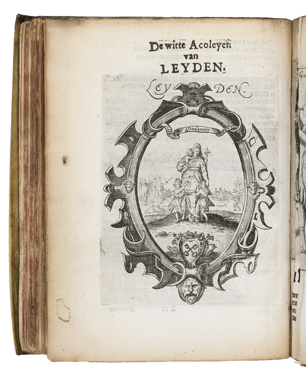 Very rare complete and beautifully illustrated account of the festive literary competition hosted by Haarlems chamber of rhetoric, which brought together participants from chambers of rhetoric throughout the Dutch Republic in October 1606. It gives an account of the prize competition and of the performance by the Haarlem Flemish Chamber for the benefit of the poor, without competing for the prize. These public theatrical performances of allegorical theatre plays had not only a high educational and moral quality for youth, but youth participated in the performances as well, as can be seen in the plates showing the entrees of the chambers presenting their actors to the public.