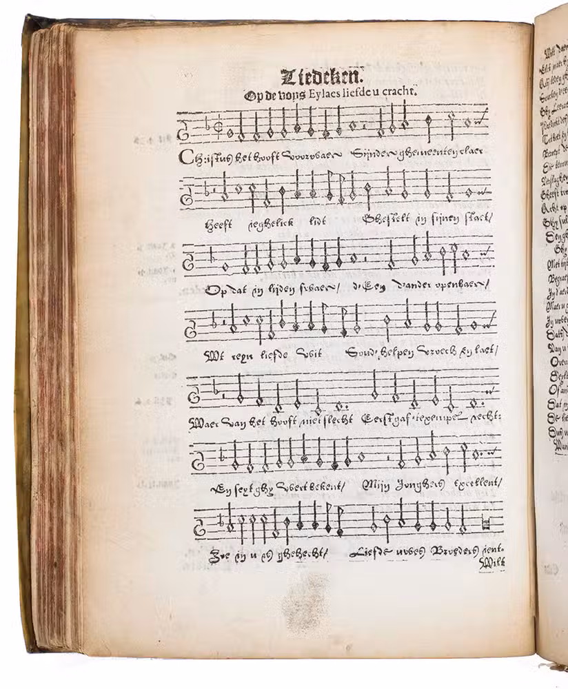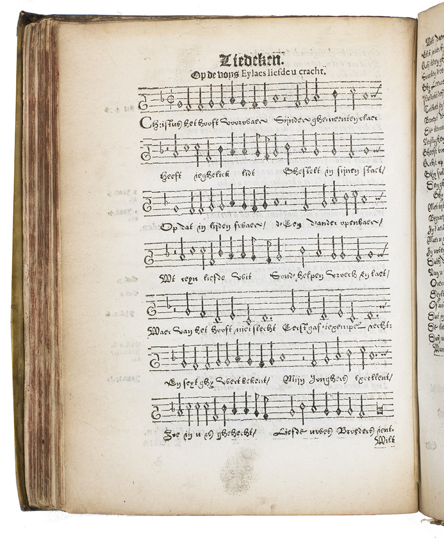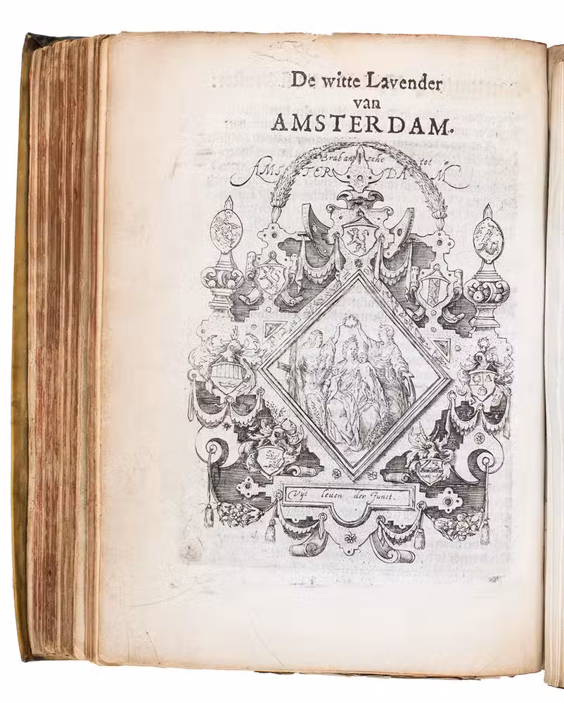 Binding slightly browned and stained. In very good condition. Van Aken, Cat. Ned. Toneel I, p. 5; Bibl. Belg., J 37; Carter & Vervliet, Civilité types 307; Goovaerts 429; Peter Nieuwenhuizen, "Sieraden van vier eeuwen oud: het Const-thoonend iuweel en het Haerlems juweel", in: Schoon schip, 13 (2006), pp. 4-11; Praz 307; Scheepers I, 55; Scheurleer, Liedboeken 138 & 139.