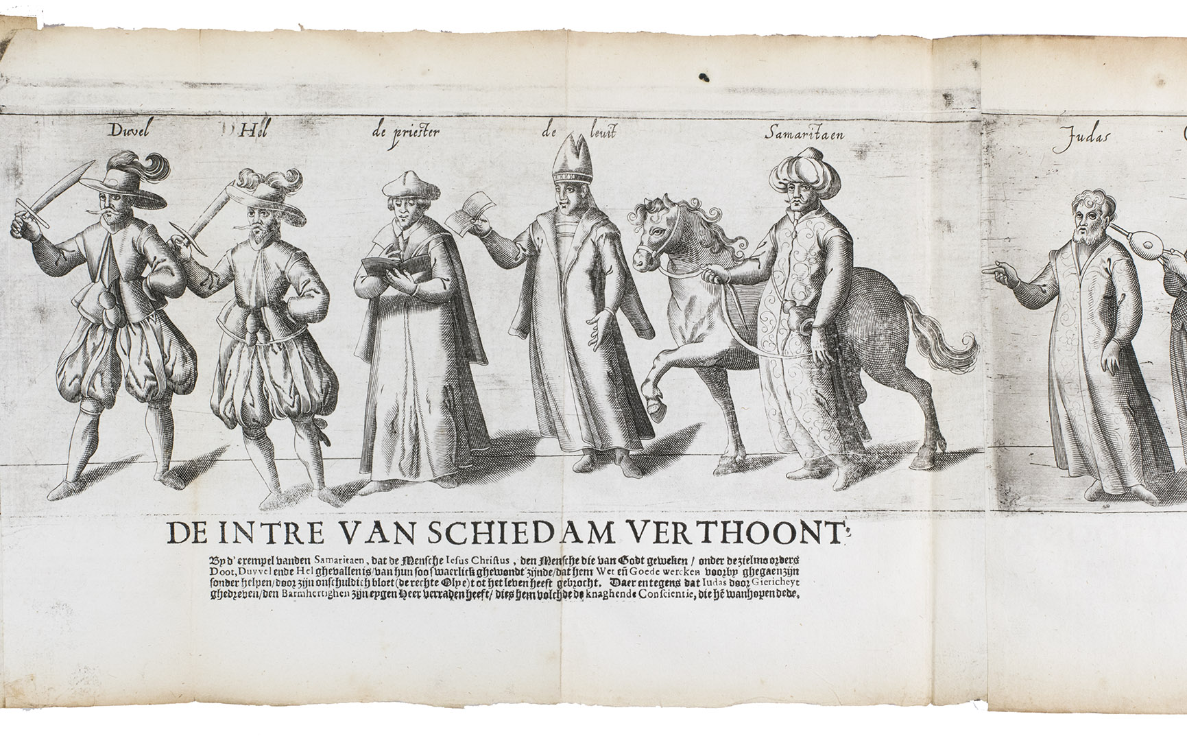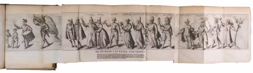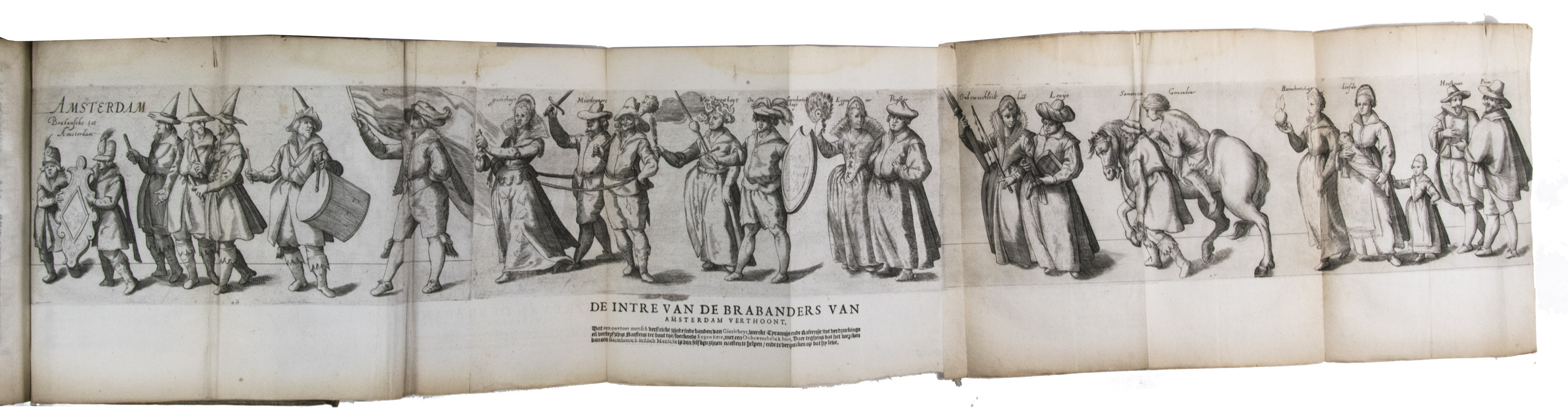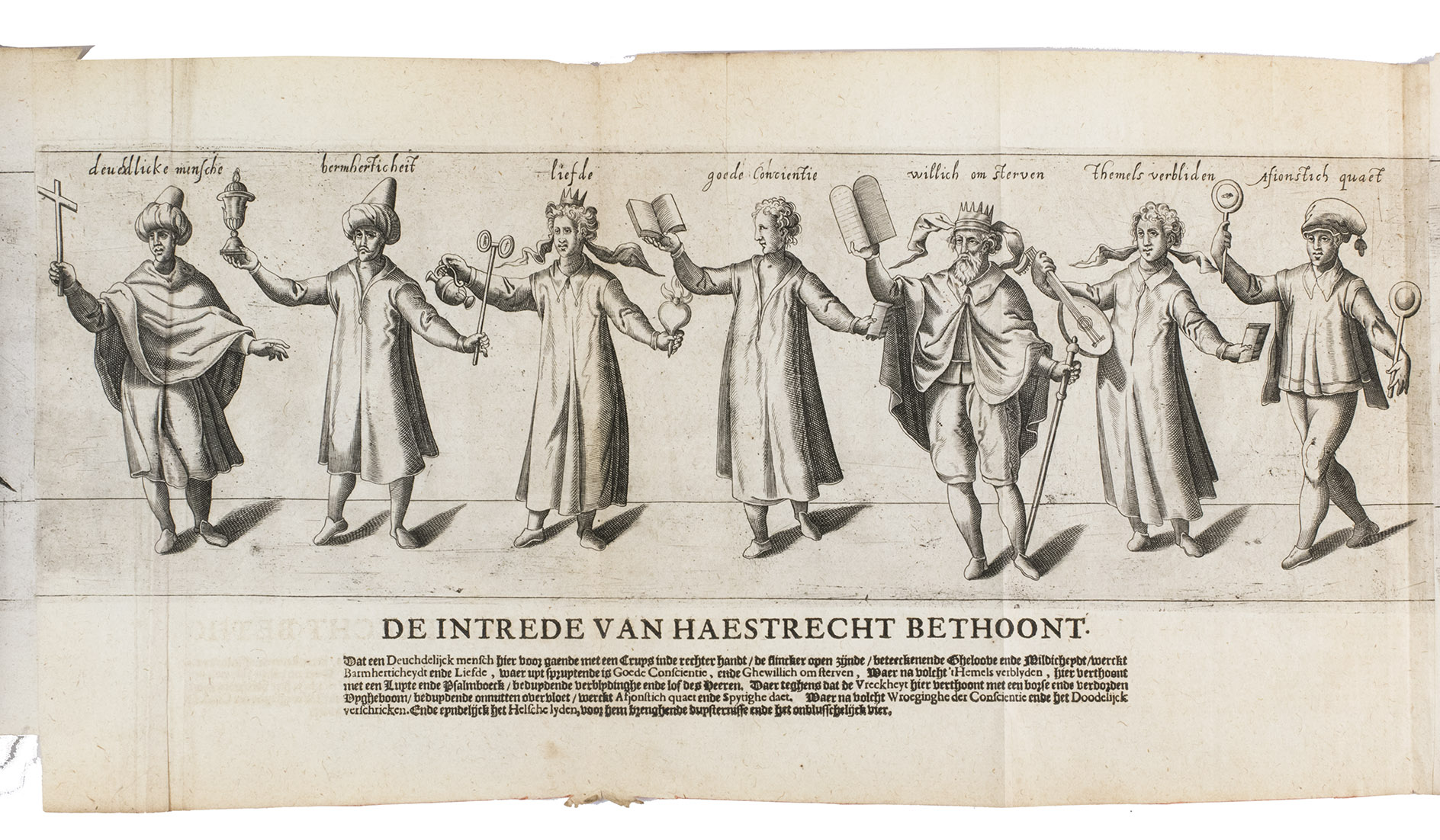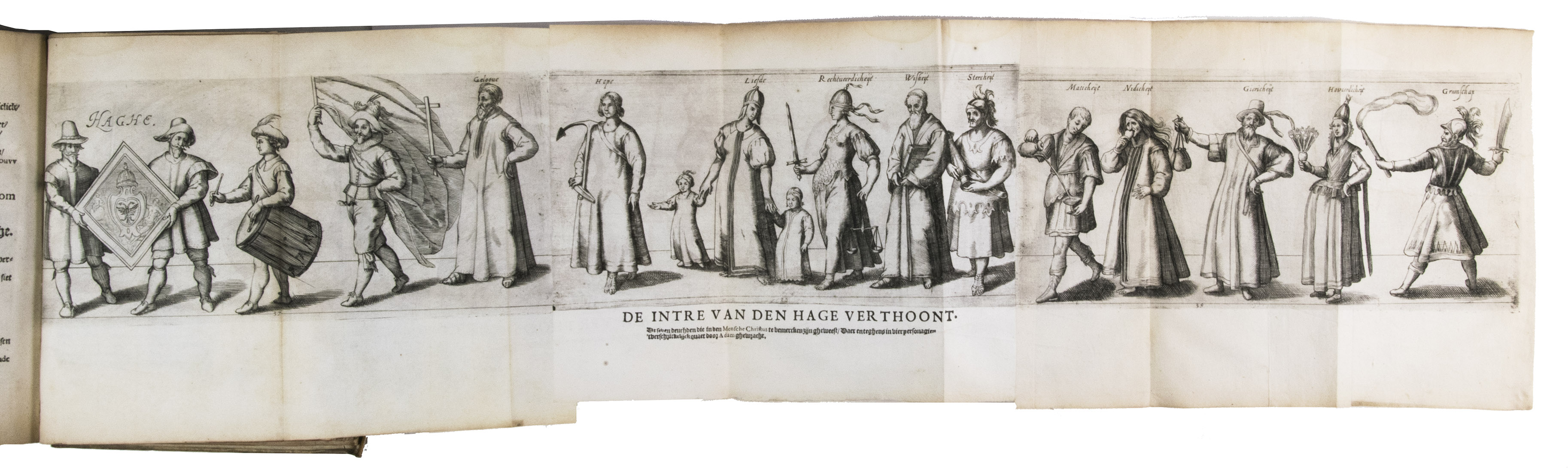 The elaborately designed and decorated emblematic devices are illustrated in the present work in full-page engravings. Each performance started with the festive entree of the chamber of rhetoric that was to perform, followed by a welcome verse by the Haarlem chamber as host, answered again by the performing chamber, which then presented itself to the public with explanatory verses about its device and a lengthy ballad explaining the roles and costumes of its actors. Then followed the main part, the morality play, sometimes in several acts, and finally the closing performance of a long "refereyn" and a song, mostly set to popular tunes. All this is recorded word for word in the present work, including the printed musical for the songs. But of the most spectacular elements and in many respects the elements of greatest importance are the 14 fine engraved large folding oblong entree-plates, mostly printed on 2 or 3 conjoined oblong sheets with a length of 120 to 135 cm, together showing some 300 actors in various roles and costumes, including youngsters. These, but especially the two engraved plates of raised platform stages at the beginning of the book offer interesting parallels to contemporary Shakespearean theatre.