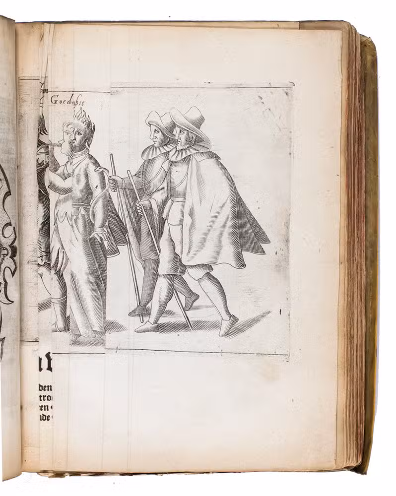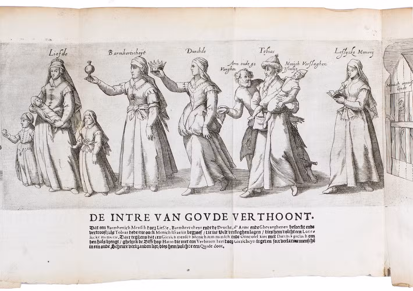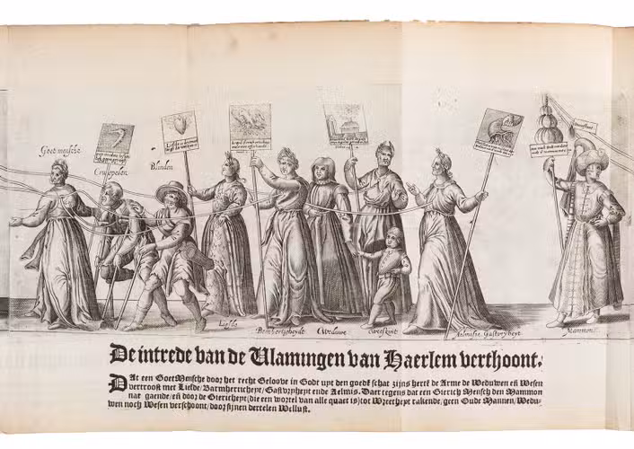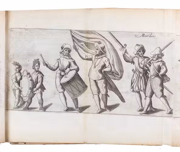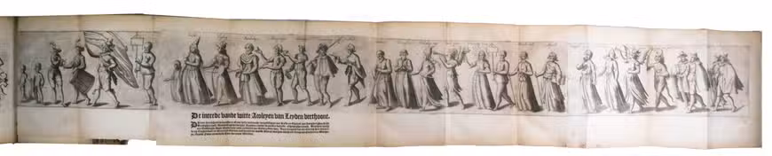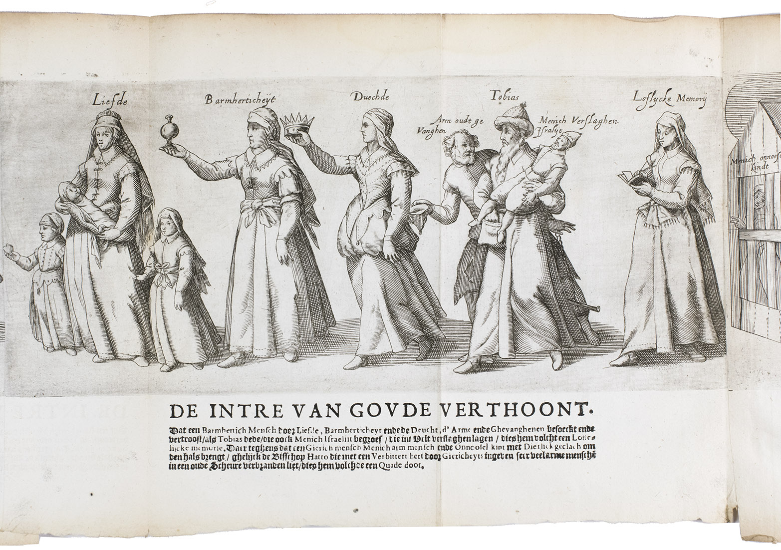 The elaborately designed and decorated emblematic devices are illustrated in the present work in full-page engravings. Each performance started with the festive entree of the chamber of rhetoric that was to perform, followed by a welcome verse by the Haarlem chamber as host, answered again by the performing chamber, which then presented itself to the public with explanatory verses about its device and a lengthy ballad explaining the roles and costumes of its actors. Then followed the main part, the morality play, sometimes in several acts, and finally the closing performance of a long "refereyn" and a song, mostly set to popular tunes. All this is recorded word for word in the present work, including the printed musical for the songs. But of the most spectacular elements and in many respects the elements of greatest importance are the 14 fine engraved large folding oblong entree-plates, mostly printed on 2 or 3 conjoined oblong sheets with a length of 120 to 135 cm, together showing some 300 actors in various roles and costumes, including youngsters. These, but especially the two engraved plates of raised platform stages at the beginning of the book offer interesting parallels to contemporary Shakespearean theatre.