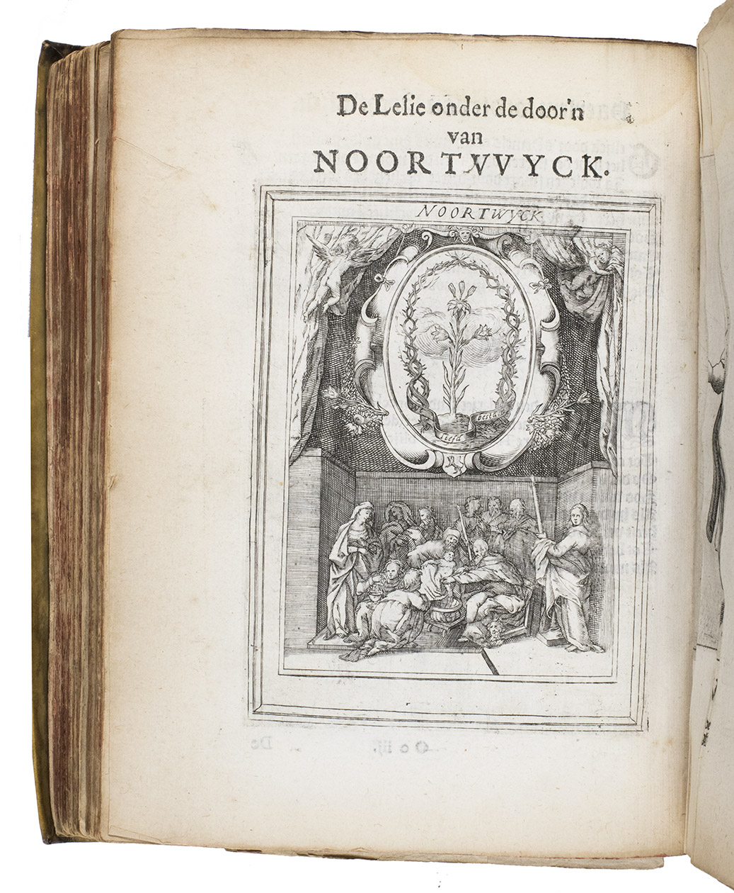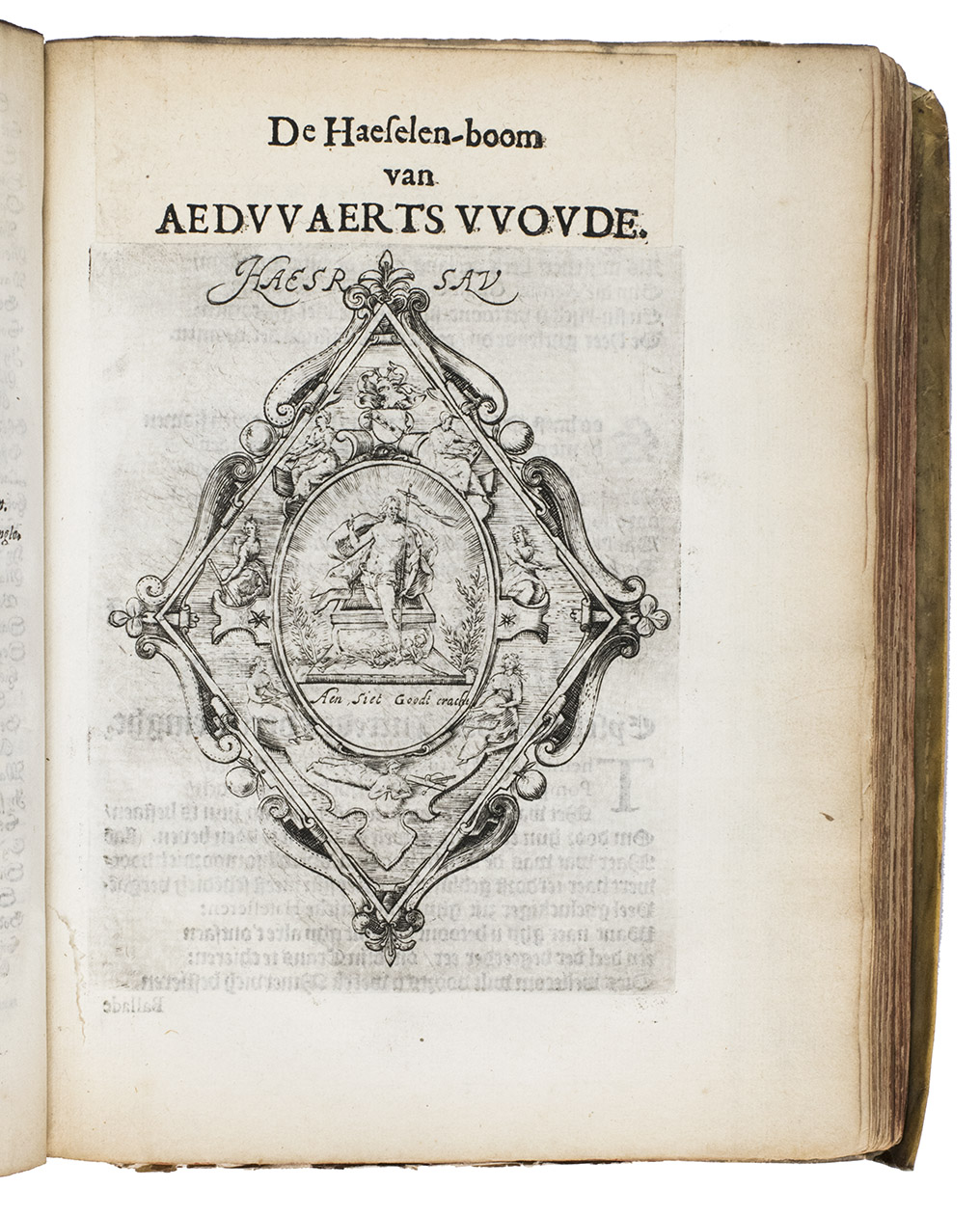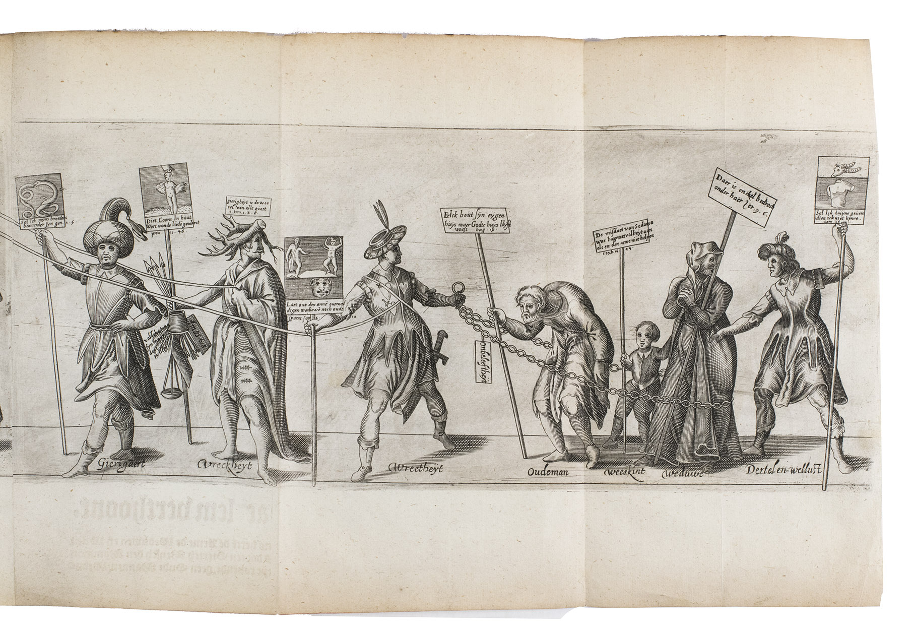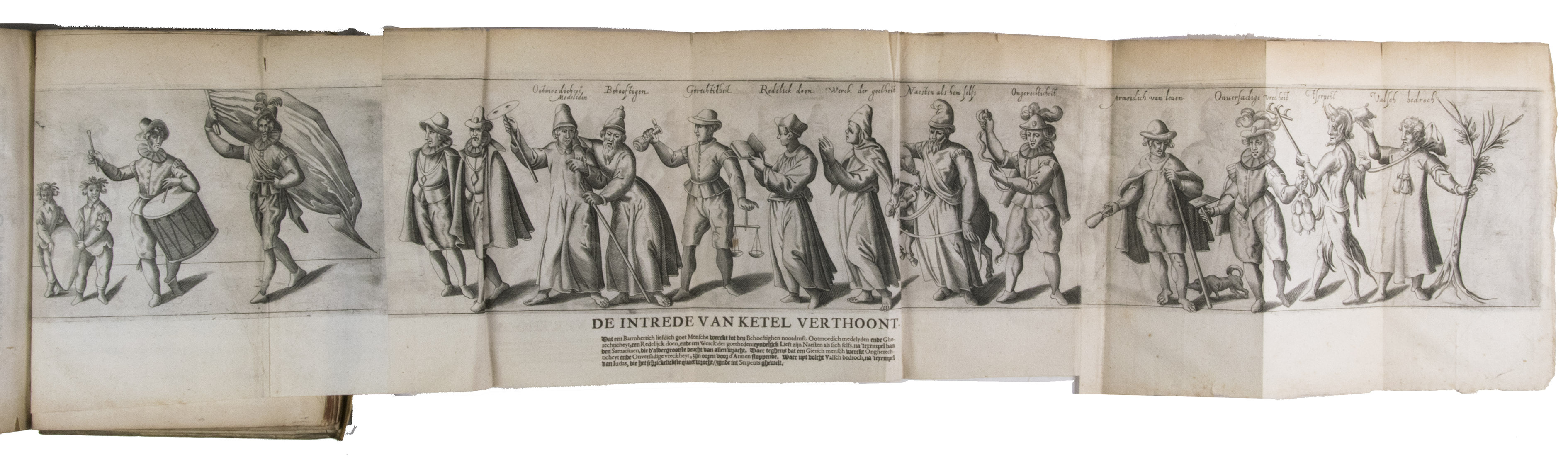 Zwolle, Zacharias Heyns, 1608. With a large engraving on title-page, repeated from the first work, a full-page engraved emblematic device of the Flemish chamber of rhetoric, "Het Wit Angelierken" from Haarlem, and large folding oblong plate on 3 sheets depicting the festive entree of the actors of the Flemish chamber of rhetoric. 4to. 2 works in 1 volume. Contemporary vellum. [266]; 12 ll.