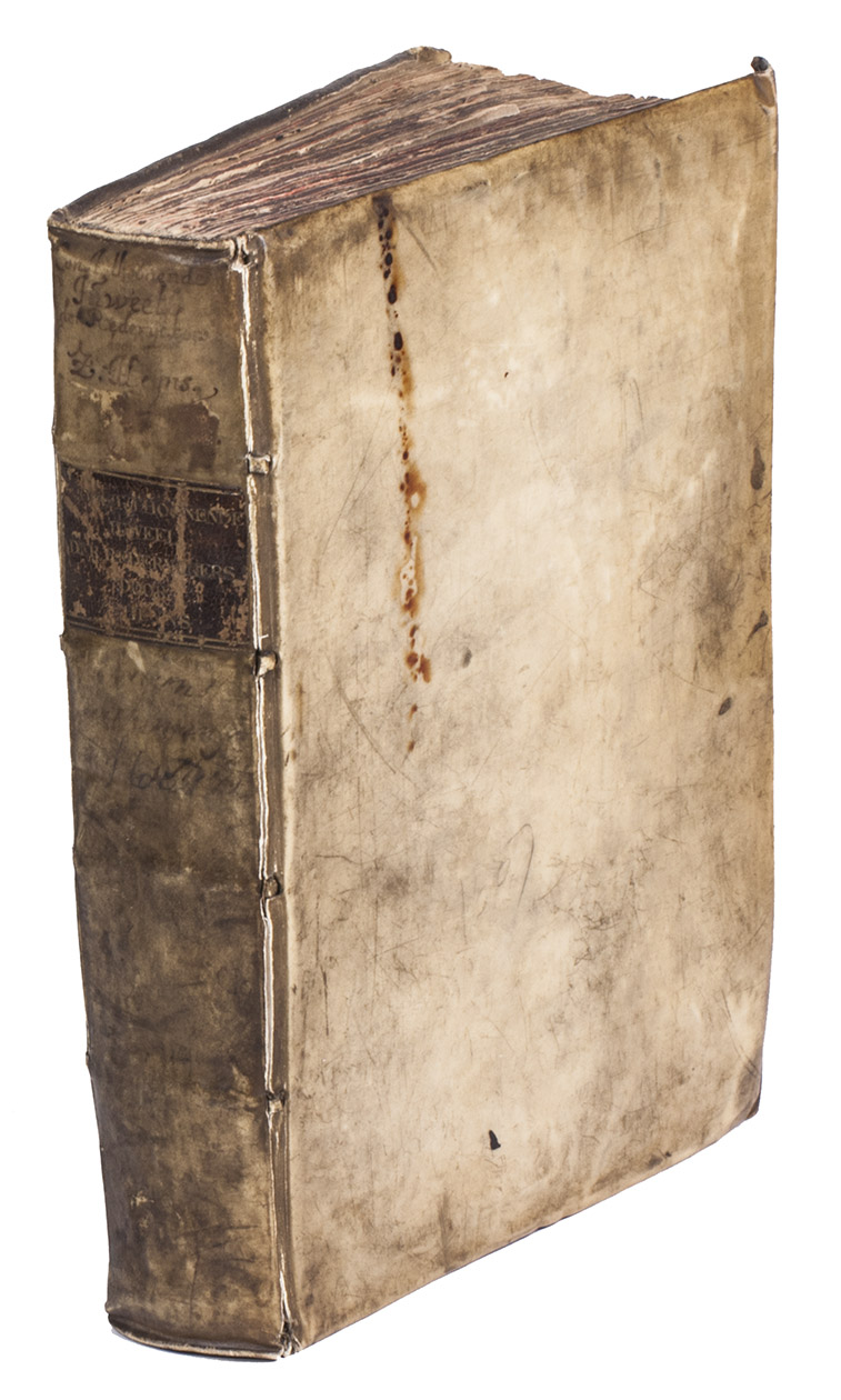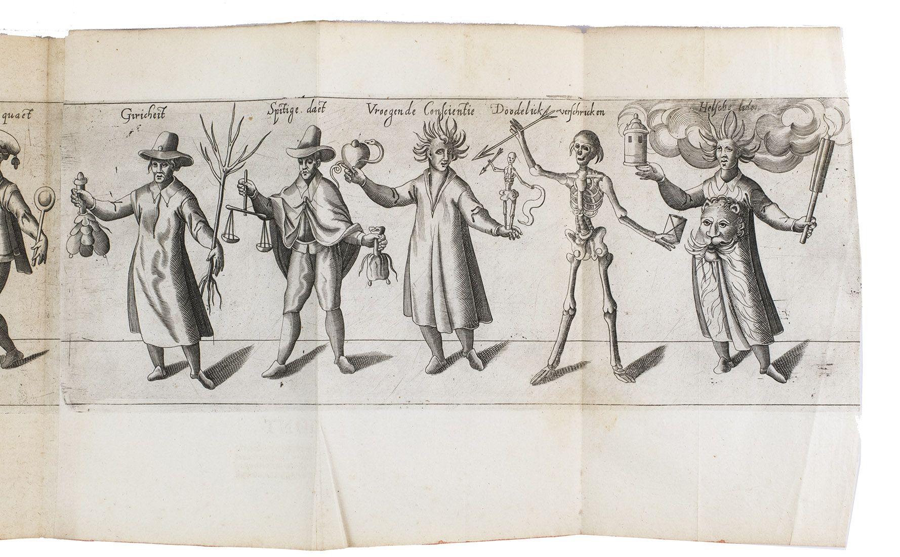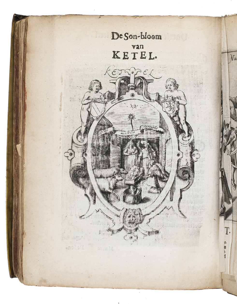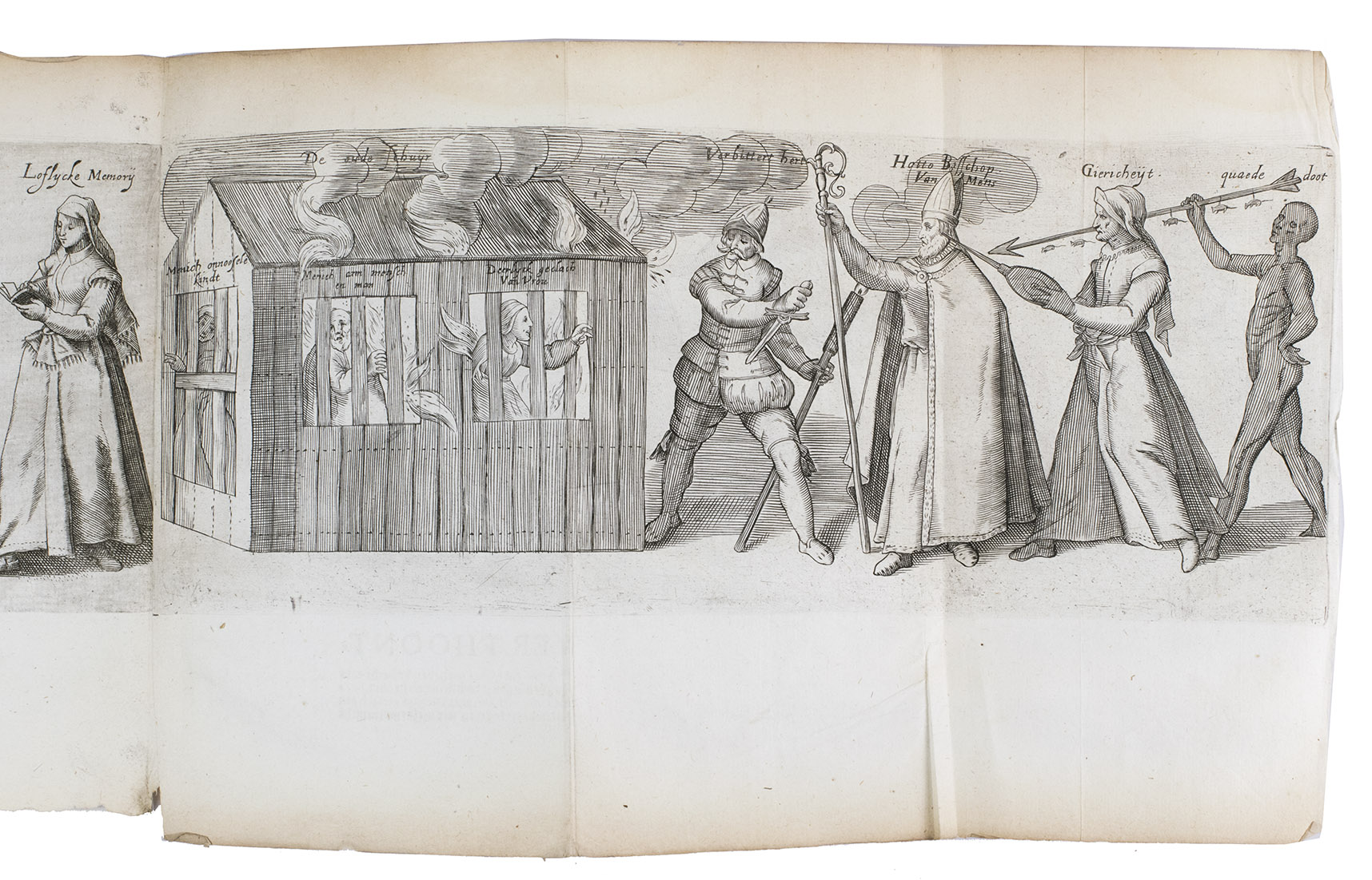 Zwolle, Zacharias Heyns, 1608. With a large engraving on title-page, repeated from the first work, a full-page engraved emblematic device of the Flemish chamber of rhetoric, "Het Wit Angelierken" from Haarlem, and large folding oblong plate on 3 sheets depicting the festive entree of the actors of the Flemish chamber of rhetoric. 4to. 2 works in 1 volume. Contemporary vellum. [266]; 12 ll.