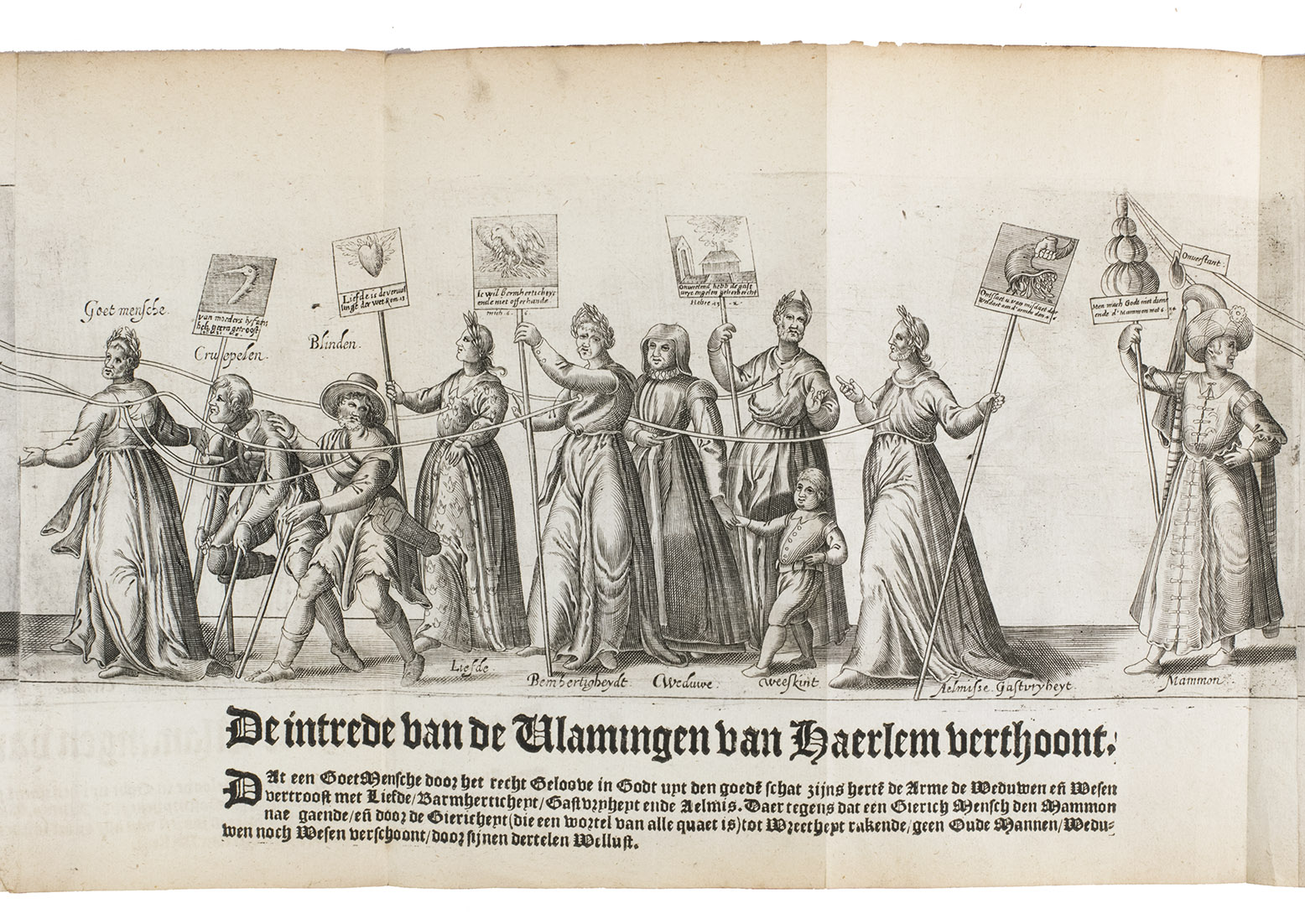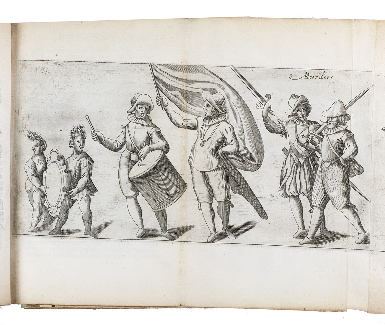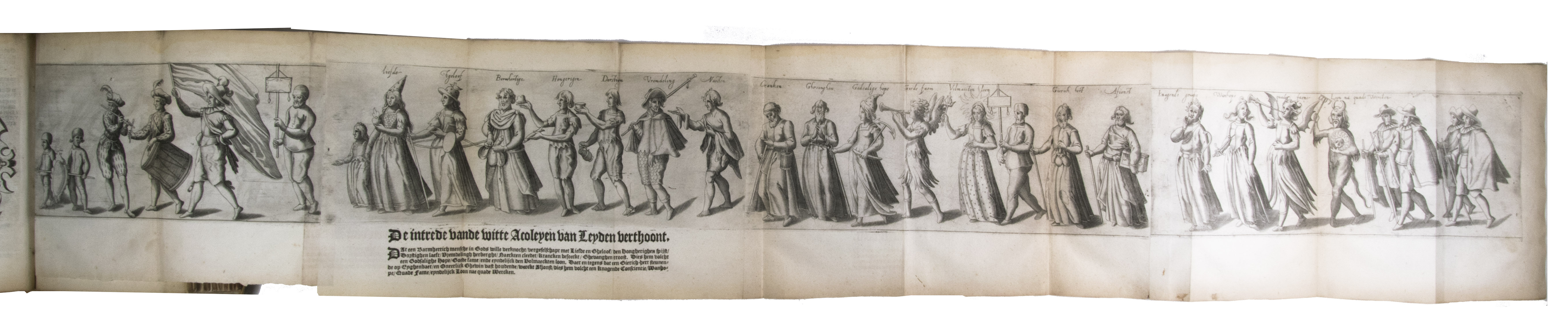 Zwolle, Zacharias Heyns, 1607. With large emblematic device with the coat of arms of Haarlem on title-page, 2 full-page engravings of raised-platform stages, 13 full-page engraved emblematic devices of the chambers of rhetoric (most including 1 or 2 coats of arms), 13 pages of songs with letterpress music notes, and 13 large folding oblong plates on 2 or more sheets depicting the festive entree of each group of actors from the competing chambers of rhetoric.