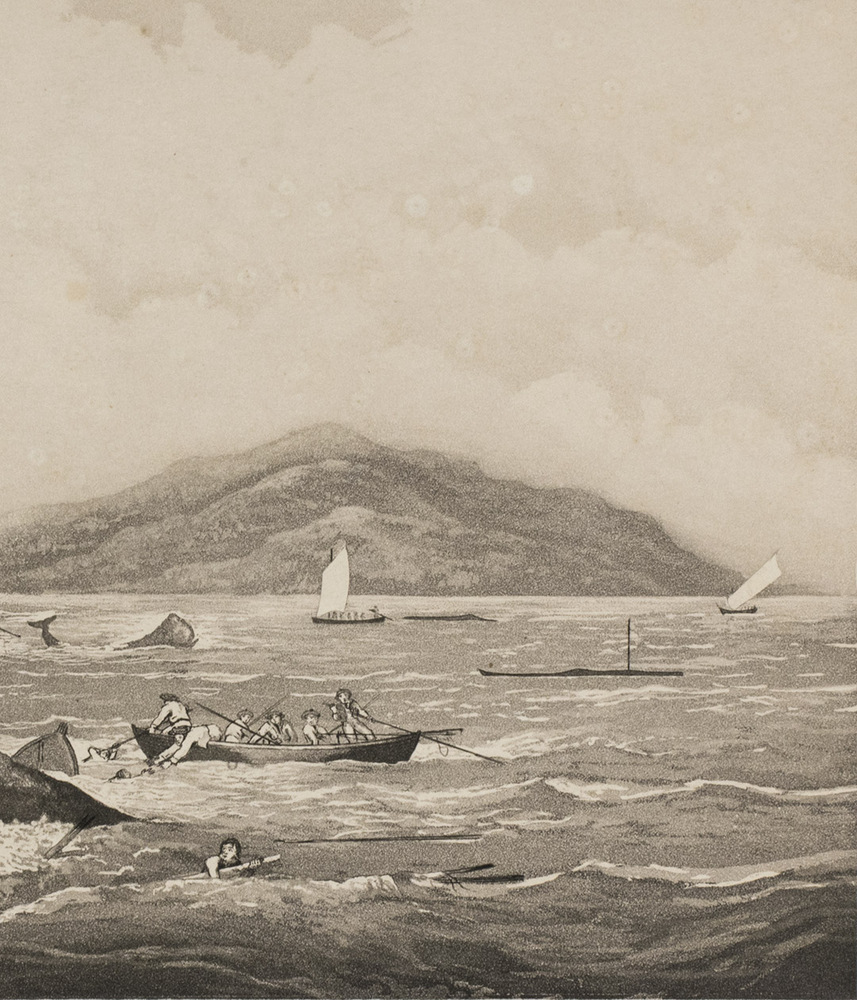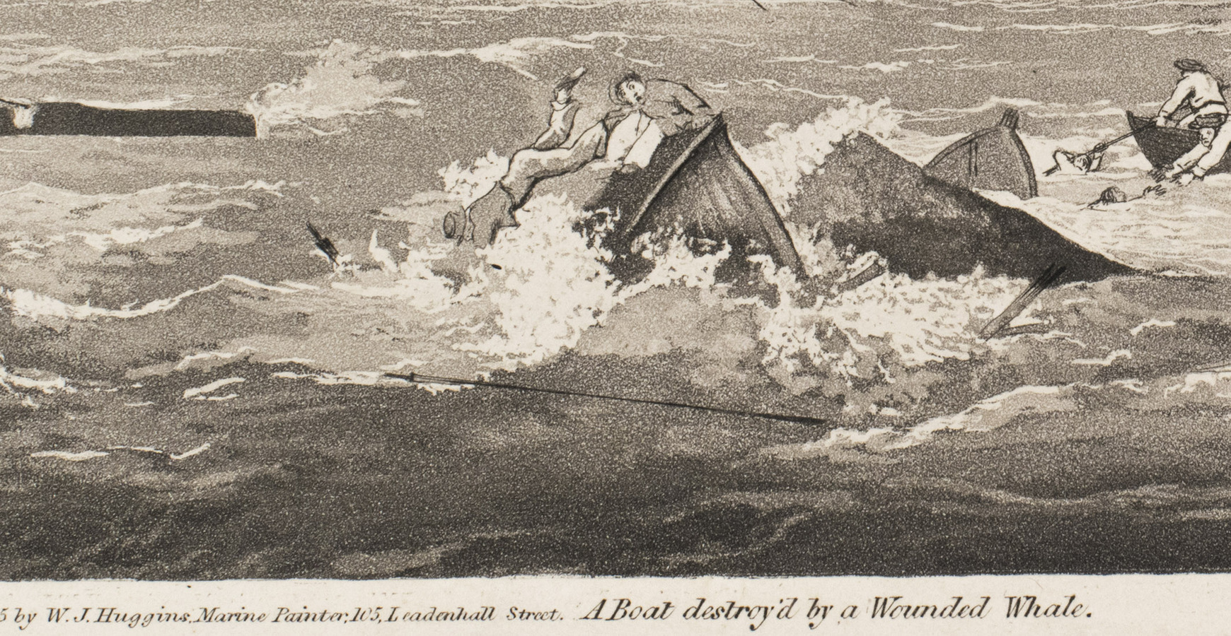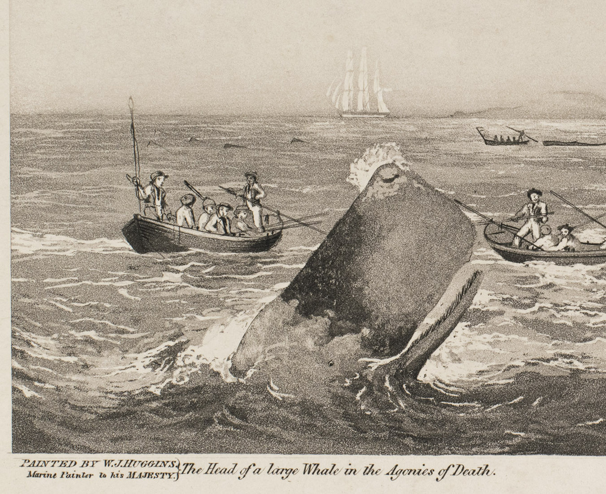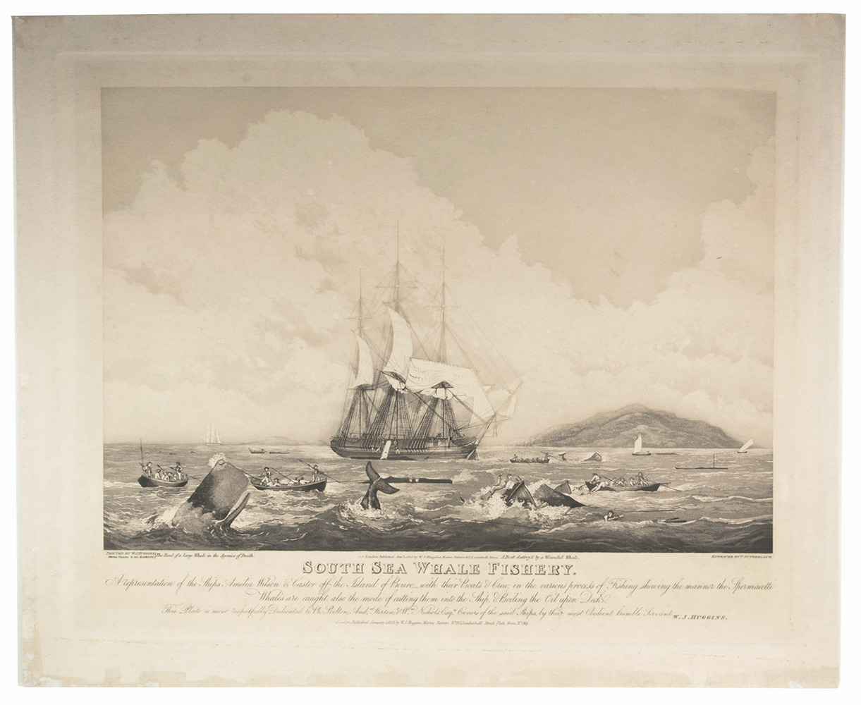 Second issue(?) of a striking aquatint by Thomas Sutherland after a painting by the celebrated marine painter William John Huggins (1781-1845), original a sailor by trade. The spectacular scene shows the British whalers Amelia Wilson and Castor off Buru, Indonesia, with a dying sperm whale smashing a whale boat, crew "cutting in" blubber alongside one of the ships, and several whale boats giving chase.