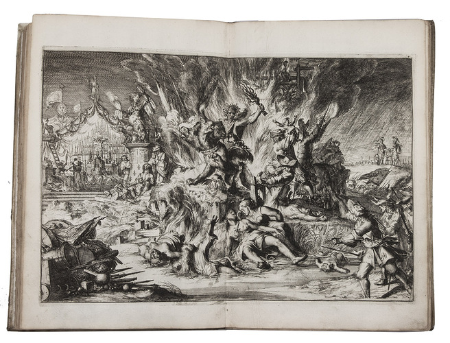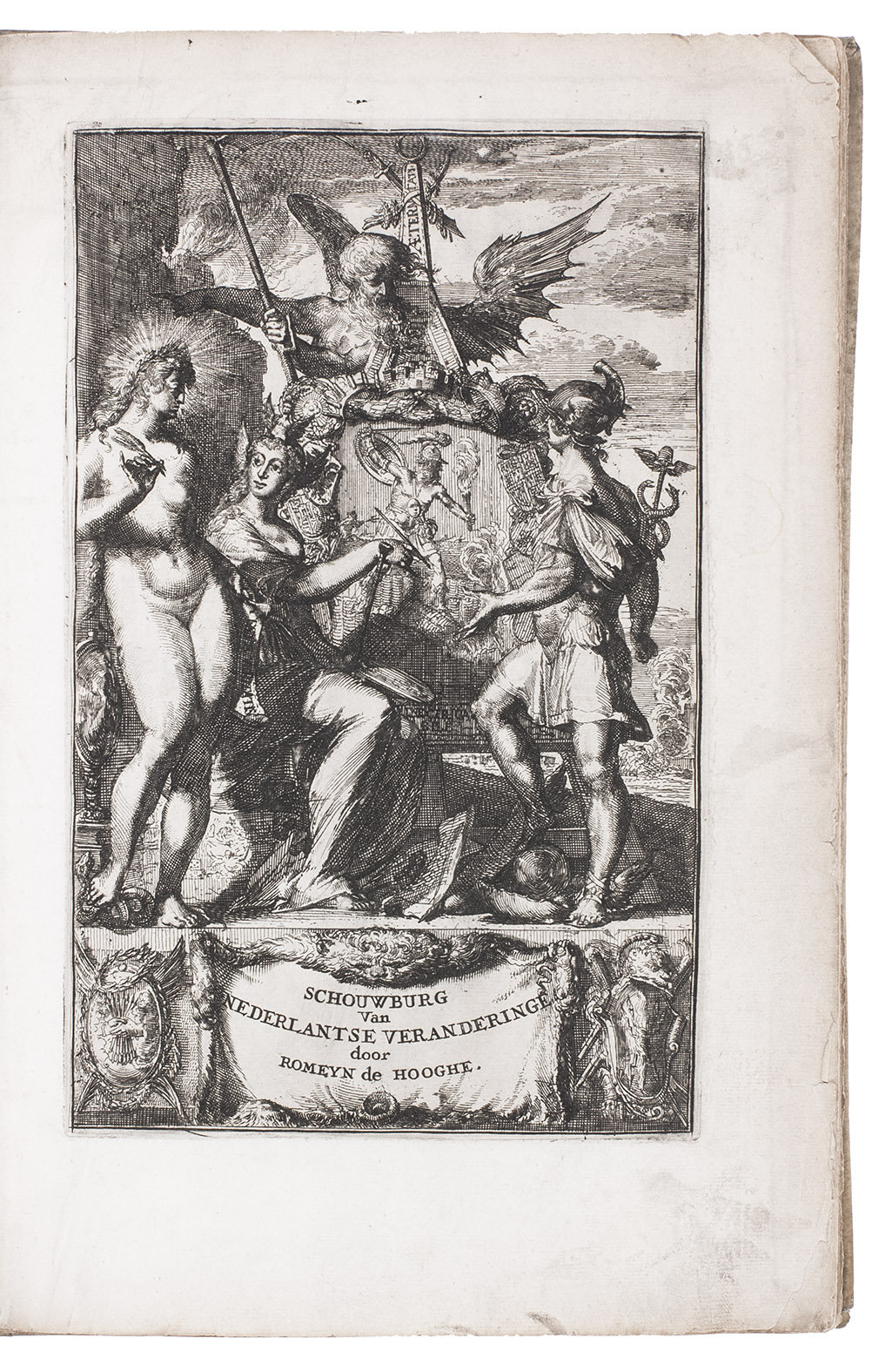 Rare first edition, with fine emblematic plates, illustrating the injustice and cruelty of the war waged by Louis XIV of France against the free and independent Dutch Republic. Romeyn de Hooghe (1645-1708) was unquestionably the most gifted and the most prolific Dutch book illustrator of the second half of the 17th century. His work displays the political grandeur and disasters of war in the Dutch Republic, including the disastrous year 1672, depicted dramatically and with great splendour. The large plates are richly designed and full of intricate emblems and allegories, fully explained in the accompanying text; an emblematic poem is added to each plate.