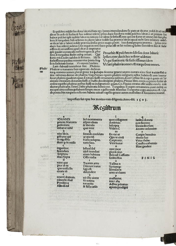 Superb Humanist "Sammelband" with the collected works of three classical authors, in a fine contemporary Strasbourg binding. The first work consists of the fifth-century pseudo-Acron scholia and the commentaries by the third-century scholar Porphyrion, and by two 15th-century humanists, Christophoro Landino and Antonio Mancinelli. The Persius appears here for the first time with the notes by three 15th-century Italians, Giovanni Britannico, Bartelomeo Fonti, and Giovanni Bonardi. The present Reggio Emilia imprint of the Juvenal is the second edition of Britannico's commentary, and is so rare that it was unknown to Schweiger.