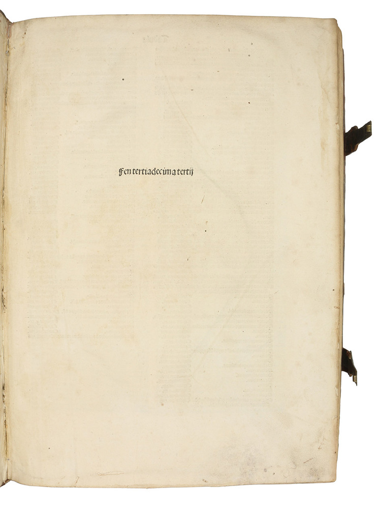 Volumes 2 (book III, fens 1-12) and 3 (book III, fens 13-22), without volumes 1 (book I: 452 ll.) and 4 (book IV, fen 1: 142 ll.).Both volumes lack the final blank leaf, but are otherwise complete and nearly untrimmed, giving ample margins and preserving an occasional deckle. Some light browning and marginal water stains (mainly towards end of vol. 2), some mostly marginal worming, but still in good condition. An important edition of one of the greatest work of Islamic medicine, nicely bound in contemporary blind- and gold-tooled calf over wooden boards. BMC VIII, p. 302; BSB-Ink A 964; Claudin IV, 88-93; Corr. Pell. 1668; Goff A1428; GW 3127; IGI 1125 u; ISTC ia01428000; Klebs 131.13; Proctor 8616; not in Oates; Osler; Wellcome.