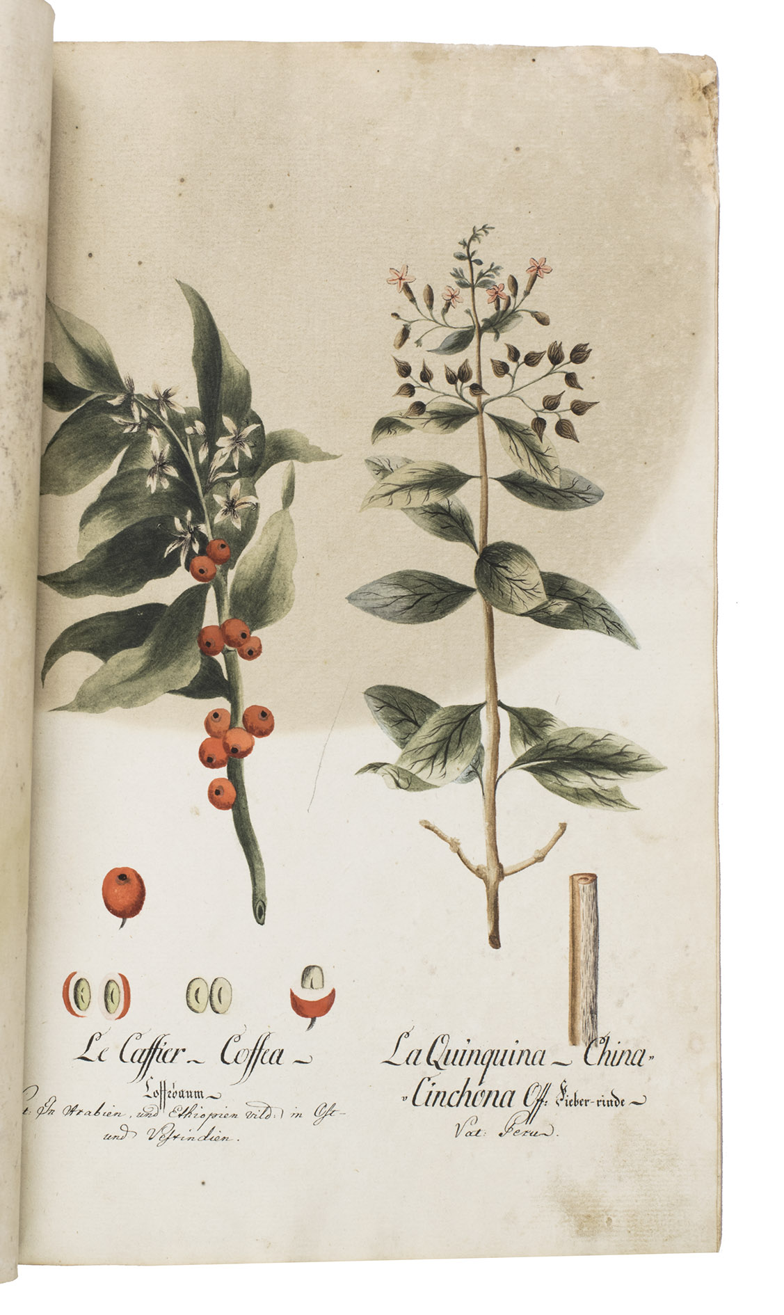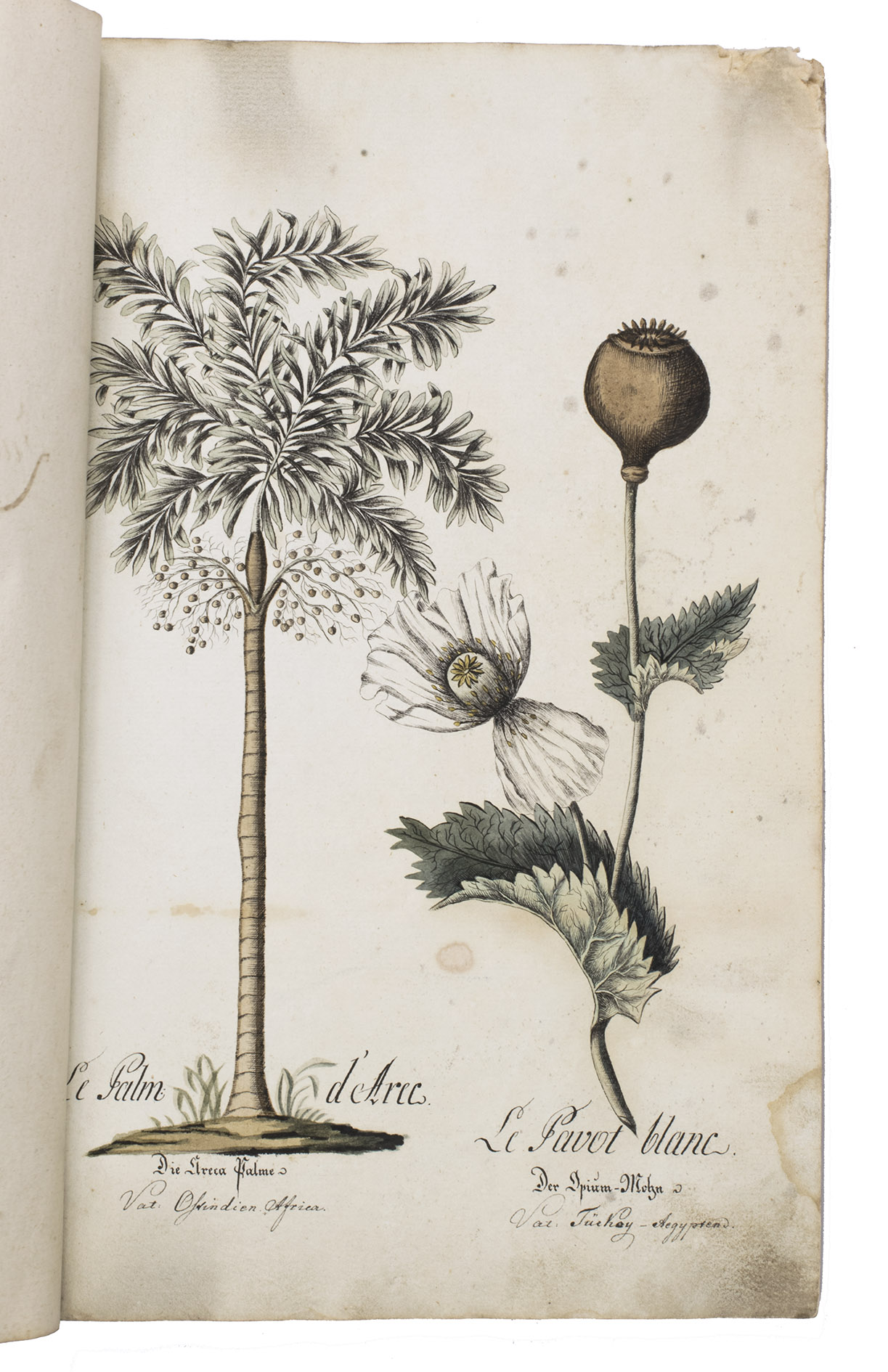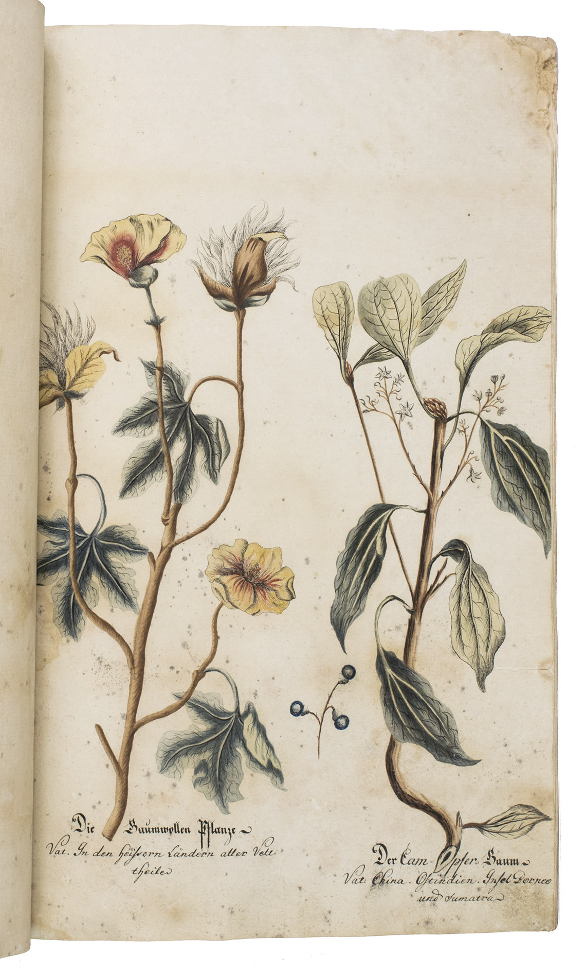 Collection of high quality drawings of plants and trees by the physician Adam Johann Ingruber, who graduated from the faculty of Medicine of the University of Pest in 1803. The 18 leaves of drawings mostly show two species of plants or trees (each with captions in French, Latin and German at the foot), the last two show silkworms, bees, a rattlesnake and a scorpion. Most species are from Asia, South America, Africa and the southern part of Europe.