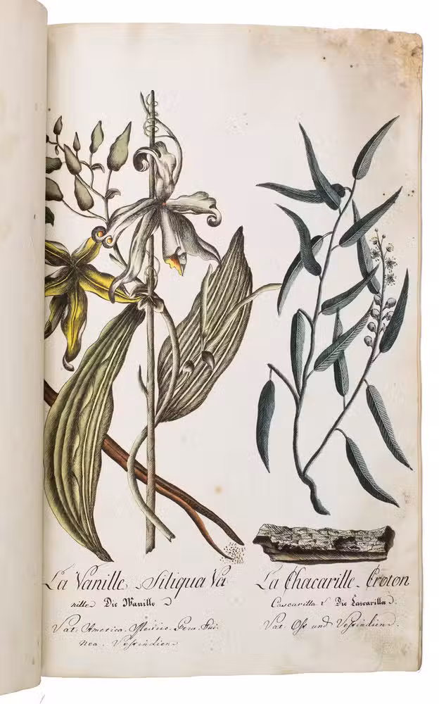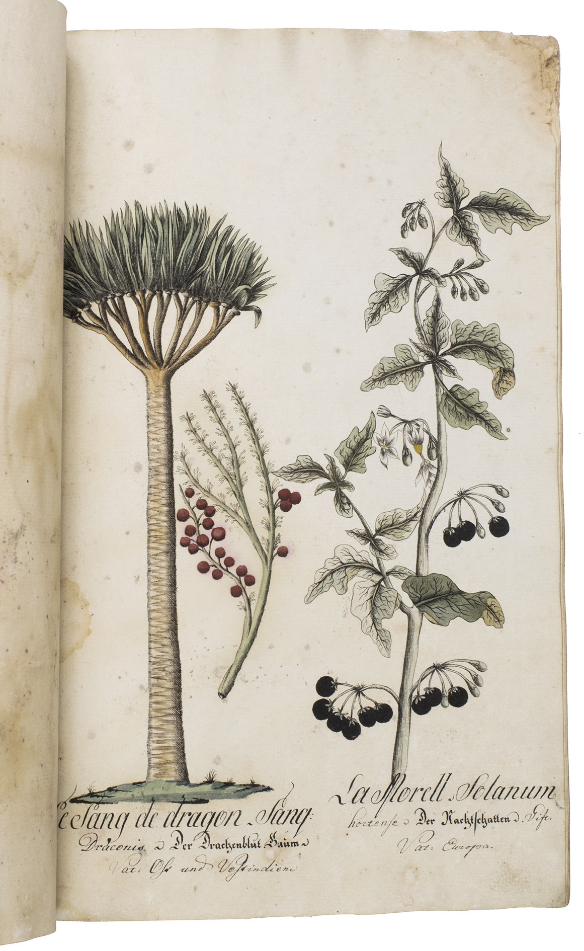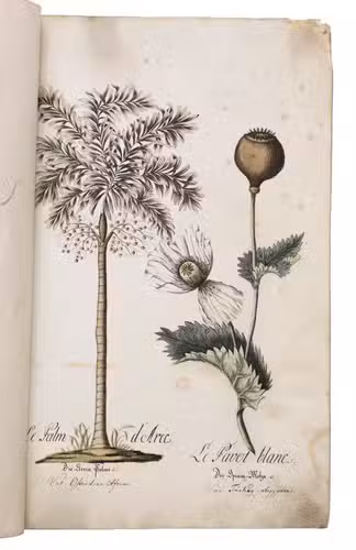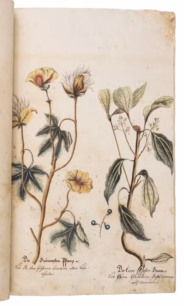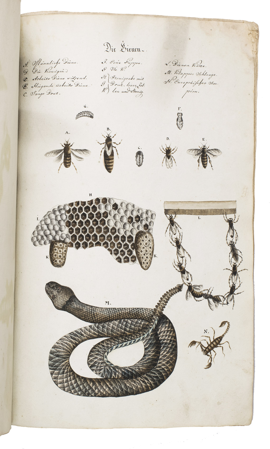 Collection of high quality drawings of plants and trees by the physician Adam Johann Ingruber, who graduated from the faculty of Medicine of the University of Pest in 1803. The 18 leaves of drawings mostly show two species of plants or trees (each with captions in French, Latin and German at the foot), the last two show silkworms, bees, a rattlesnake and a scorpion. Most species are from Asia, South America, Africa and the southern part of Europe.