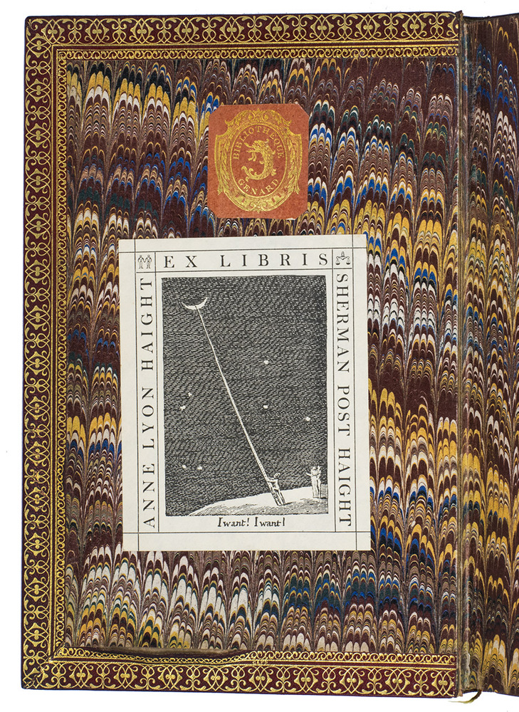 Capé apparently bound the book for himself, for it was auctioned with his library in 1868, the catalogue noting the 57 woodcuts and describing the binding as "mar[oquin]. r[ouge]. jansén[iste]. tr[anches]. dor[ées]. (Capé)", a Jansenist binding being a high quality binding that shuns external decoration. The later bookplate of the bibliophile couple Anne (Pardee) Lyon Haight (1891-1977) and Sherman Post Haight (1889-1980).
