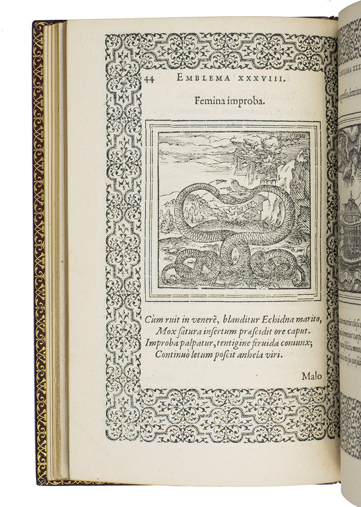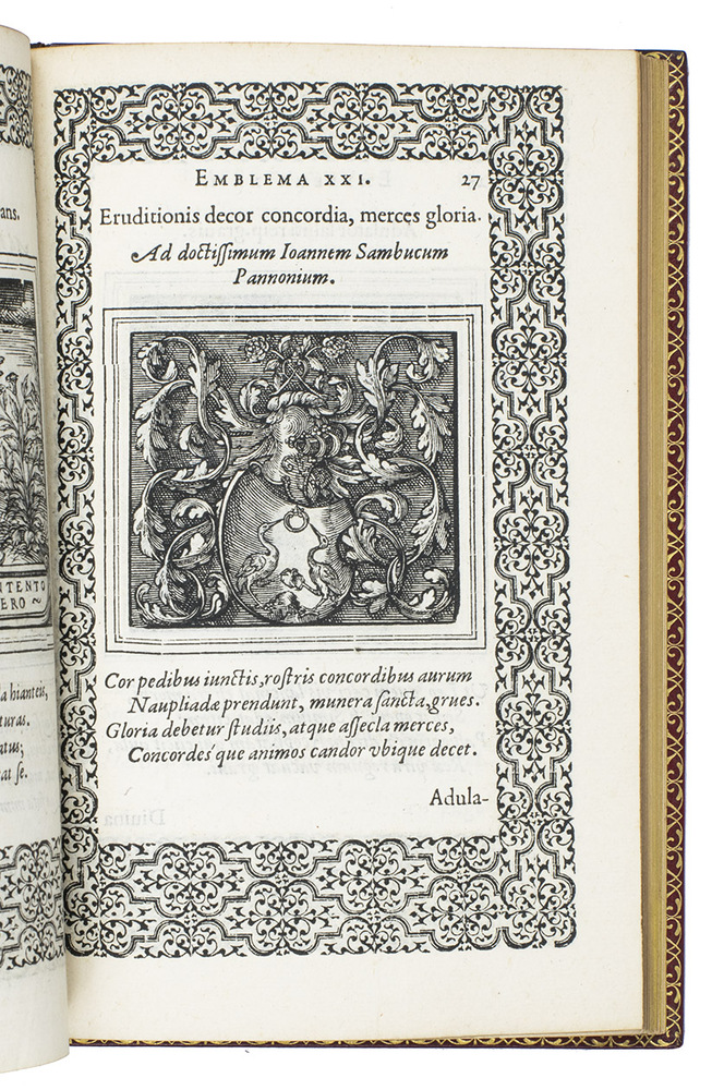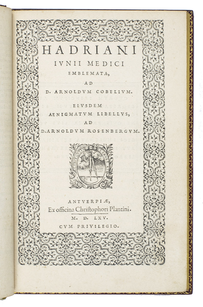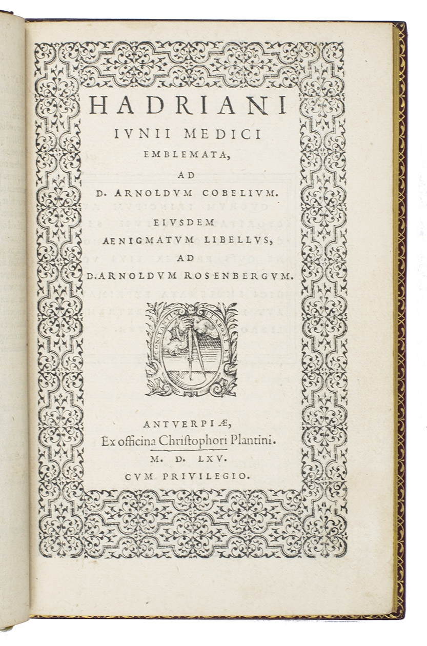 First edition of the Emblemata by Hadrianus Junius (1511-1575), a Dutch physician who took his doctorate in Bologna. He is best known as a prolific classical scholar, translator, lexicographer, antiquarian, historiographer, school rector, Latin poet and "one of the most creative and influential sixteenth-century pioneers of neo-Latin emblematics. His emblem book of 1565 (Emblemata) is a true masterpiece, with regard to both form and content: the epigrams themselves, their woodcut illustrations, and the harmonious layout of the booklet as a whole. ... a master of Latin verse, ... ingenious inventio, ... In marked difference with the early editions of Andrea Alciatos ... Juniuss picturae were made by very skilful craftsmen" (Enenkel, who devotes an entire chapter to this book and calls the variety of Juniuss metres "a most spectacular artistic achievement").
