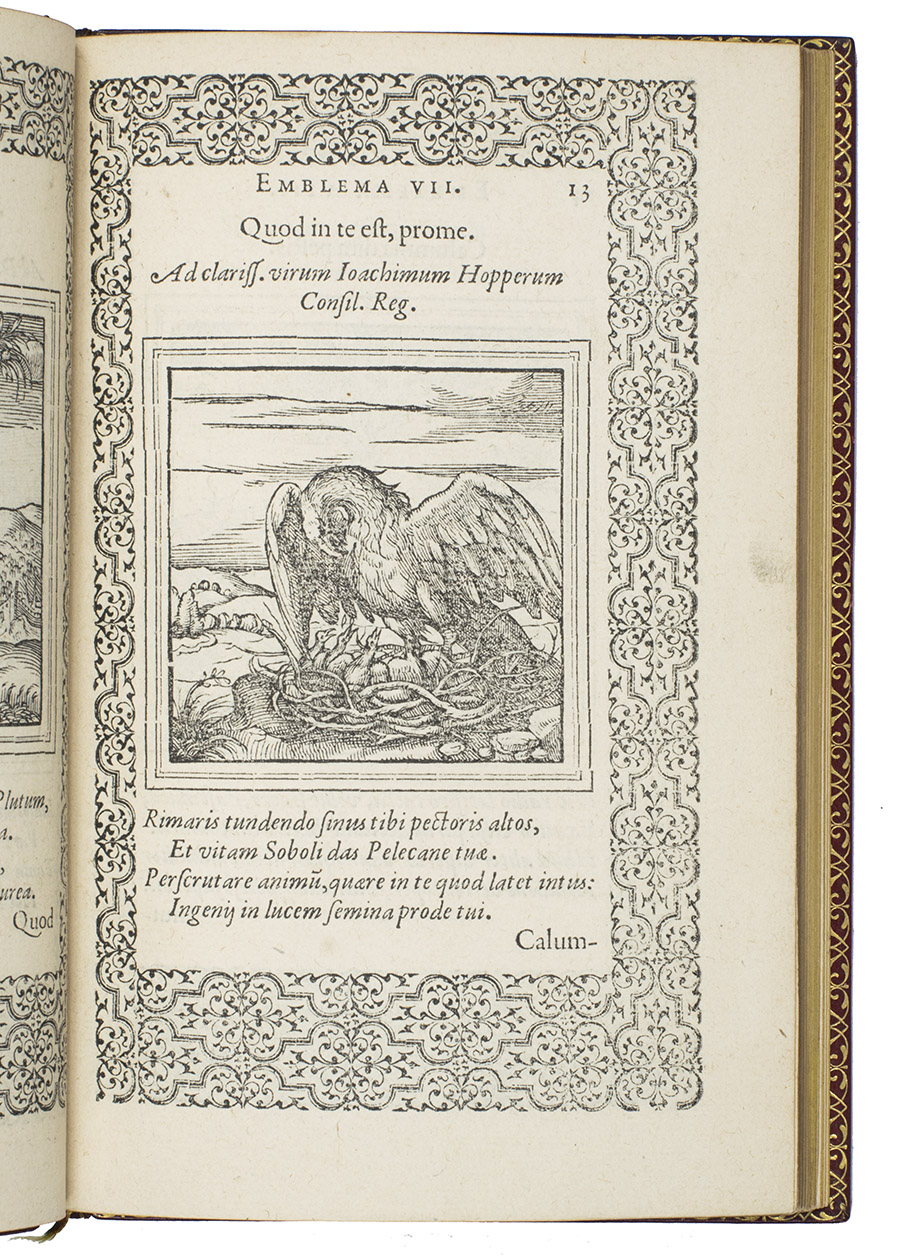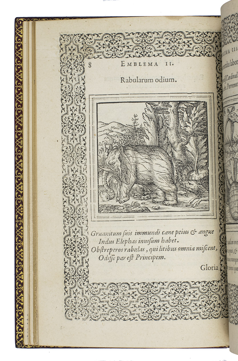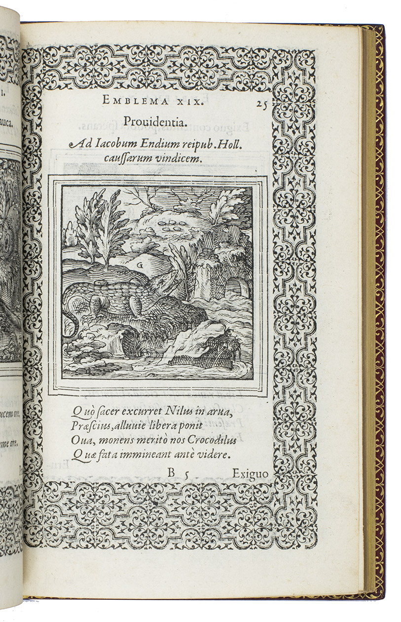 First edition of the Emblemata by Hadrianus Junius (1511-1575), a Dutch physician who took his doctorate in Bologna. He is best known as a prolific classical scholar, translator, lexicographer, antiquarian, historiographer, school rector, Latin poet and "one of the most creative and influential sixteenth-century pioneers of neo-Latin emblematics. His emblem book of 1565 (Emblemata) is a true masterpiece, with regard to both form and content: the epigrams themselves, their woodcut illustrations, and the harmonious layout of the booklet as a whole. ... a master of Latin verse, ... ingenious inventio, ... In marked difference with the early editions of Andrea Alciatos ... Juniuss picturae were made by very skilful craftsmen" (Enenkel, who devotes an entire chapter to this book and calls the variety of Juniuss metres "a most spectacular artistic achievement").