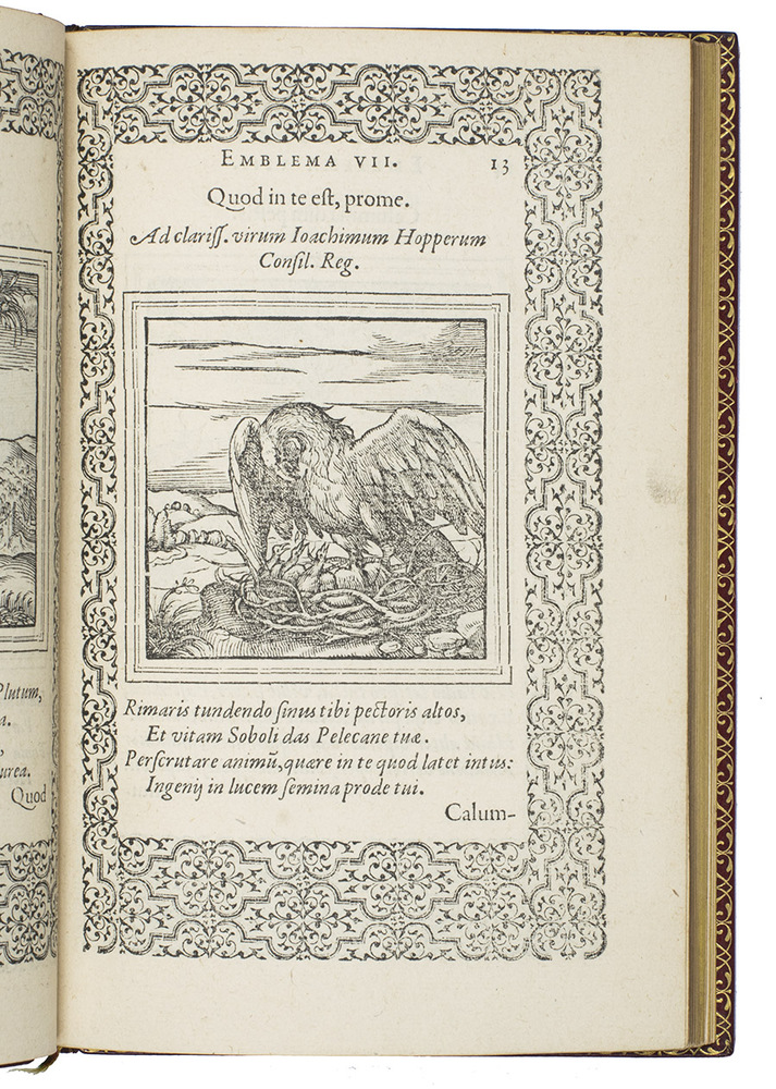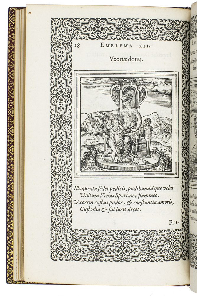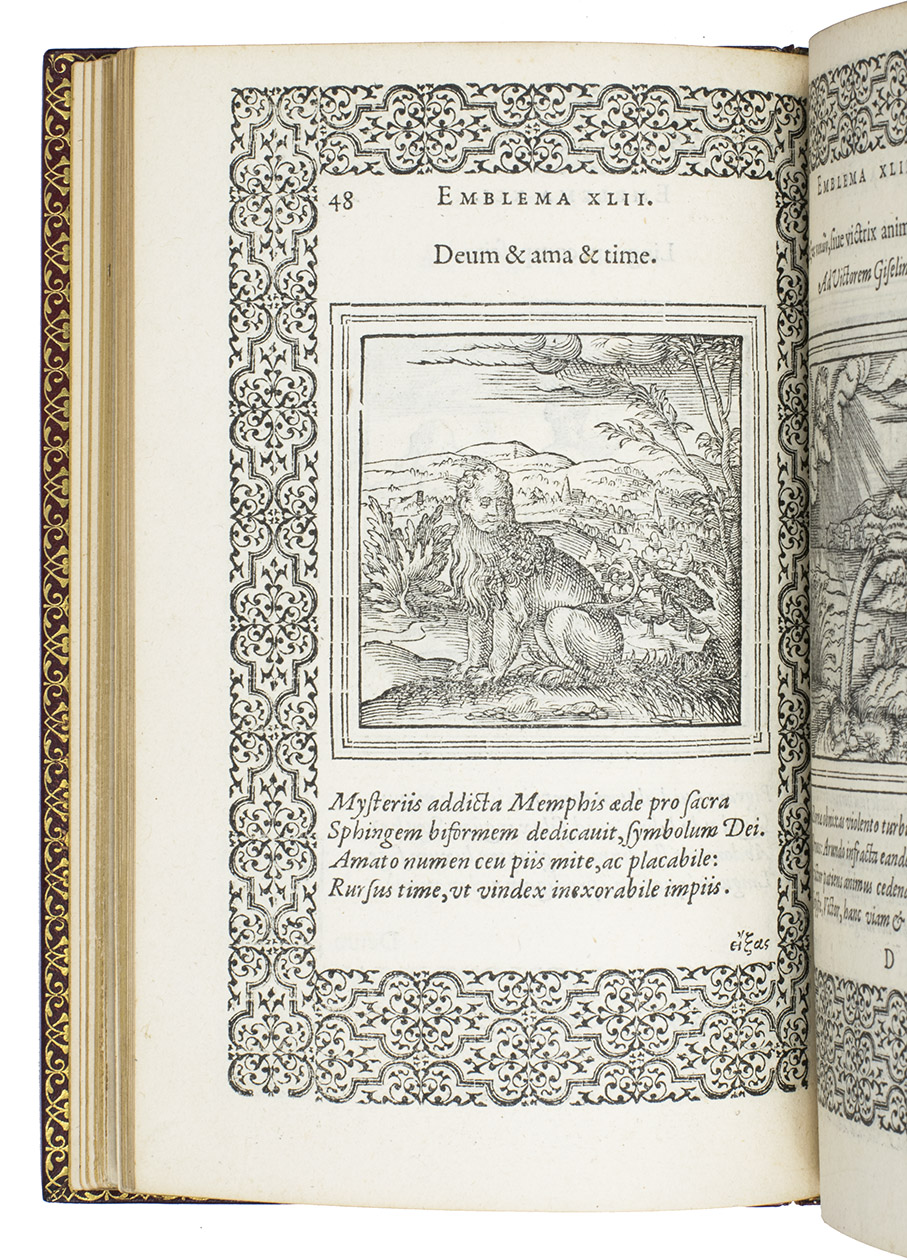 Antwerp, Christoffel Plantin, 1565 (colophon: 15 May 1565). 2 works in 1 volume. Small 8vo (17 x 11.5 cm). With 57 woodcut emblems, mainly by Gerard Janssen van Kampen with a few by Arnold Nicolai, all after Geoffroy Ballain and Pierre Huys. Red goatskin morocco (ca. 1850/60?) by Charles-François Capé in Paris, signed "CAPÉ" in the foot of the front turn-in. [15], [1 blank]; 149, [3] pp.