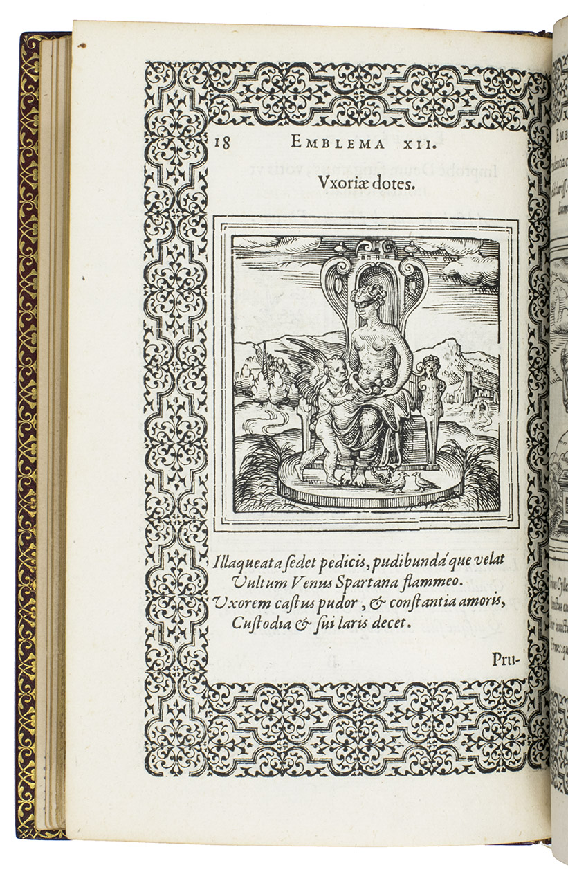 Though rebound ca. 1850/60, only about 4 mm has been trimmed from the fore-edge and perhaps a bit more at the head. With the paper very slightly browned and one or two minor marginal spots, but otherwise internally in very good condition. The lower outside corner of the binding is slightly damaged (with a 1 x 2 cm scuff on the front and a smaller one on the back) and the edge of the turn-in has lifted in one place (4 cm along the foot of the front marbled pastedown), but otherwise in good condition, with only some tiny scuff marks around the extremities. Belg. Typ. 1662; Karl Enenkel, The invention of the emblem book ... (2019), pp. 264-309; Landwehr, Emblem books Low Countries (1988), 399; Laurent Potier, Cat. ... bibliotheque de feu M. Capé ancien relieur, 27 January 1868, lot 639 (this copy); Praz, pp. 37-38, 384-385; Max Rooses, intr. to the reprint from the original woodblocks in the series "Editions du Musée Plantin-Moretus" (1901); STCV 12919775 (5 copies); USTC 401197 (8 copies); Vinet 847; Voet, Plantin press 1476-1477; J. de Winter, Brussels, auction, 27 March & 3 April 1924, lot 83 (this copy), reported in De Gulden Passer, 2 (1924), p. 77, with the price; for the binder: Fléty, p. 38; Ramsden, French bookbinders, pp. 46-47; histoire-bibliophilie.blogspot.com/2013/04/charles-cape-le-bozerian-du-second.html; for Auguste Génard: Petite revue des bibliophiles dauphinois, vol. 1, (no. 5, July 1907), p. 159, note 2; www.bibliotheque-dauphinoise.com/catalogue_genard.html.