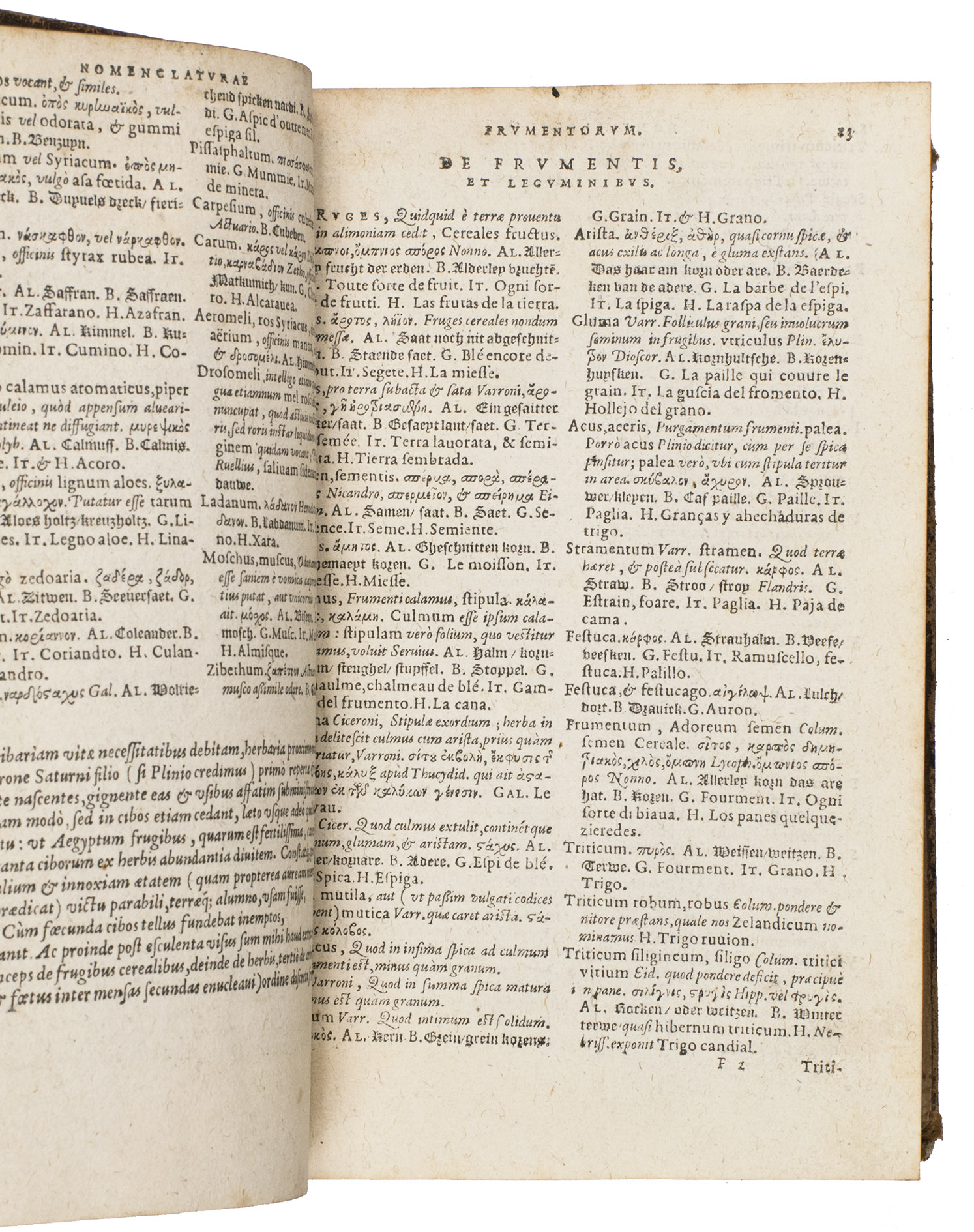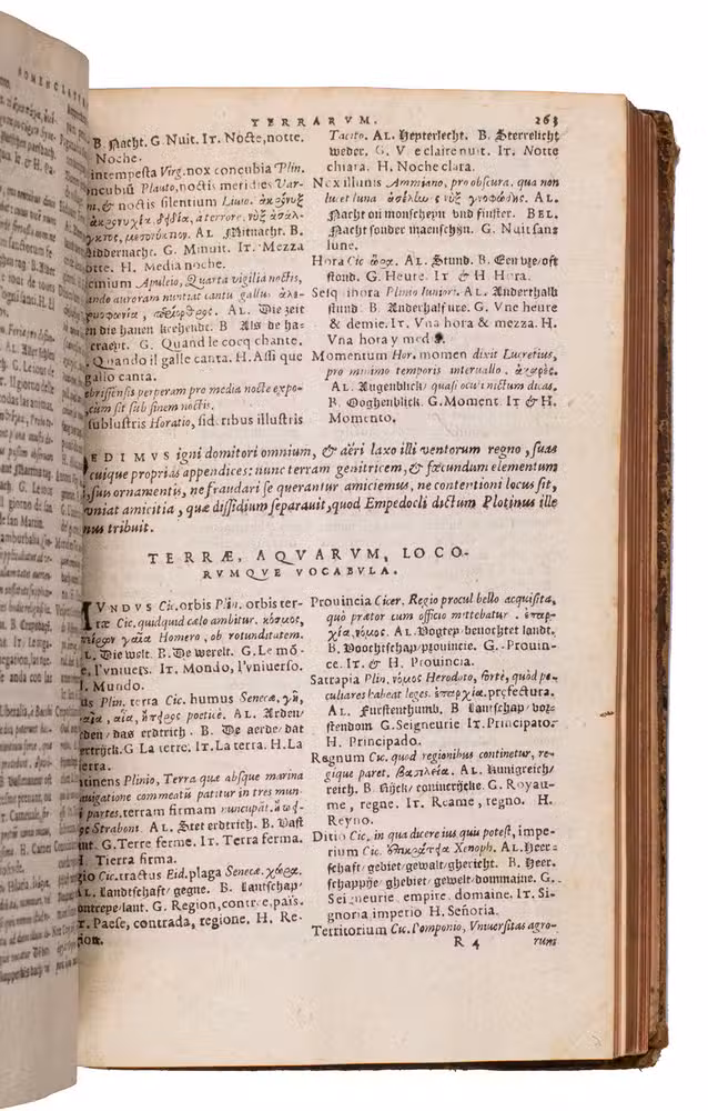 The Nomenclator was widely used in schools for centuries and strongly influenced later lexicographers such as Cornelis Kiliaen (1528-1607). Printed in various types and arranged in two columns, with the index in three, the dictionary represents a landmark in Renaissance lexicography and polyglot scholarship.