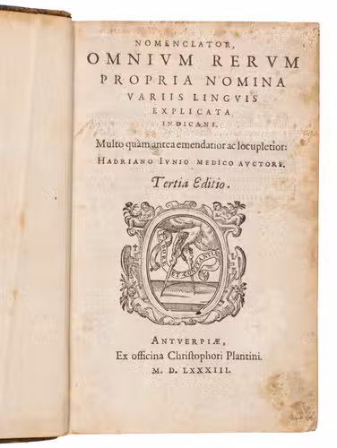 Third Plantin edition of Nomenclator, the highly influential dictionary by the Dutch physician and humanist Hadrianus Junius (1511-1575). The present work is a line-for-line reprint of the corrected and expanded second edition of 1577. The work was originally published in 1567 by Plantin in Antwerp and became one of the most popular Latin-Dutch vocabularies of the 16th-, 17th-, and 18th century.