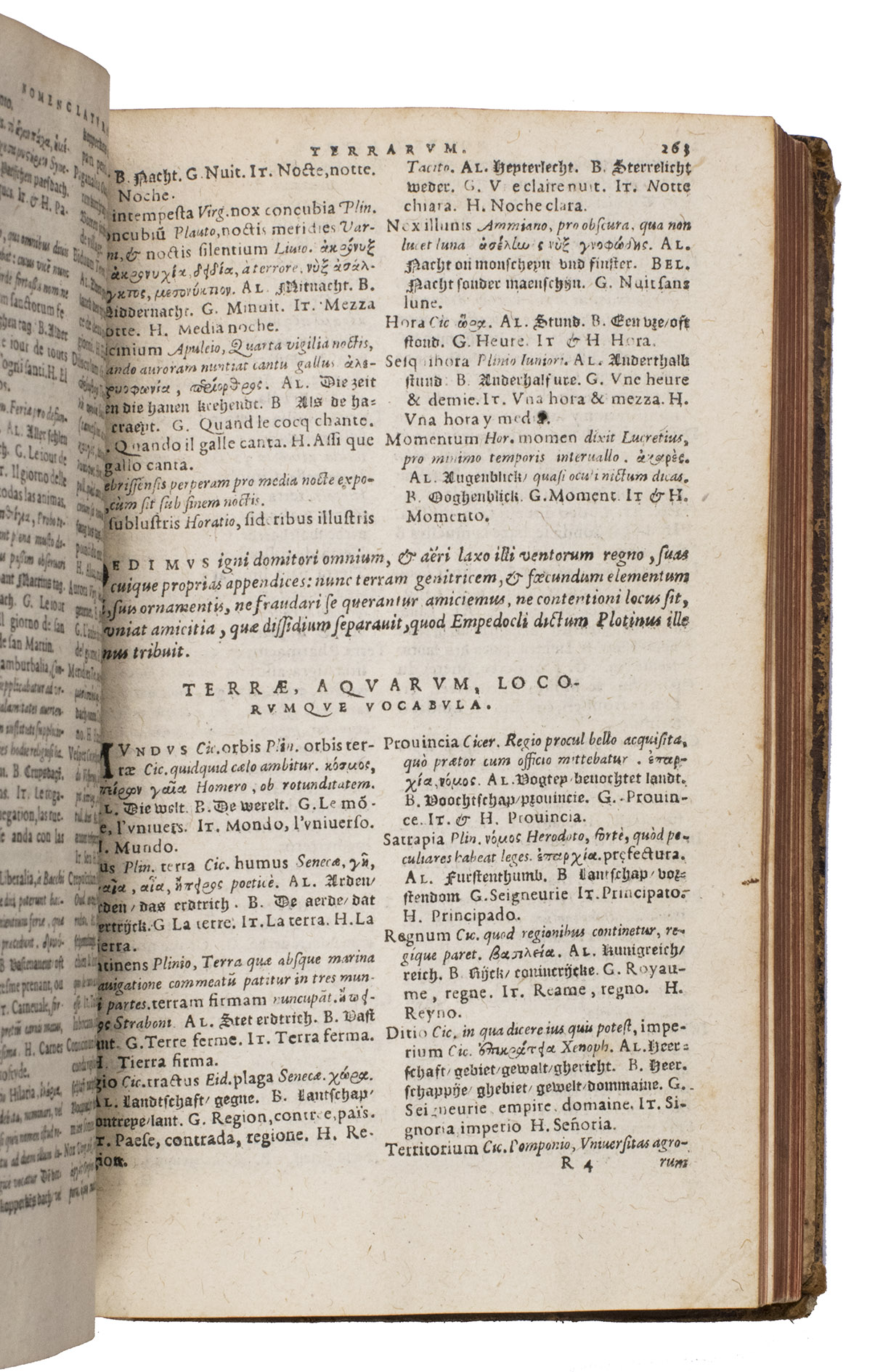 Junius Nomenclator is a thematically arranged dictionary, with Latin catchwords explained in Latin and translated into Greek and six languages: French, German, English, Dutch, Spanish, and Italian. The thematic organisation covers an extraordinary variety of subjects, including: De re libraria et librorum materia (a substantial chapter on the book trade), De cibis (food) and De potu (drink), De chirurgia (surgery), De re nummaria (money and finance), and Musica.