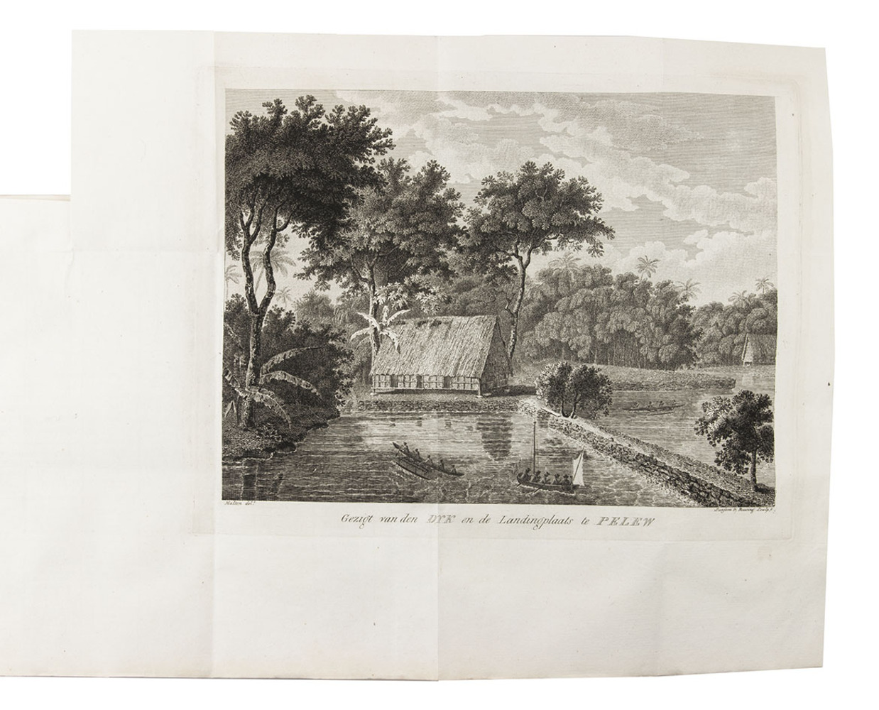 Rotterdam, Gerard Abraham Arrenberg, 1789. 4to. With 8 plates: 4 mixed technique (partly stipple-engraved) portraits, 1 large folding engraved map of the Palau Islands and western equatorial Pacific, and 3 folding engraved views. Contemporary boards. XXXII, 365, [1] pp.