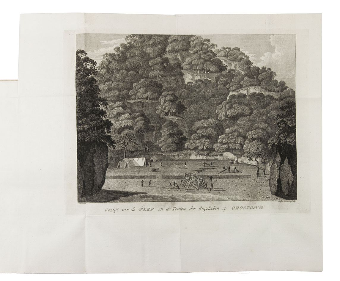 First Dutch translation of one of the most popular 18th-century books on the Pacific, and the main source of early knowledge of the Pelew or Palau Islands in Micronesia, first published in London as An account of the Pelew Islands (1788). In 1773, the Antelope under command of Captain Henry Wilson was shipwrecked near one of the Palau Islands, a previously unexplored group. The crew managed to reach shore, where they were well treated by the natives. They built a small boat from the wreck, in which they reached Macao. They took Lee Boo, the son of Abba Thulle, King of the Palau Islands, with them to England where he made a very good impression. Unfortunately, he soon died of smallpox. The map covers from the equator to 24°N latitude and from 110 to 159°E longitude (from Borneo and the south coast of China in the west to the western Caroline Islands).