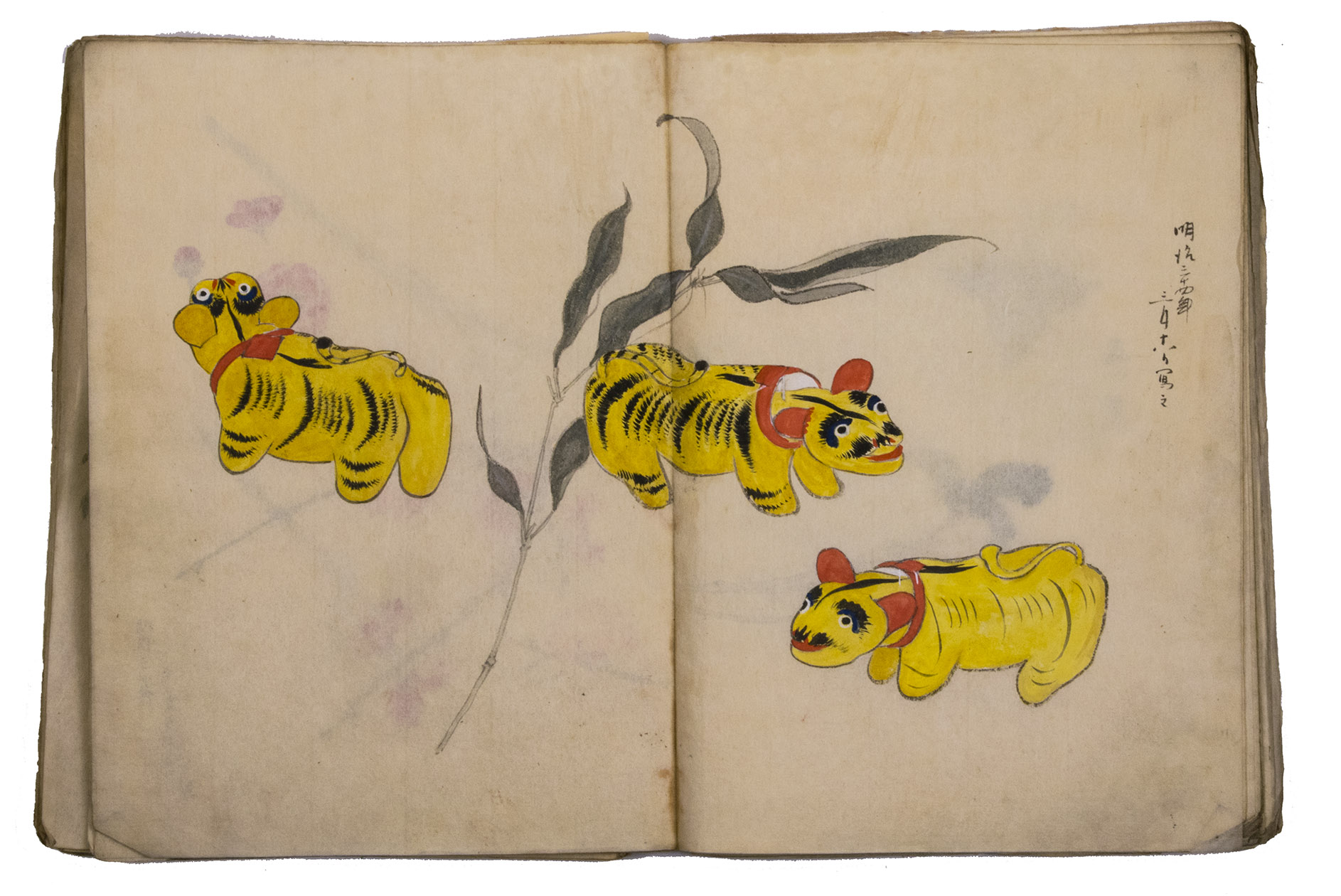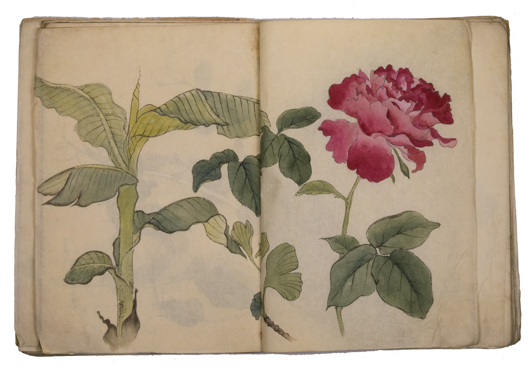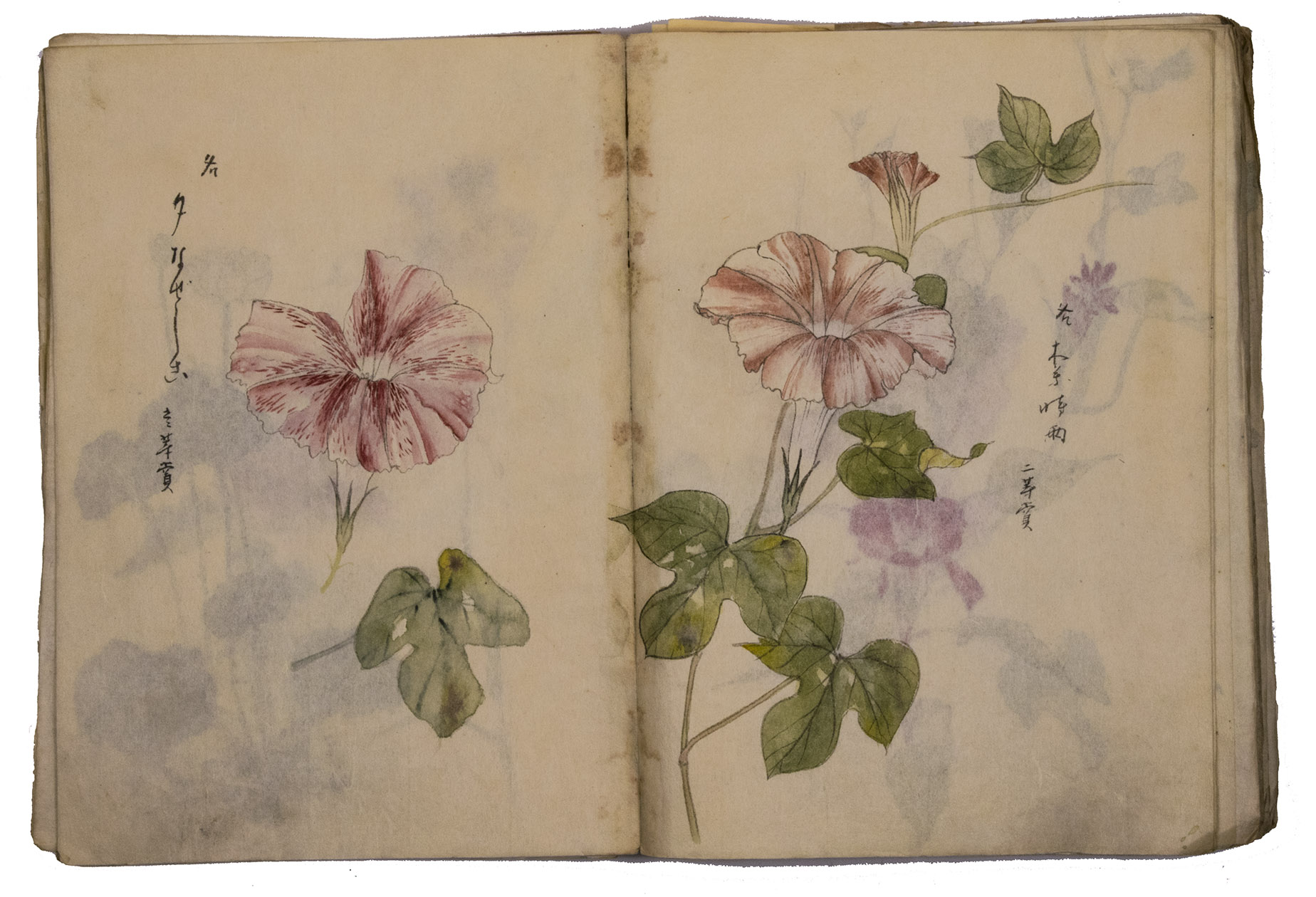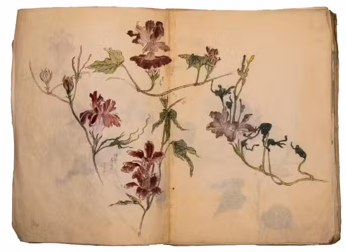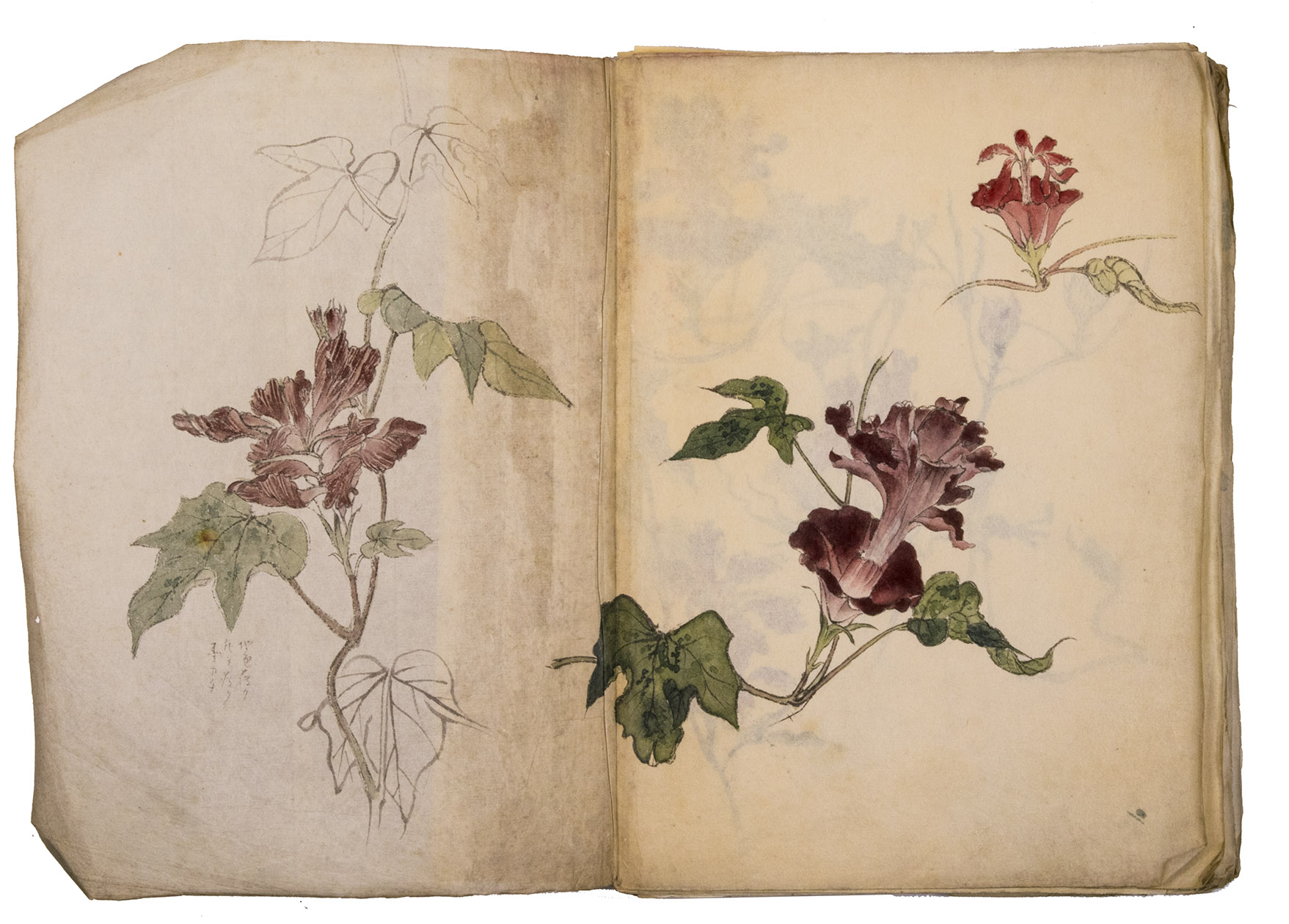 A set of excellent Japanese drawings on Japanese paper, nearly all in colour, the dated ones mostly from 1901 to 1903, though one apparently 1898. Most show flowers, but some also or instead show fruits, vegetables, berries, roots, tree branches, grasses, etc., all in a consistent style and format and botanically accurate. One includes a butterfly, four show birds or feathers in great detail (with or without flowers) and one shows three kubi furi tora (bobbing-head tigers) that would have been carved out of wood or made of papier maché and then painted. Most double-page spreads are clearly planned as a single composition, sometimes with one large drawing across both pages and sometimes with three drawings with the centre one across the fold, but some have two drawings, one on the right page and one on the left page. Some also have additional detail drawings. Although the title calls the collection morning glory sketches, other flowers are just as frequent and prominent. Flowers shown include camellia, cherry, hibiscus, crocosmia, narcissus, peony, iris and many more. In addition to flowers, the botanical drawings include bananas, sweet potato, melon, bamboo shoots, ginger, saffron, some sort of cabbage, peas(?) growing in a pot and others. Three double-page spreads contain very fine drawings of birds and another of bird feathers (including a peacock feather).