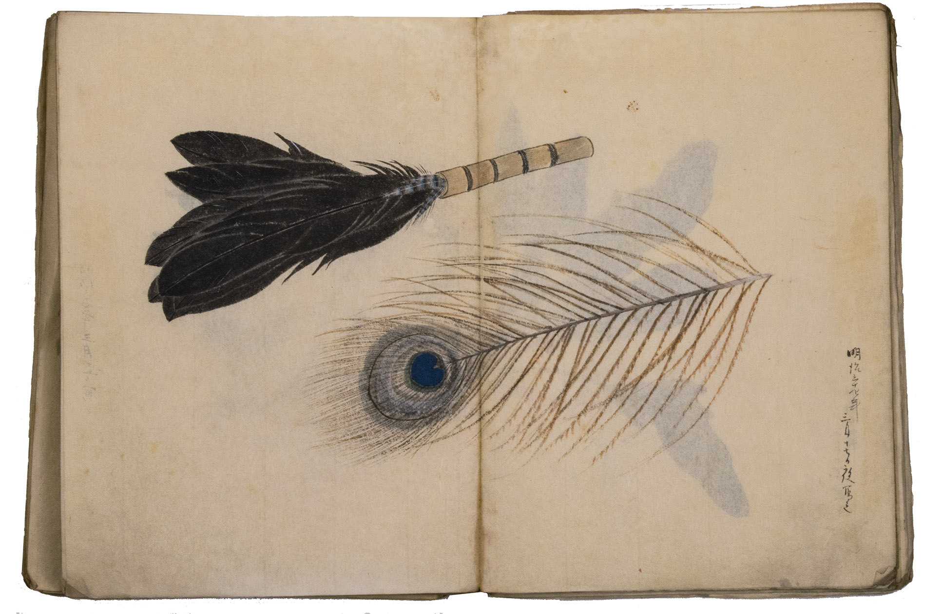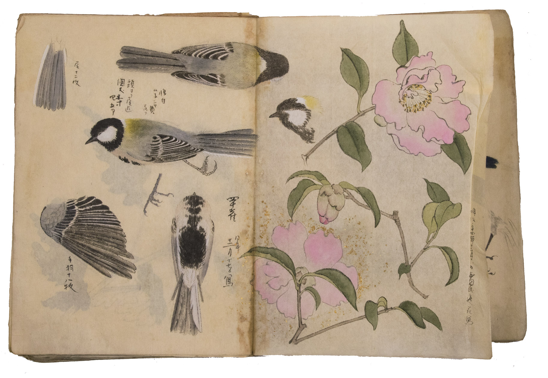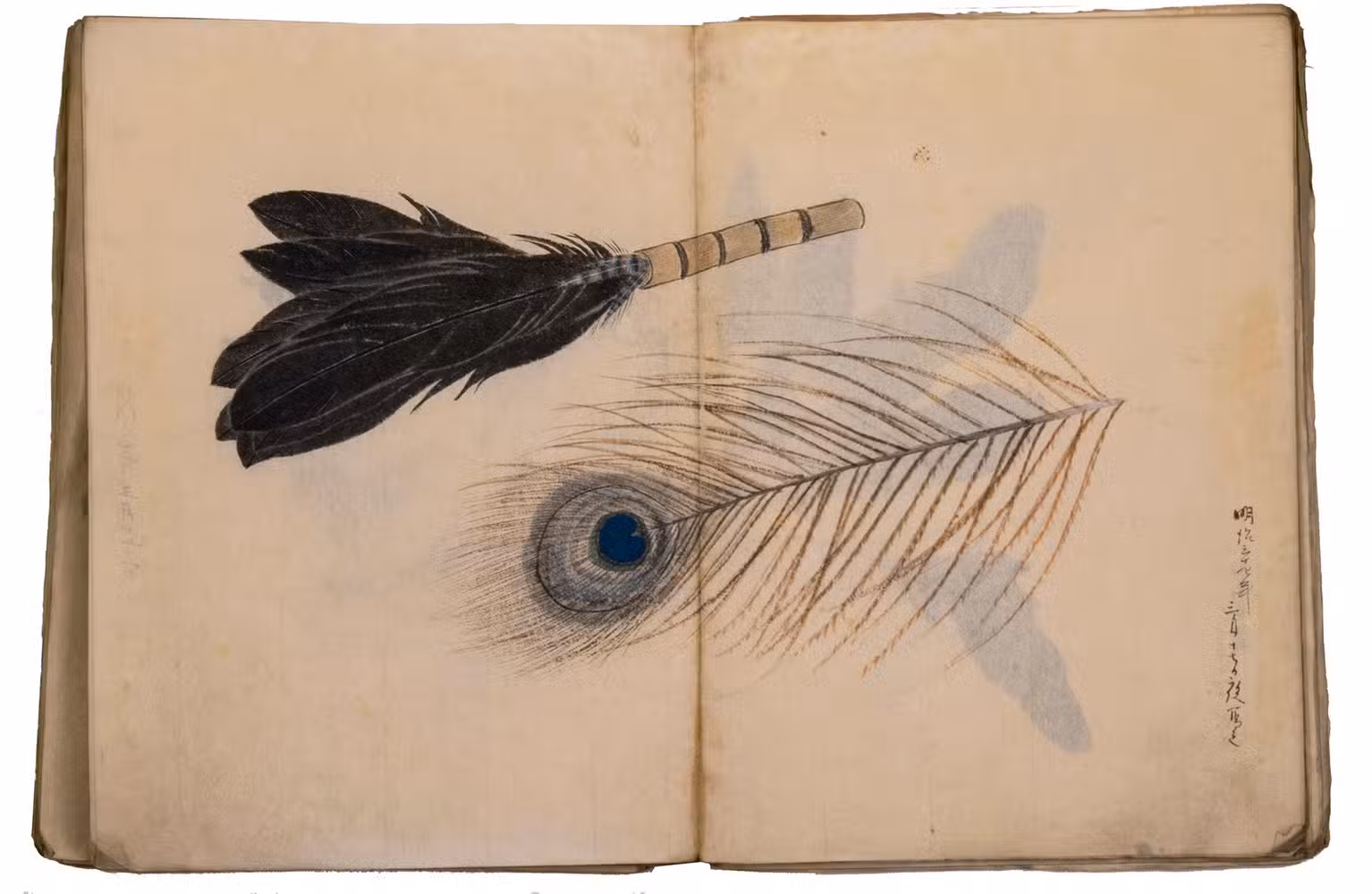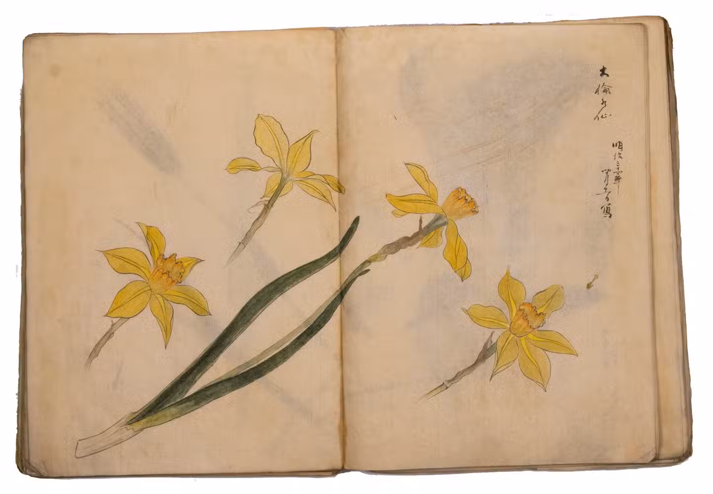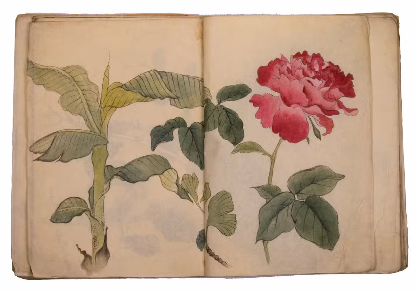 A set of excellent Japanese drawings on Japanese paper, nearly all in colour, the dated ones mostly from 1901 to 1903, though one apparently 1898. Most show flowers, but some also or instead show fruits, vegetables, berries, roots, tree branches, grasses, etc., all in a consistent style and format and botanically accurate. One includes a butterfly, four show birds or feathers in great detail (with or without flowers) and one shows three kubi furi tora (bobbing-head tigers) that would have been carved out of wood or made of papier maché and then painted. Most double-page spreads are clearly planned as a single composition, sometimes with one large drawing across both pages and sometimes with three drawings with the centre one across the fold, but some have two drawings, one on the right page and one on the left page. Some also have additional detail drawings. Although the title calls the collection morning glory sketches, other flowers are just as frequent and prominent. Flowers shown include camellia, cherry, hibiscus, crocosmia, narcissus, peony, iris and many more. In addition to flowers, the botanical drawings include bananas, sweet potato, melon, bamboo shoots, ginger, saffron, some sort of cabbage, peas(?) growing in a pot and others. Three double-page spreads contain very fine drawings of birds and another of bird feathers (including a peacock feather).
