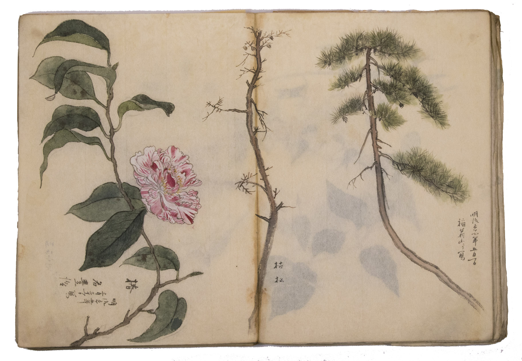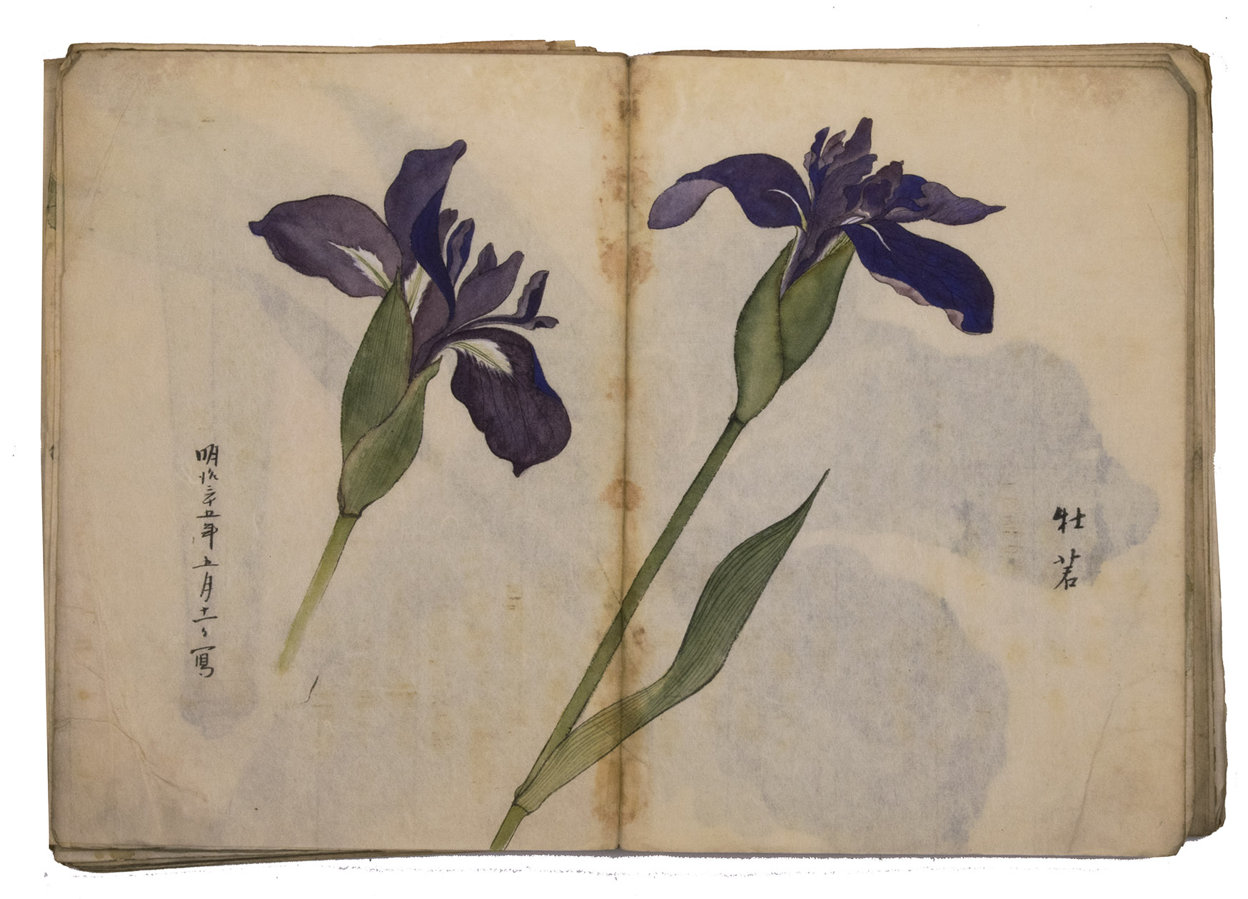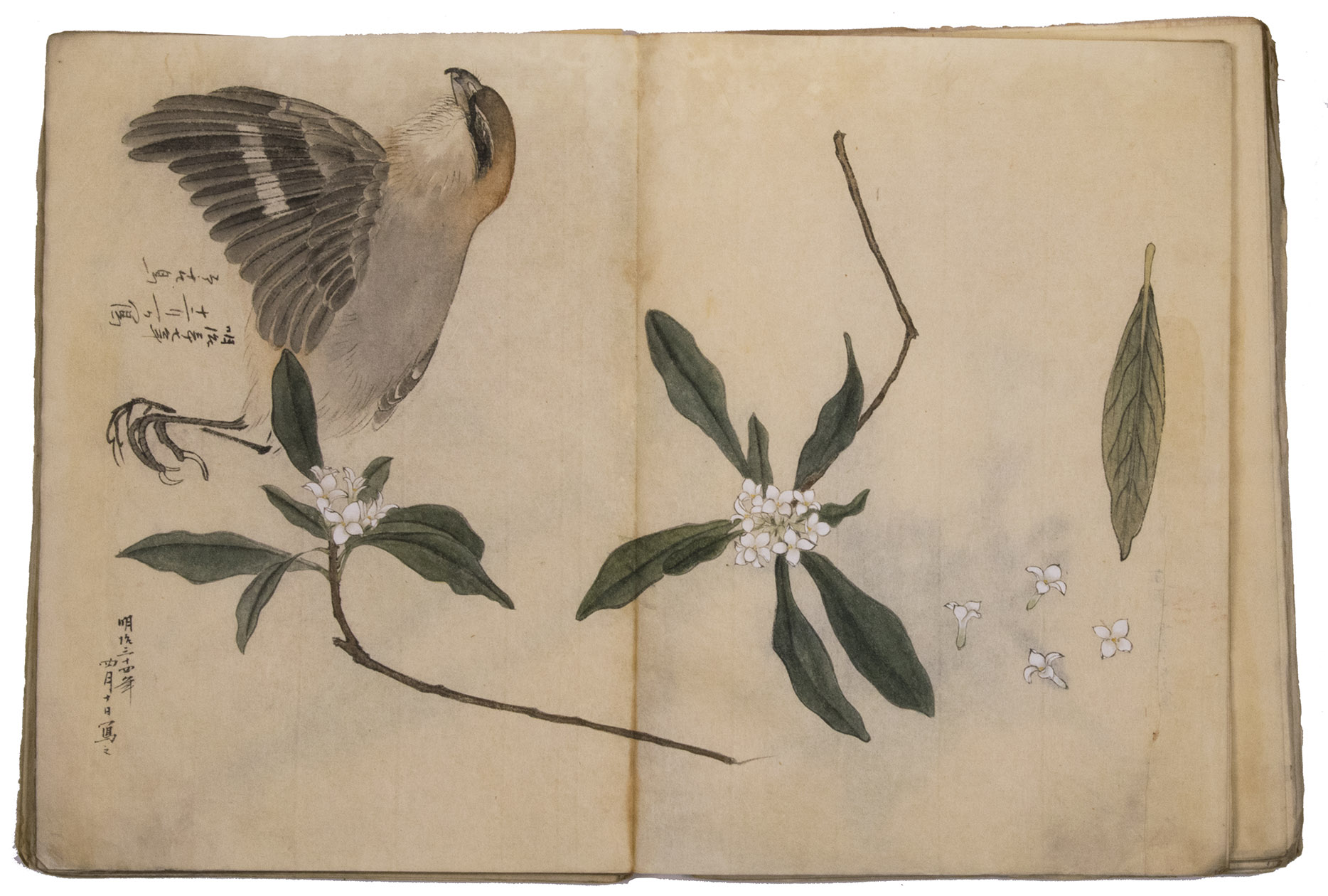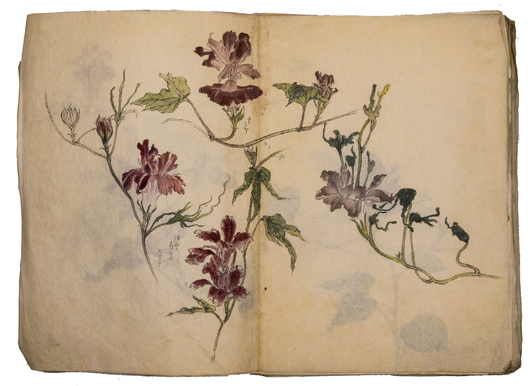 Japan, Meiji 31?, 34-36 [=1898?, 1901-1903]. Very large 8vo? (28 x 20.5 cm). With 85 double-page (mostly botanical) drawings in black ink on Japanese paper, each showing 1, 2 or 3 figures, sometimes with additional detail drawings, nearly all coloured in watercolour and/or gouache and most with captions identifying the subject and/or giving the date. Front wrapper with the title in Japanese in black ink. Wrapper-title plus [85] double-page spreads.