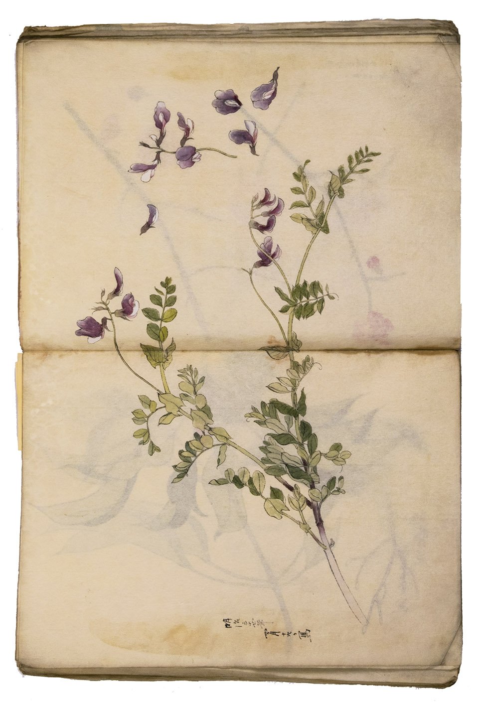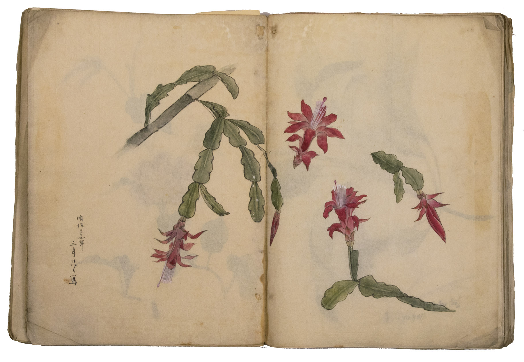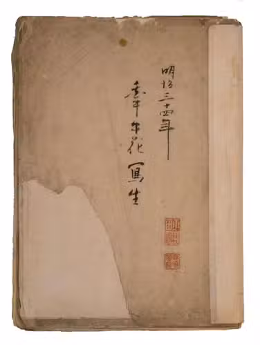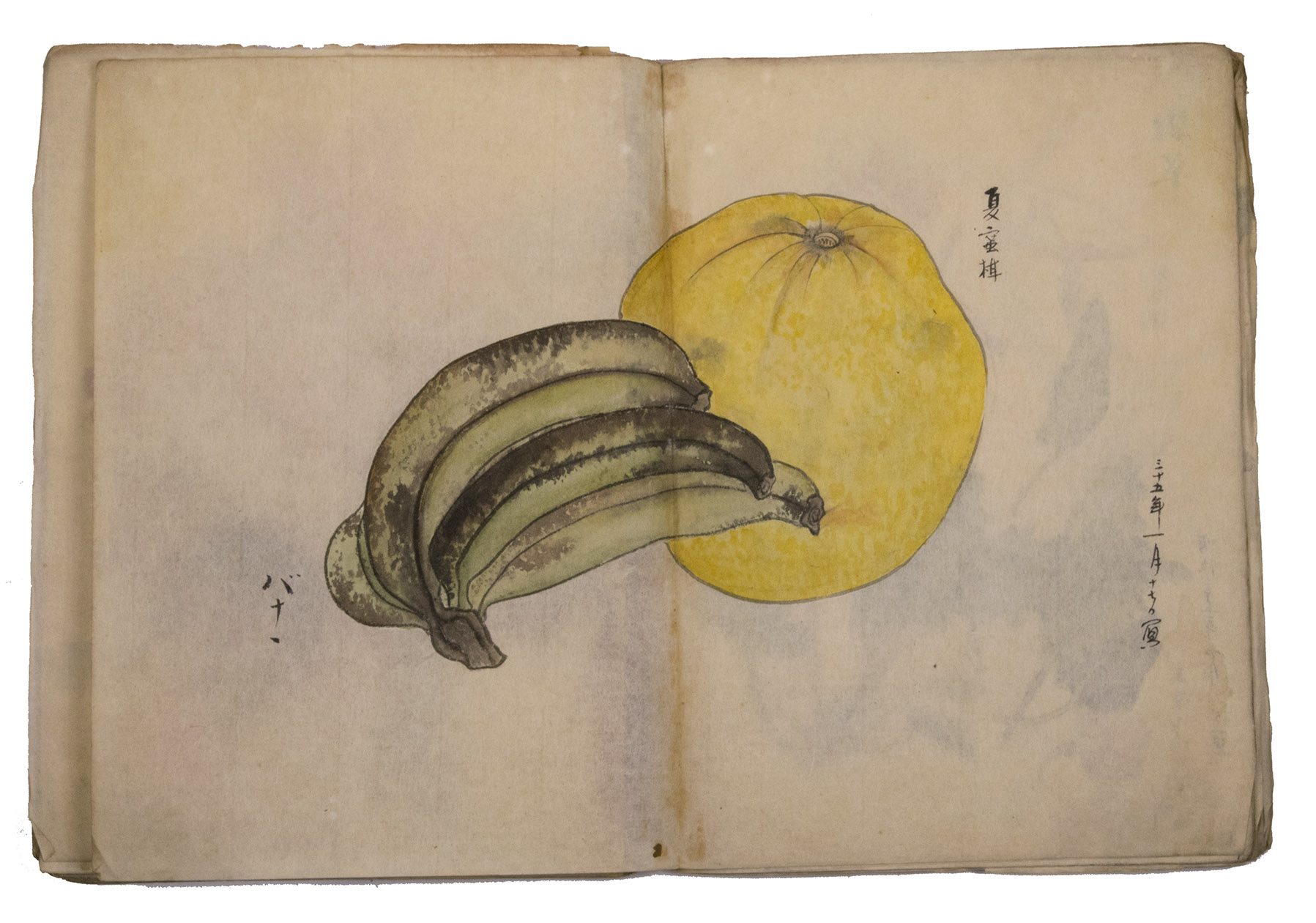 Japan, Meiji 31?, 34-36 [=1898?, 1901-1903]. Very large 8vo? (28 x 20.5 cm). With 85 double-page (mostly botanical) drawings in black ink on Japanese paper, each showing 1, 2 or 3 figures, sometimes with additional detail drawings, nearly all coloured in watercolour and/or gouache and most with captions identifying the subject and/or giving the date. Front wrapper with the title in Japanese in black ink. Wrapper-title plus [85] double-page spreads.