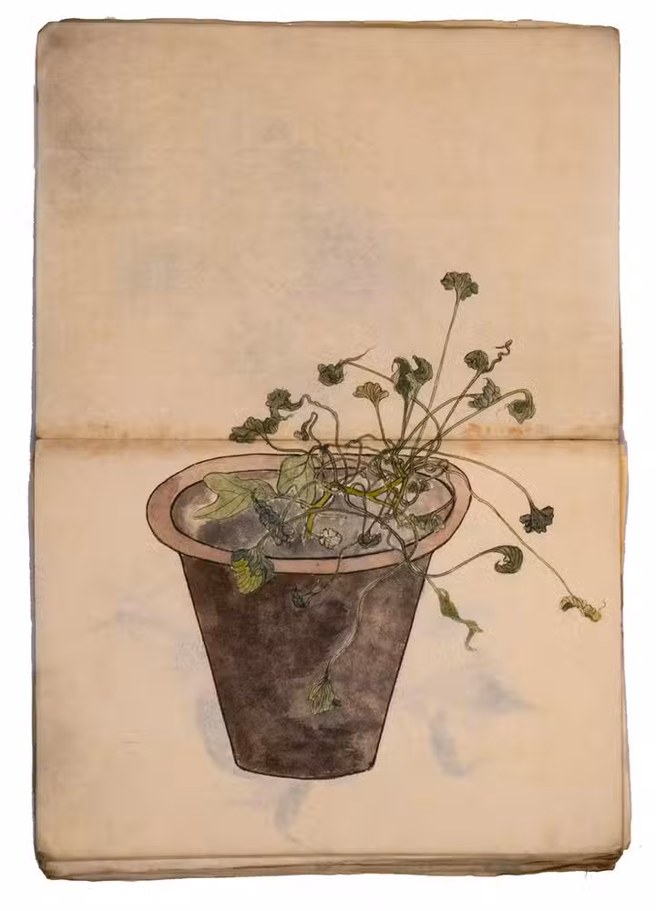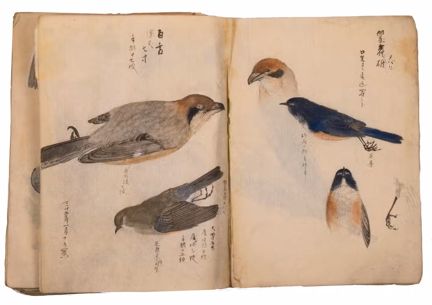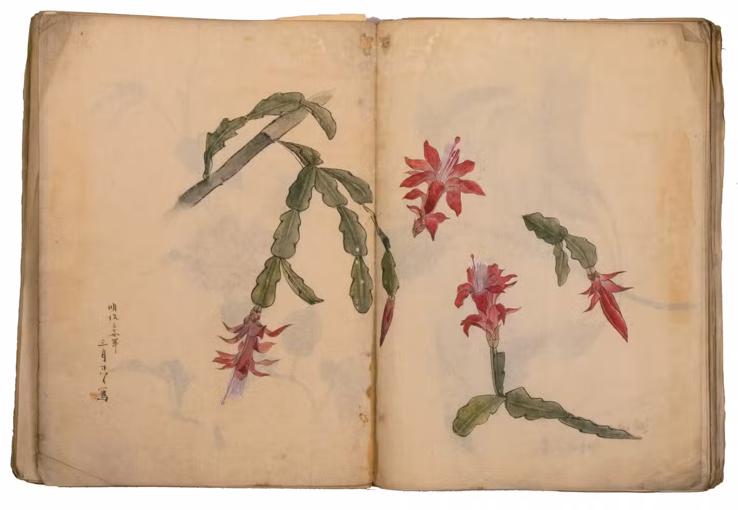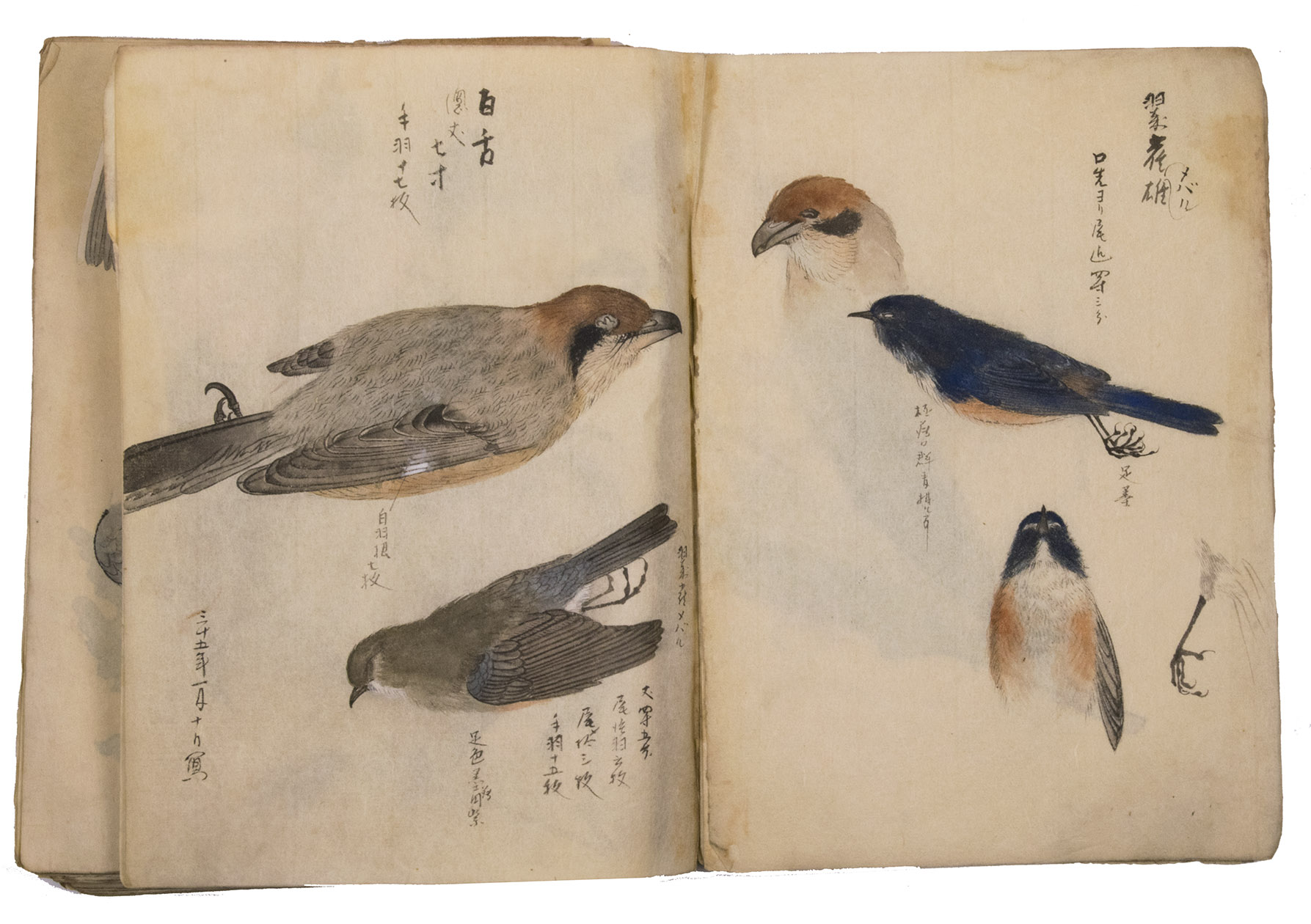 Japan, Meiji 31?, 34-36 [=1898?, 1901-1903]. Very large 8vo? (28 x 20.5 cm). With 85 double-page (mostly botanical) drawings in black ink on Japanese paper, each showing 1, 2 or 3 figures, sometimes with additional detail drawings, nearly all coloured in watercolour and/or gouache and most with captions identifying the subject and/or giving the date. Front wrapper with the title in Japanese in black ink. Wrapper-title plus [85] double-page spreads.