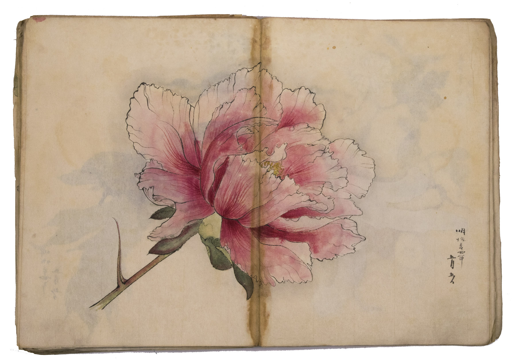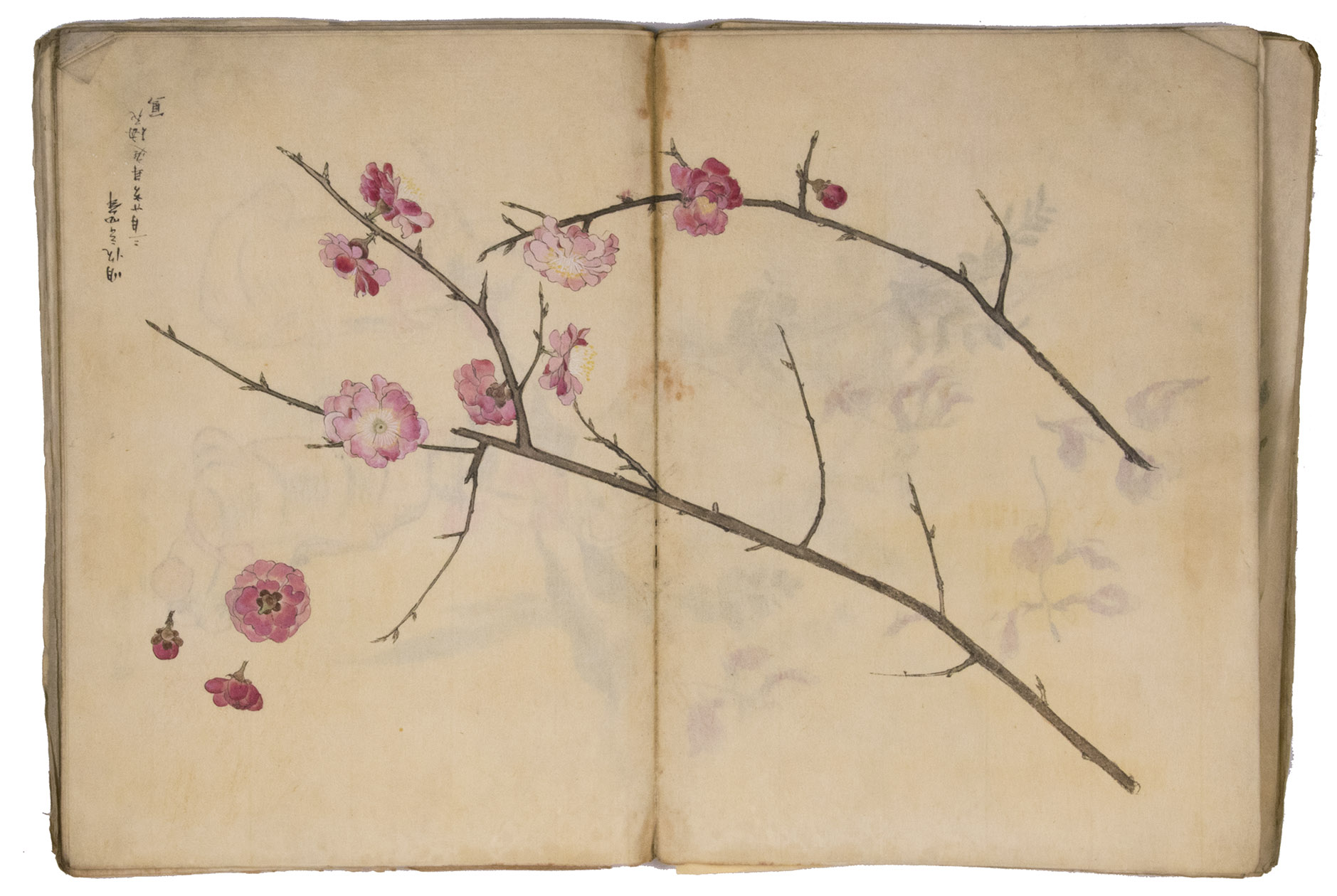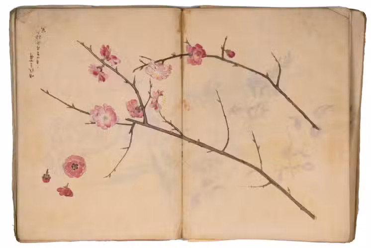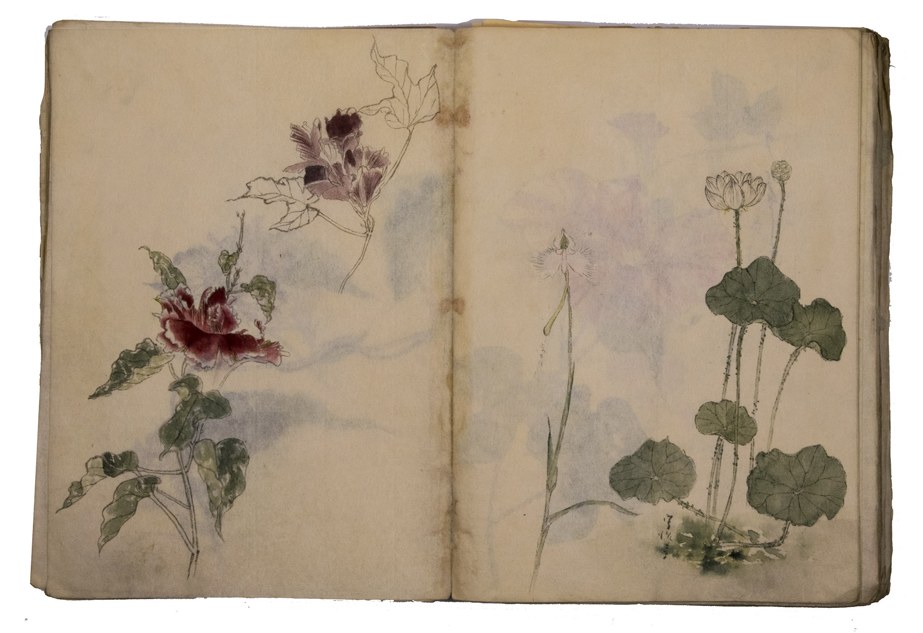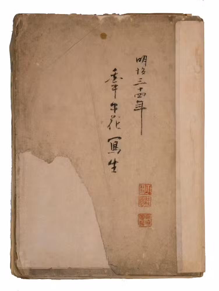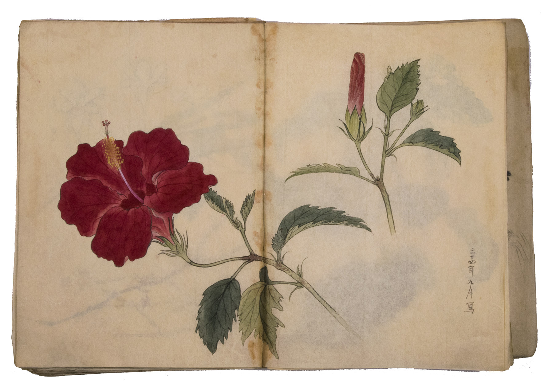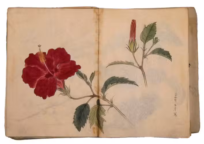 Lacking 1 leaf (the right half of double-page spread 31), with the loss of one whole figure and part of another. The paste has often discoloured the paper along the fold, some bifolia are torn along the fold and there is an occasional minor marginal defect, but the drawings are otherwise in very good condition. The back wrapper is lacking, the front wrapper damaged, the spine has been reinforced with plain paper and some bifolia have come loose from their neighbours. A stunning set of beautiful and accurate Japanese colour drawings, mostly botanical.