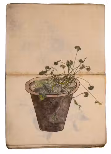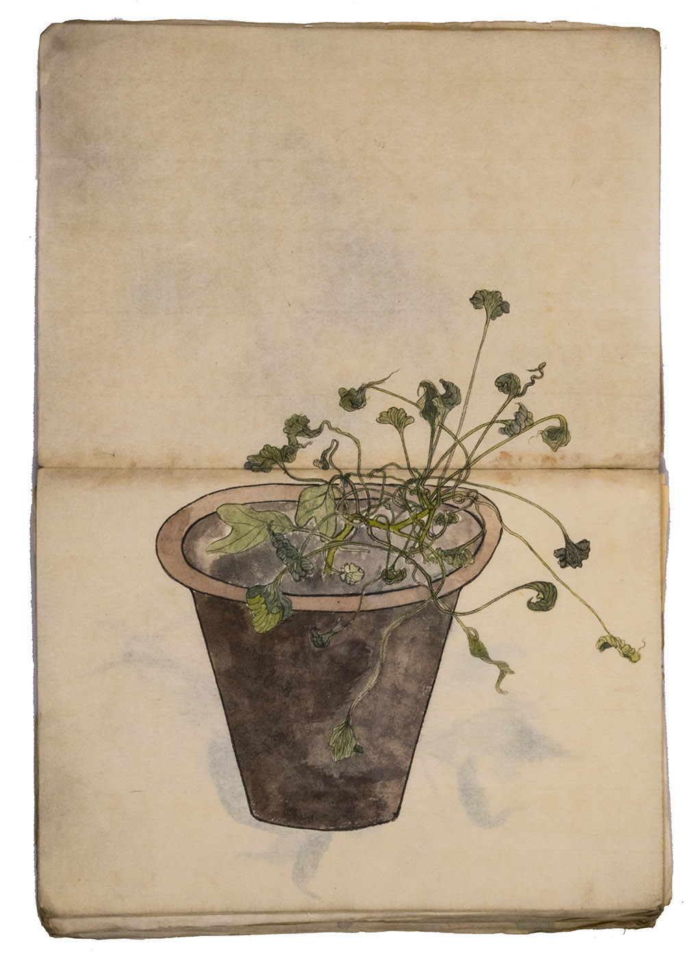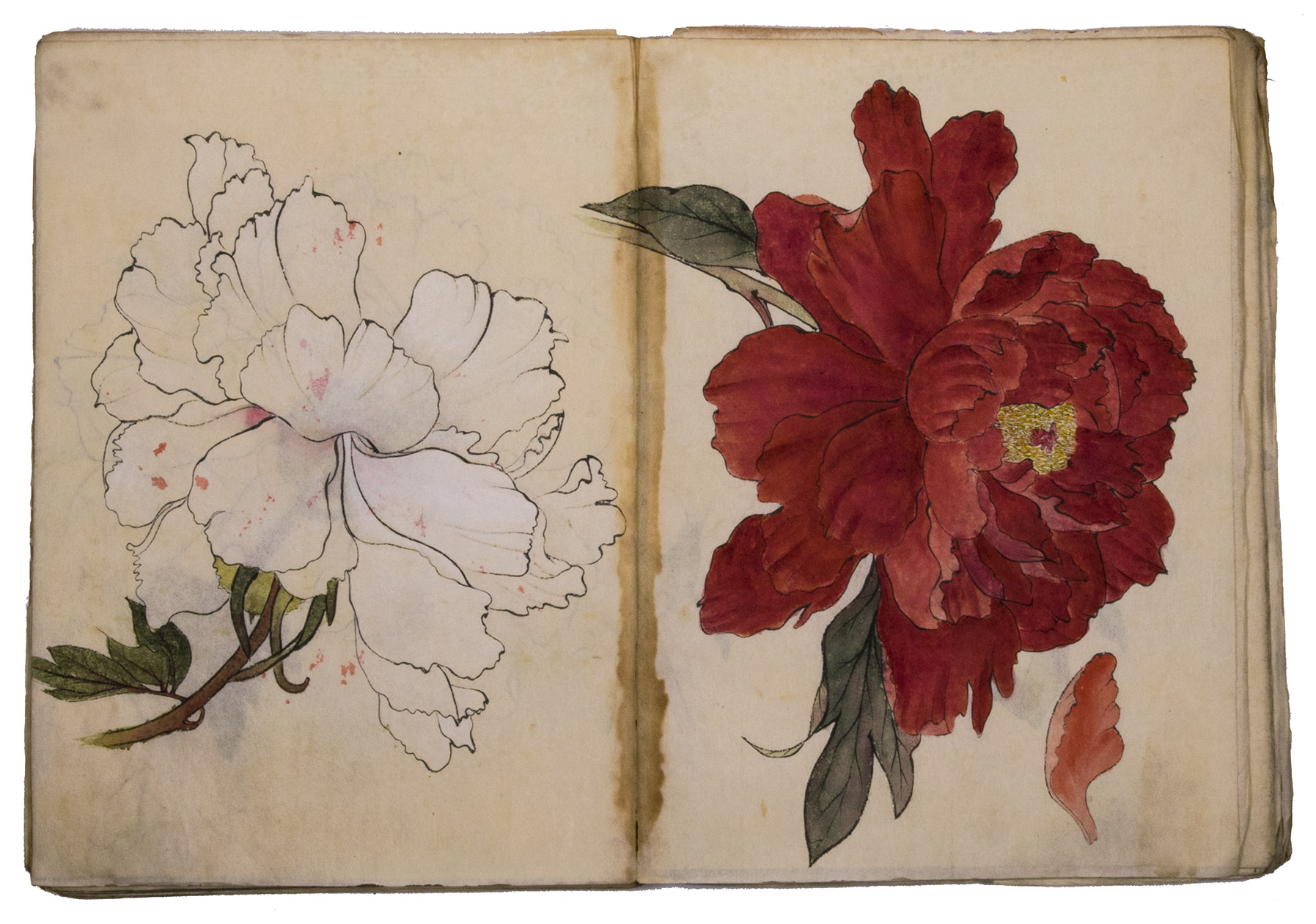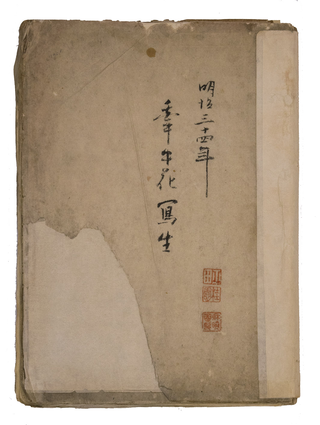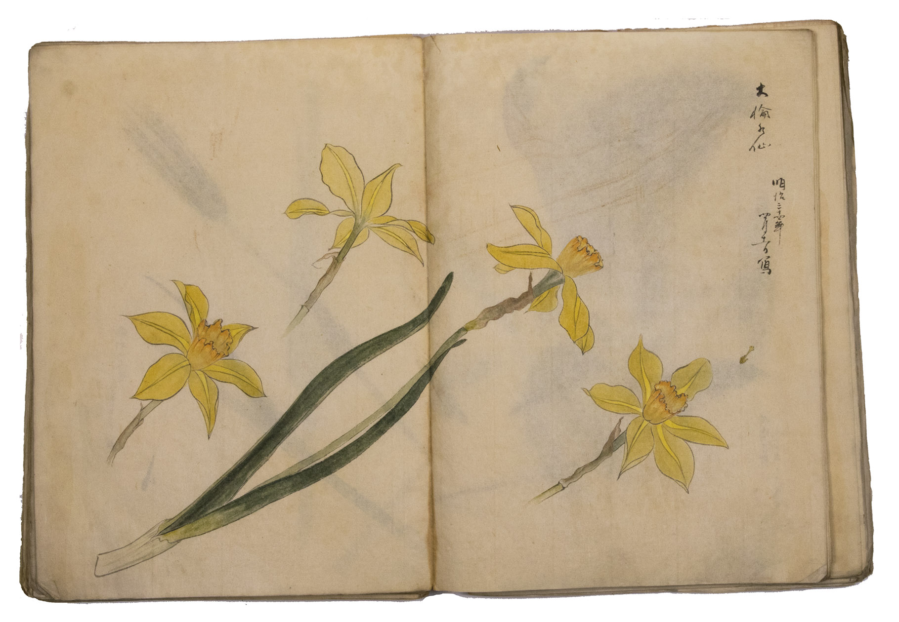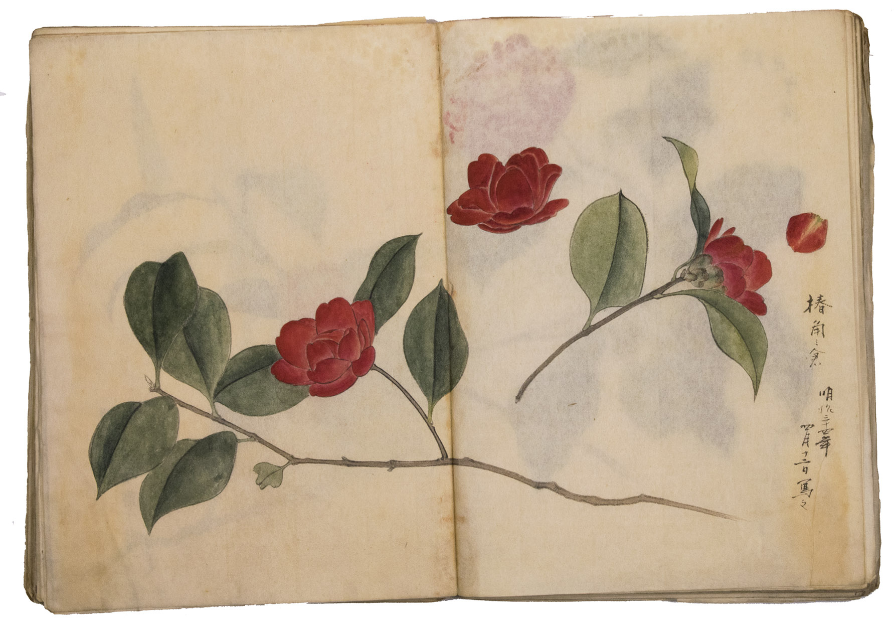 Lacking 1 leaf (the right half of double-page spread 31), with the loss of one whole figure and part of another. The paste has often discoloured the paper along the fold, some bifolia are torn along the fold and there is an occasional minor marginal defect, but the drawings are otherwise in very good condition. The back wrapper is lacking, the front wrapper damaged, the spine has been reinforced with plain paper and some bifolia have come loose from their neighbours. A stunning set of beautiful and accurate Japanese colour drawings, mostly botanical.