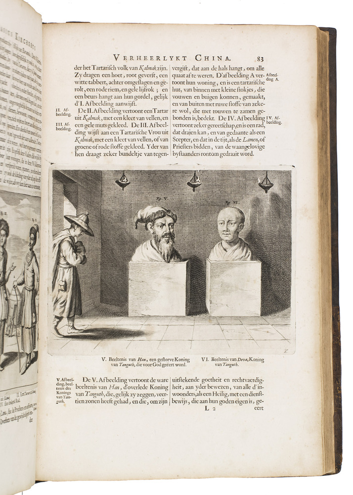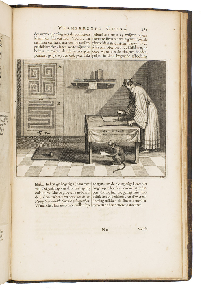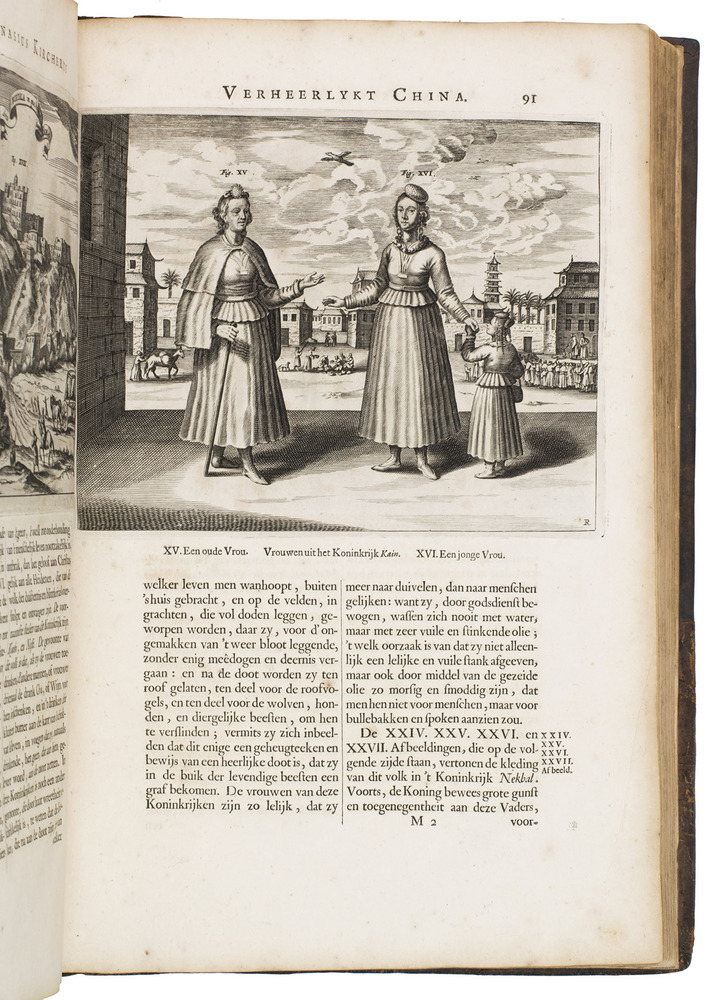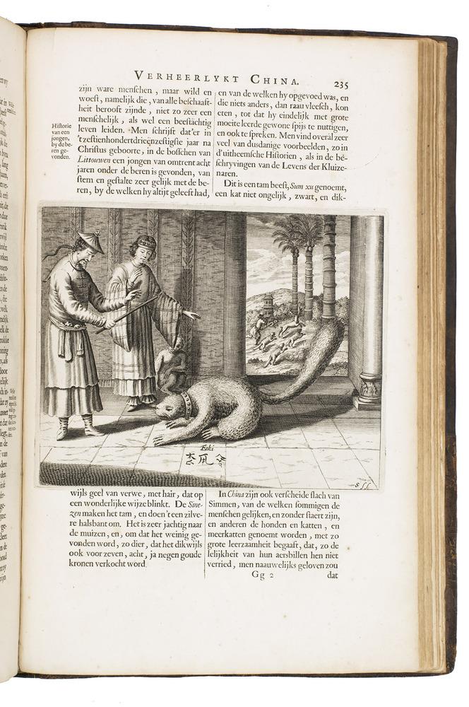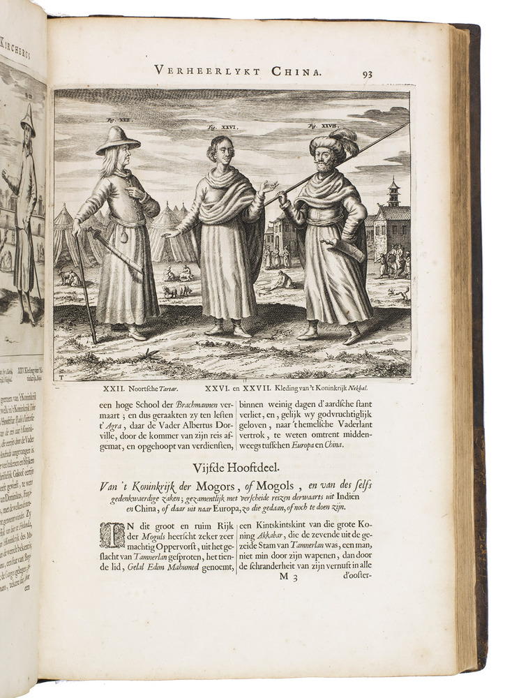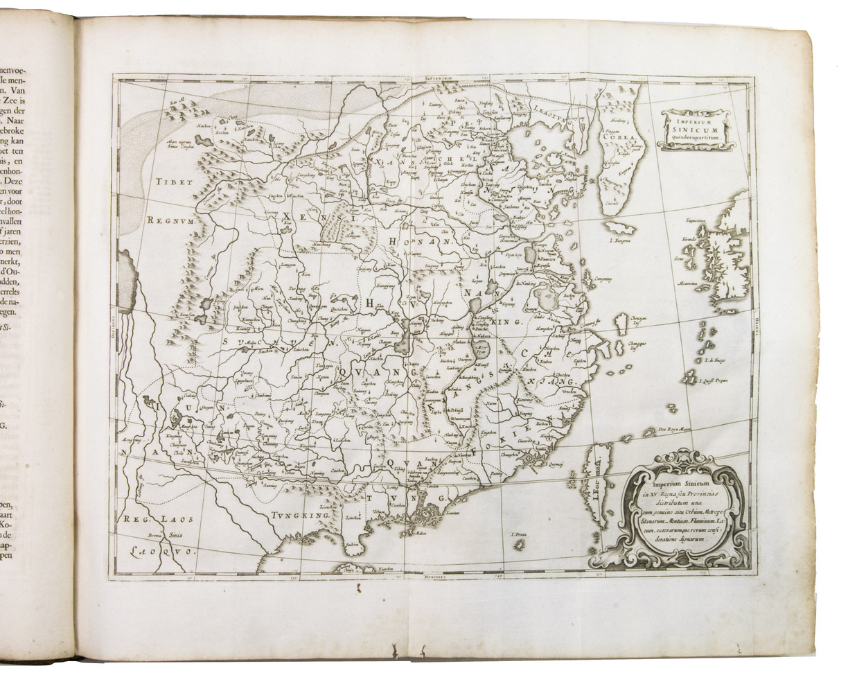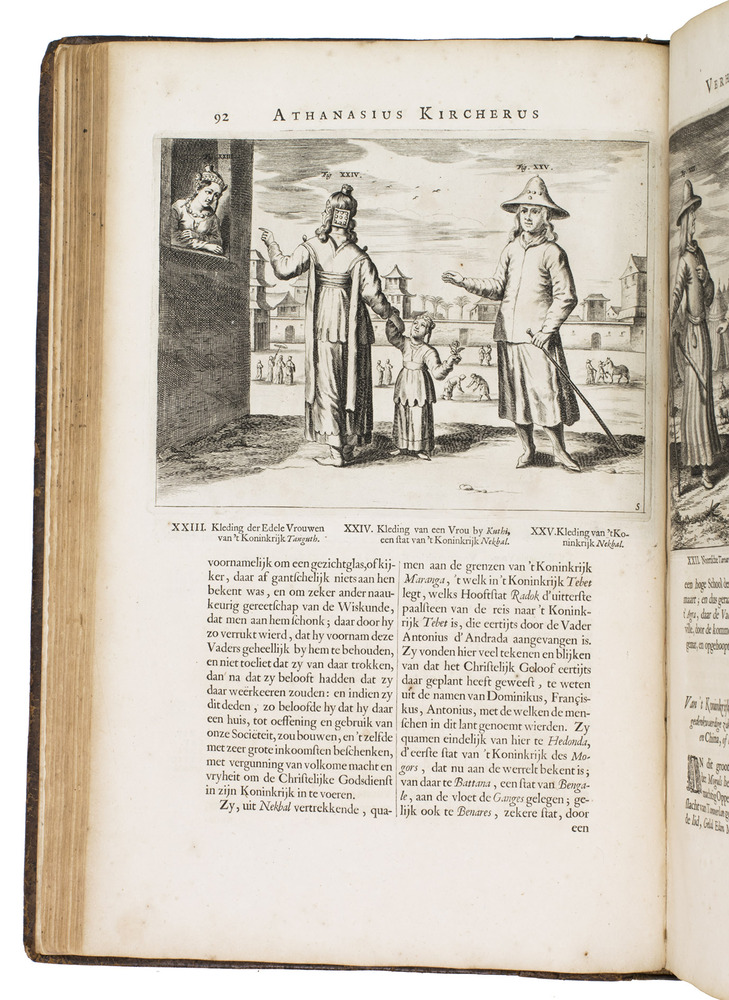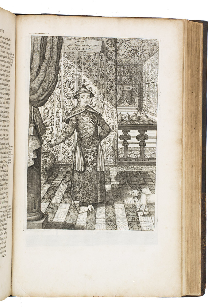 Amsterdam, Johannes Janssonius van Waesberge and the widow of Elizaeus Weyerstraten, 1668. Folio. With engraved frontispiece, engraved author's portrait, 24 engraved plates (including 2 double-page maps and 1 folding plate) and 60 engraved illustrations in text (plus another copy on a separate leaf, without letterpress text, of the engraving on 2F3v). Including maps of China and Asia, traditional Chinese costumes, illustrations of the Chinese and the Mughal rulers in abundantly decorated rooms, linguistic illustrations, zoological illustrations, etc. Contemporary gold-tooled calf, later endpapers (re-cased). [12], 286, [10] pp.
