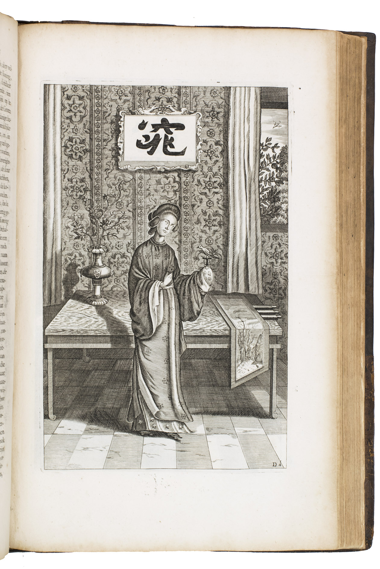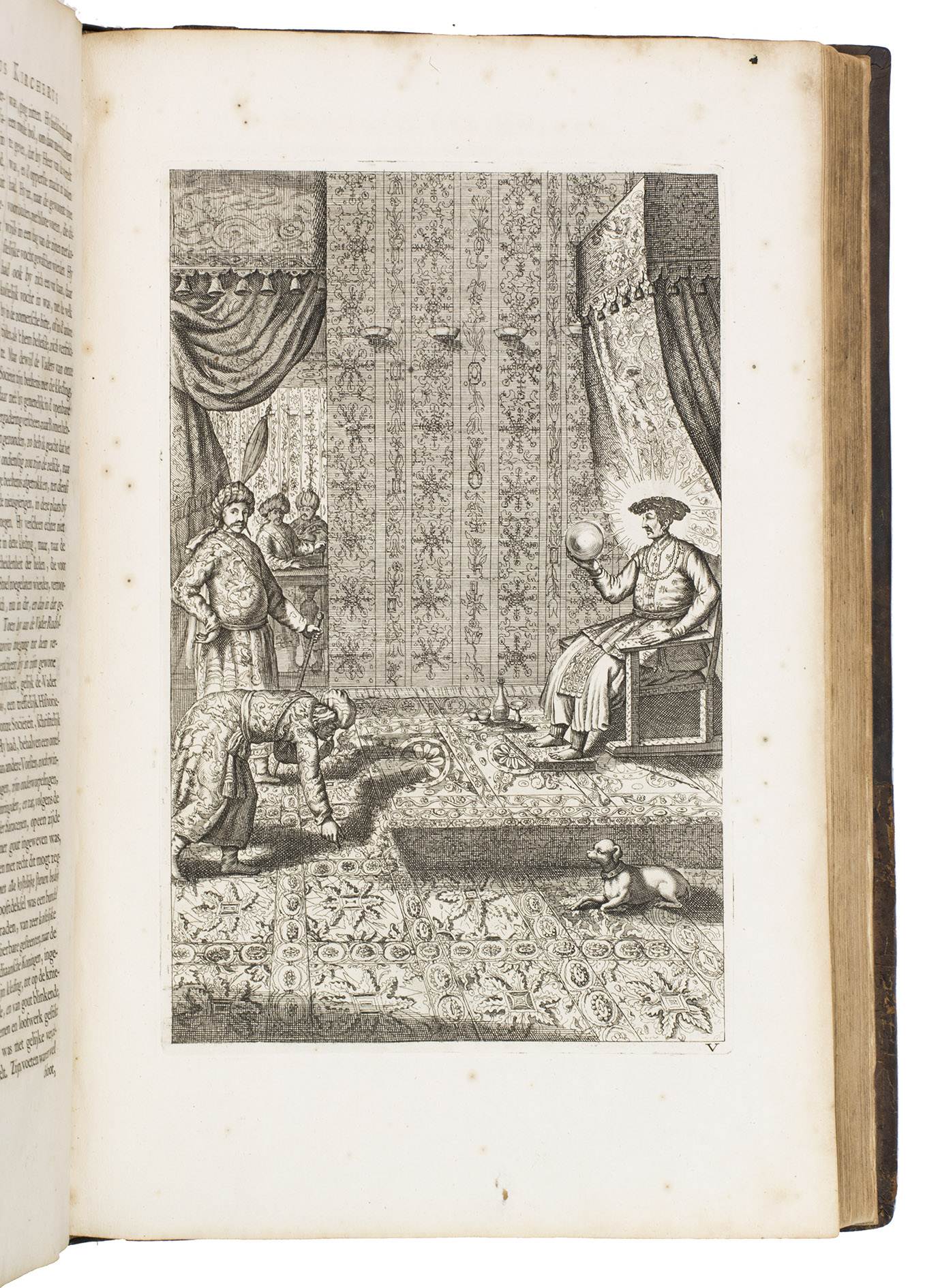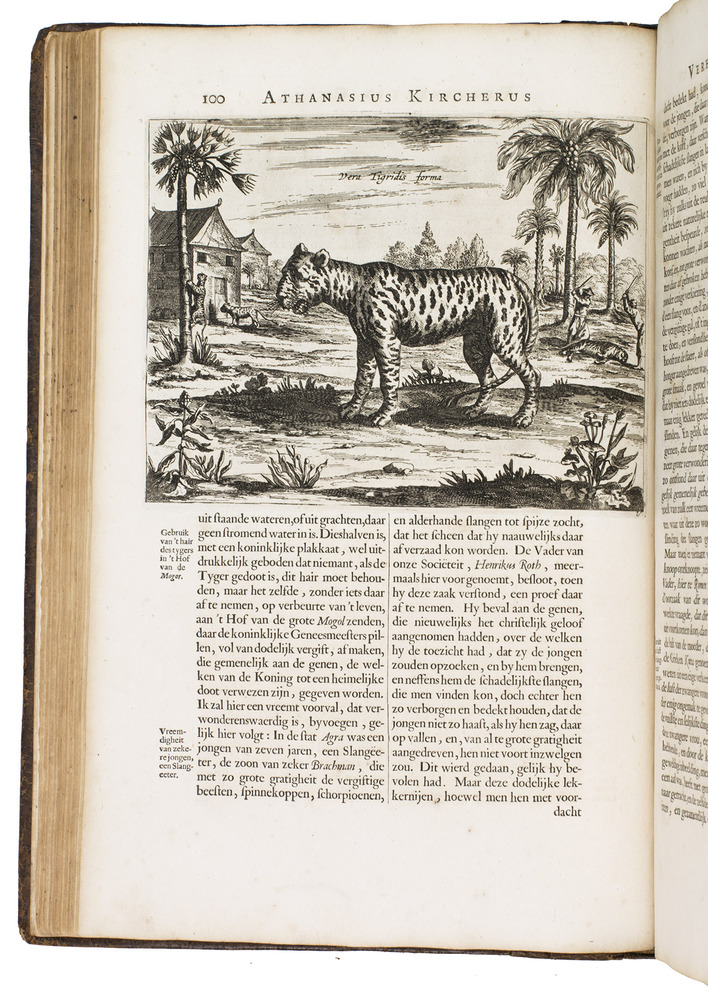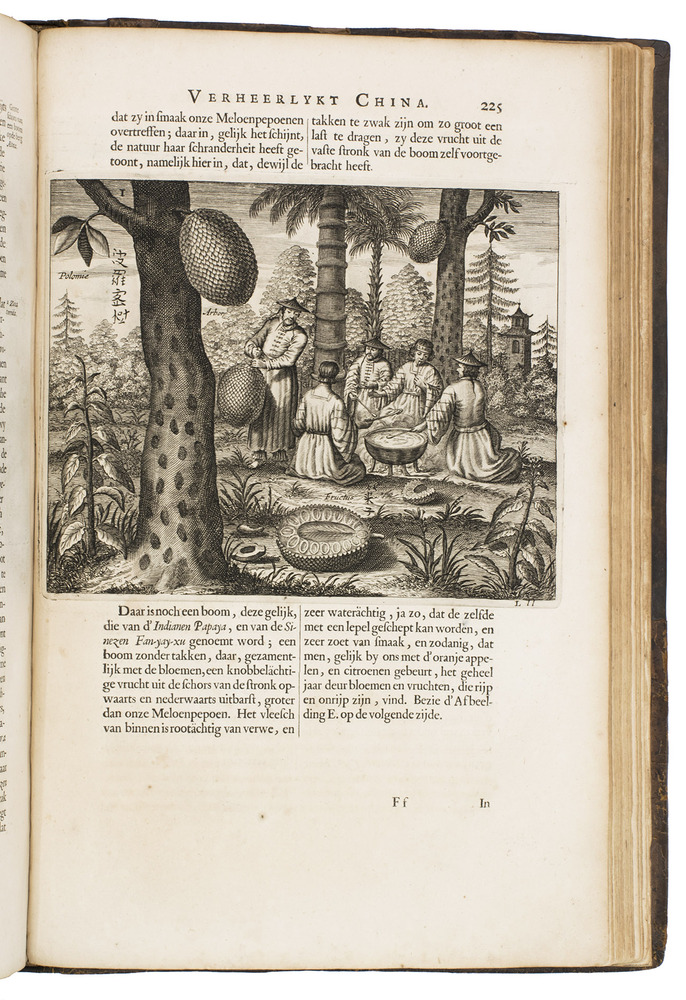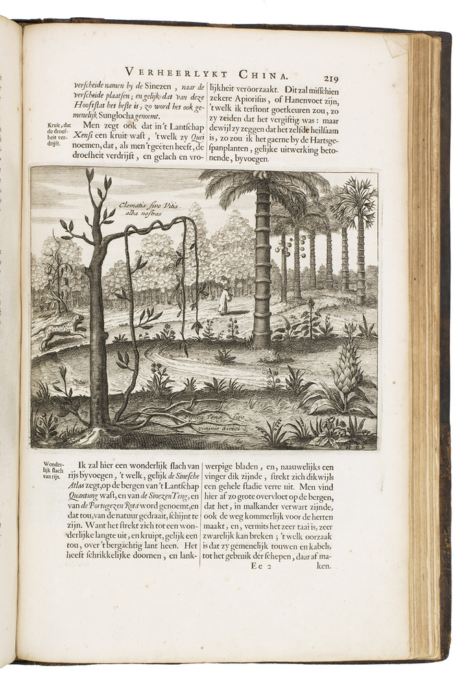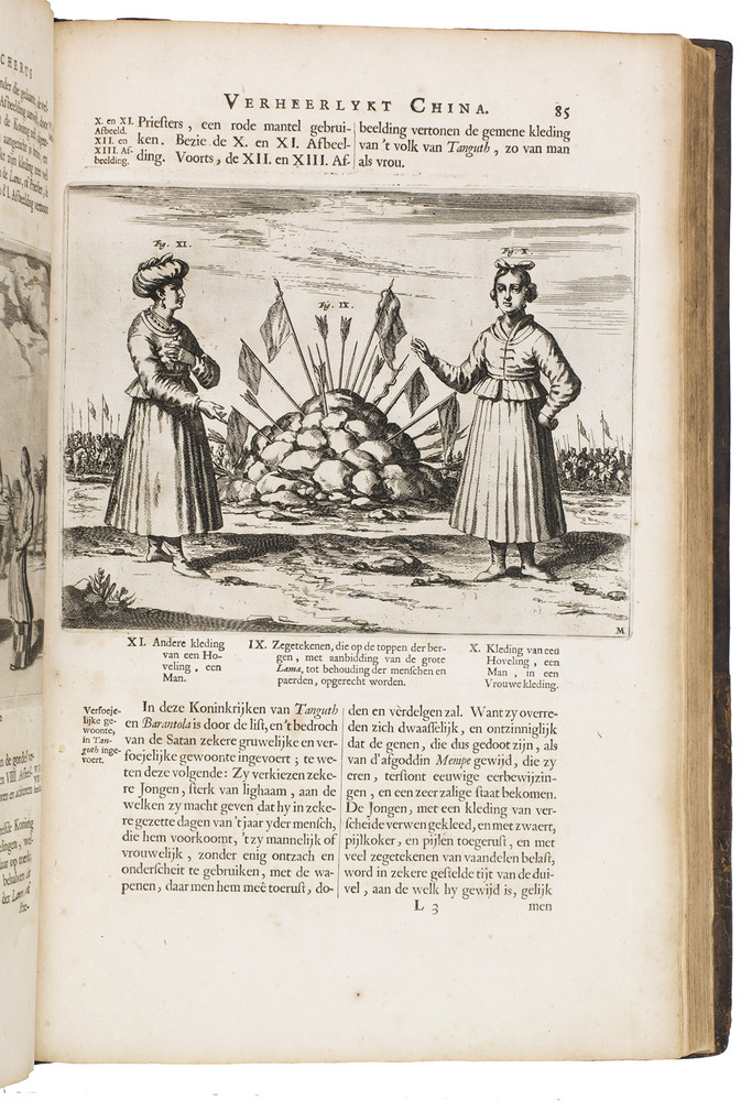 Amsterdam, Johannes Janssonius van Waesberge and the widow of Elizaeus Weyerstraten, 1668. Folio. With engraved frontispiece, engraved author's portrait, 24 engraved plates (including 2 double-page maps and 1 folding plate) and 60 engraved illustrations in text (plus another copy on a separate leaf, without letterpress text, of the engraving on 2F3v). Including maps of China and Asia, traditional Chinese costumes, illustrations of the Chinese and the Mughal rulers in abundantly decorated rooms, linguistic illustrations, zoological illustrations, etc. Contemporary gold-tooled calf, later endpapers (re-cased). [12], 286, [10] pp.