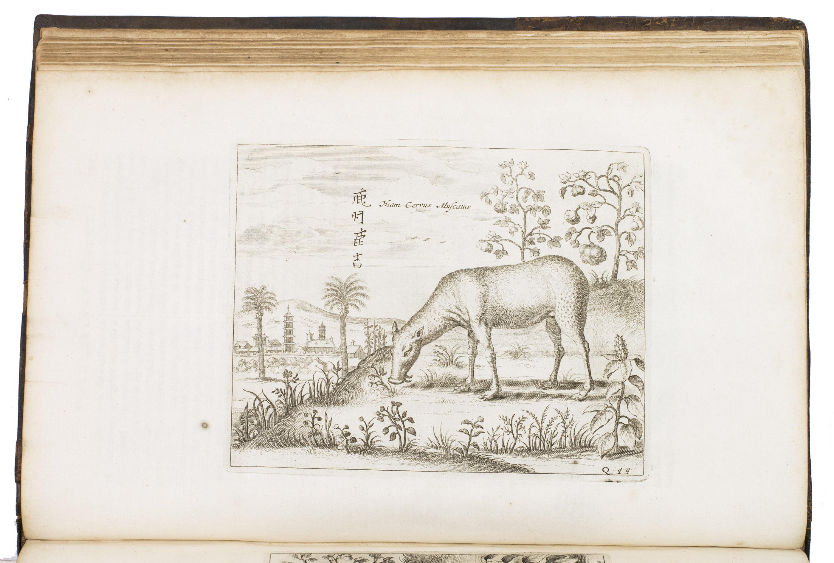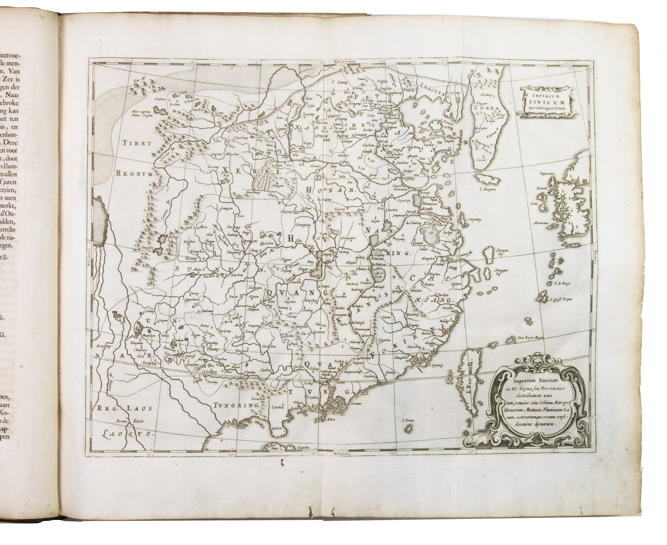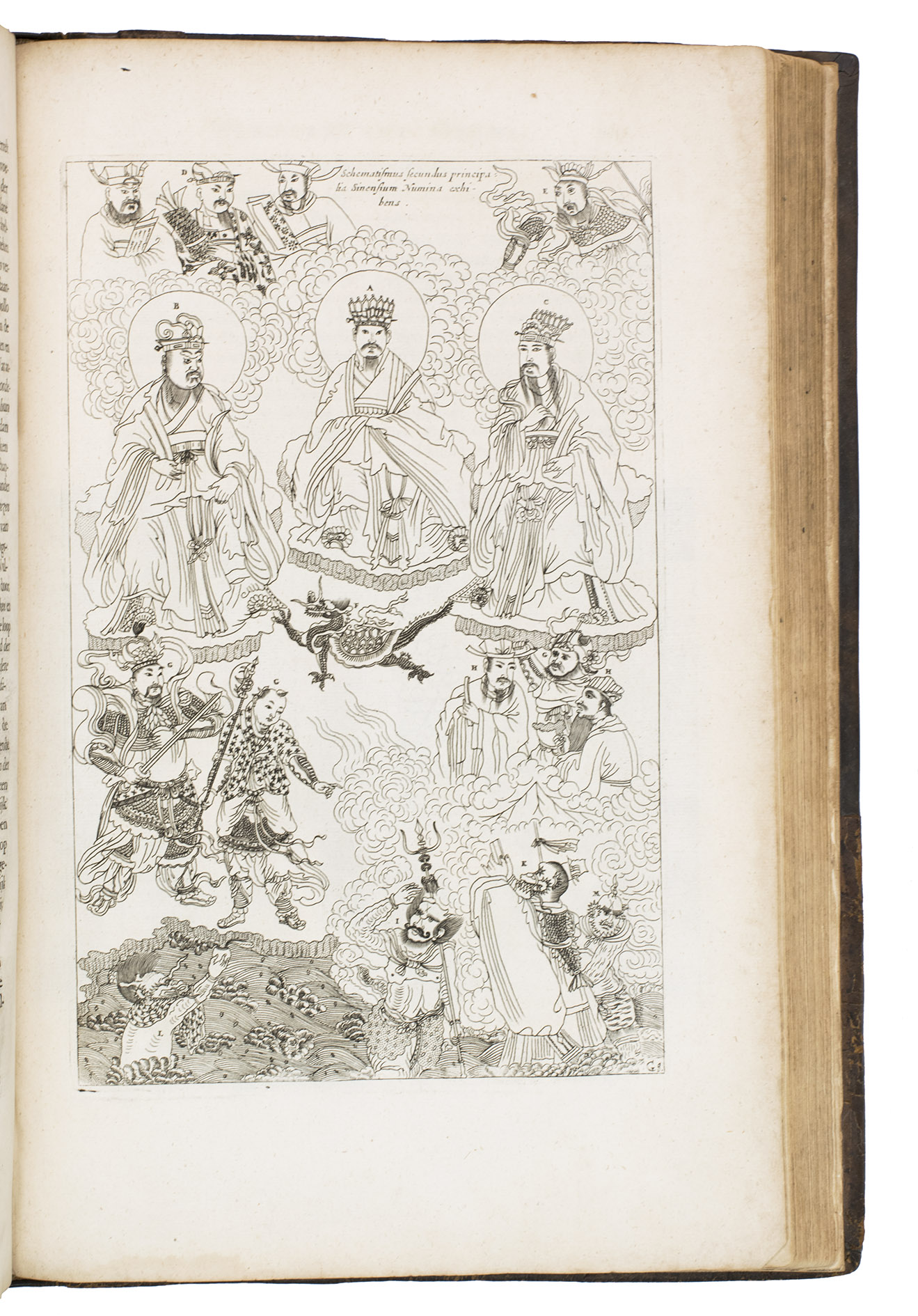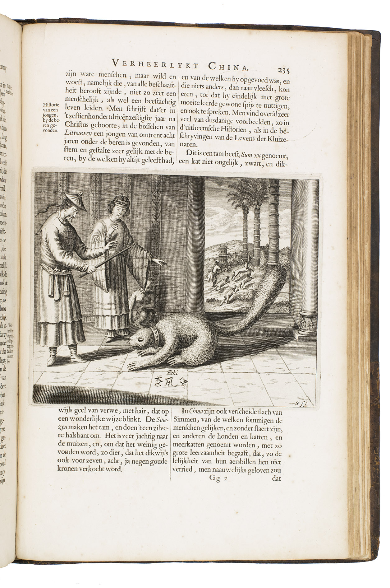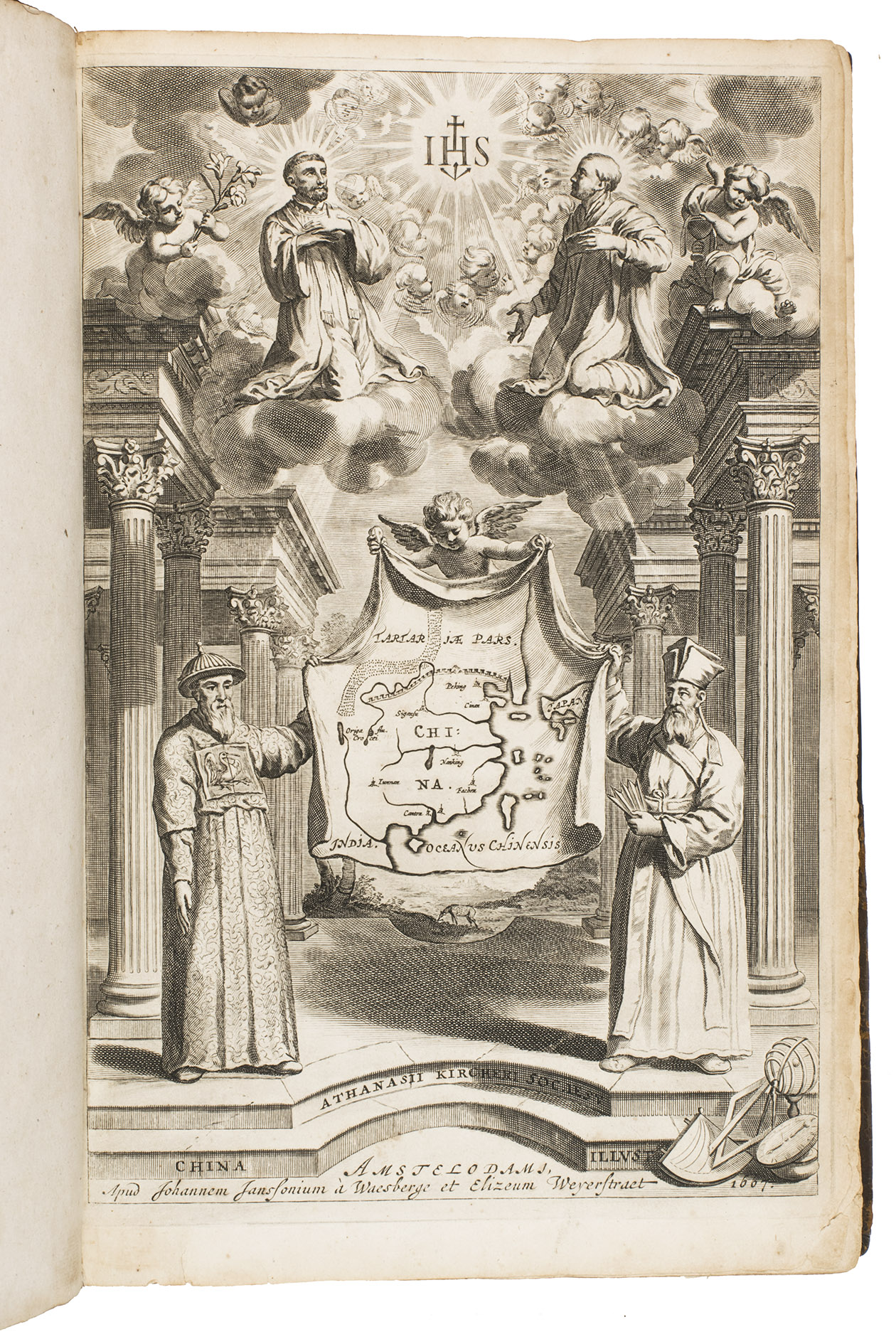 Amsterdam, Johannes Janssonius van Waesberge and the widow of Elizaeus Weyerstraten, 1668. Folio. With engraved frontispiece, engraved author's portrait, 24 engraved plates (including 2 double-page maps and 1 folding plate) and 60 engraved illustrations in text (plus another copy on a separate leaf, without letterpress text, of the engraving on 2F3v). Including maps of China and Asia, traditional Chinese costumes, illustrations of the Chinese and the Mughal rulers in abundantly decorated rooms, linguistic illustrations, zoological illustrations, etc. Contemporary gold-tooled calf, later endpapers (re-cased). [12], 286, [10] pp.