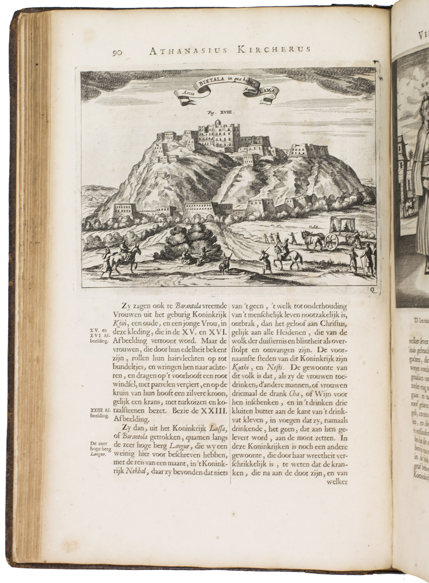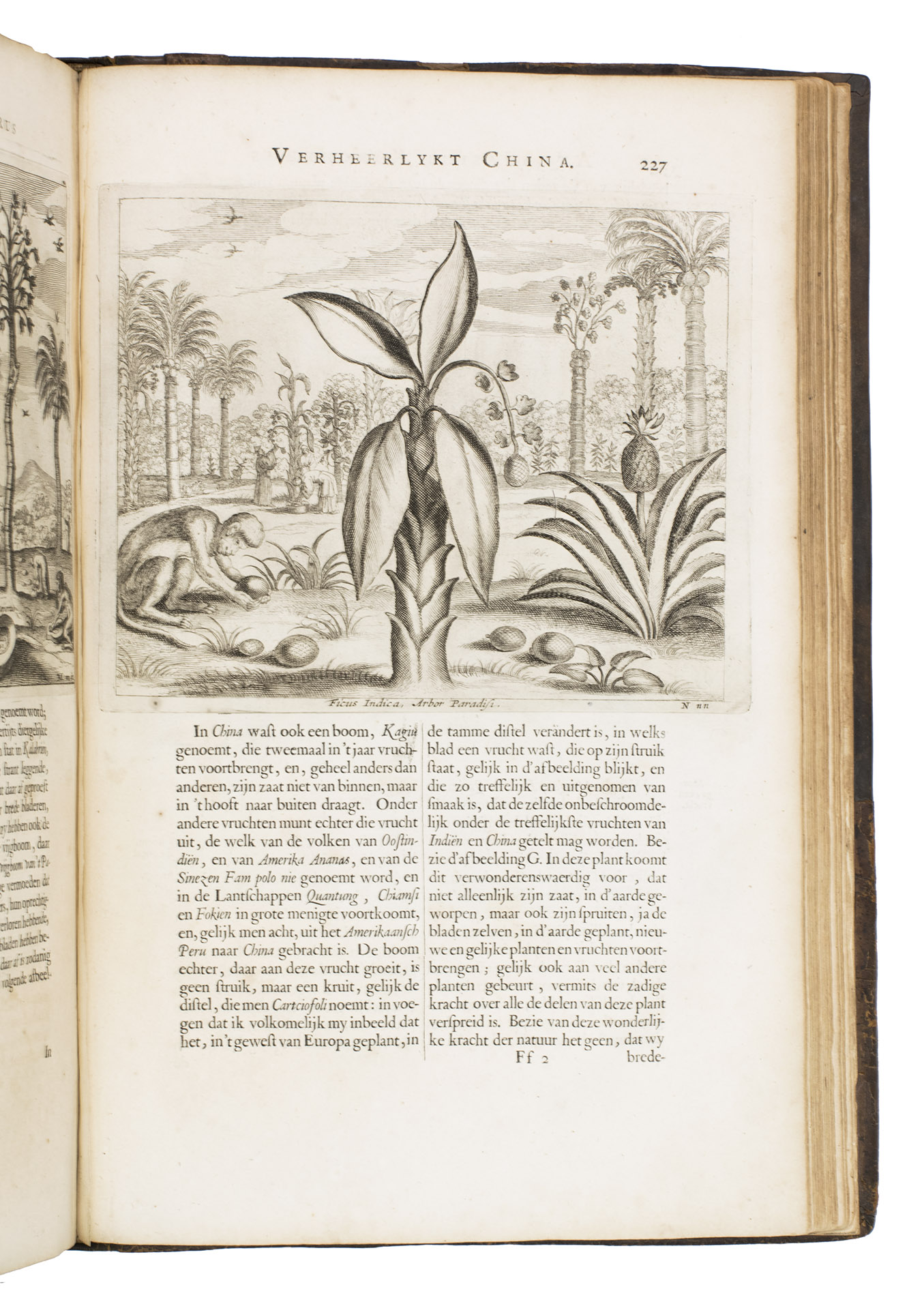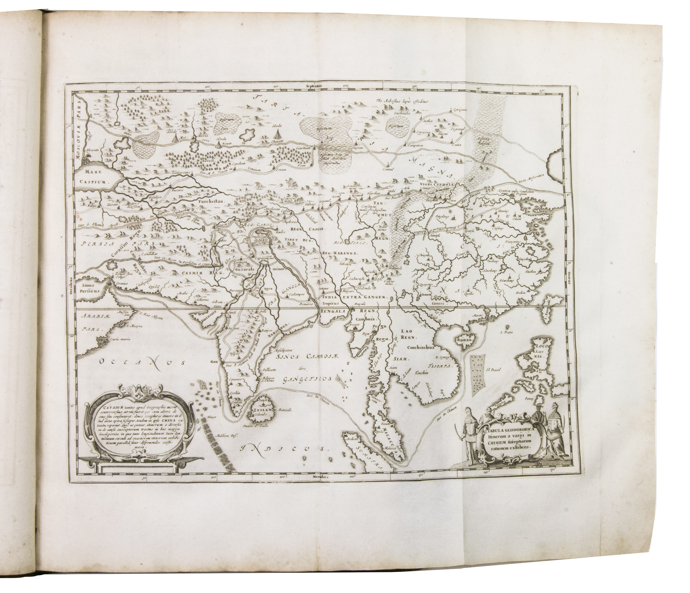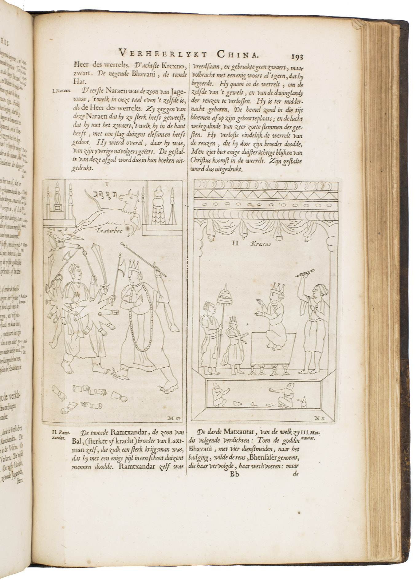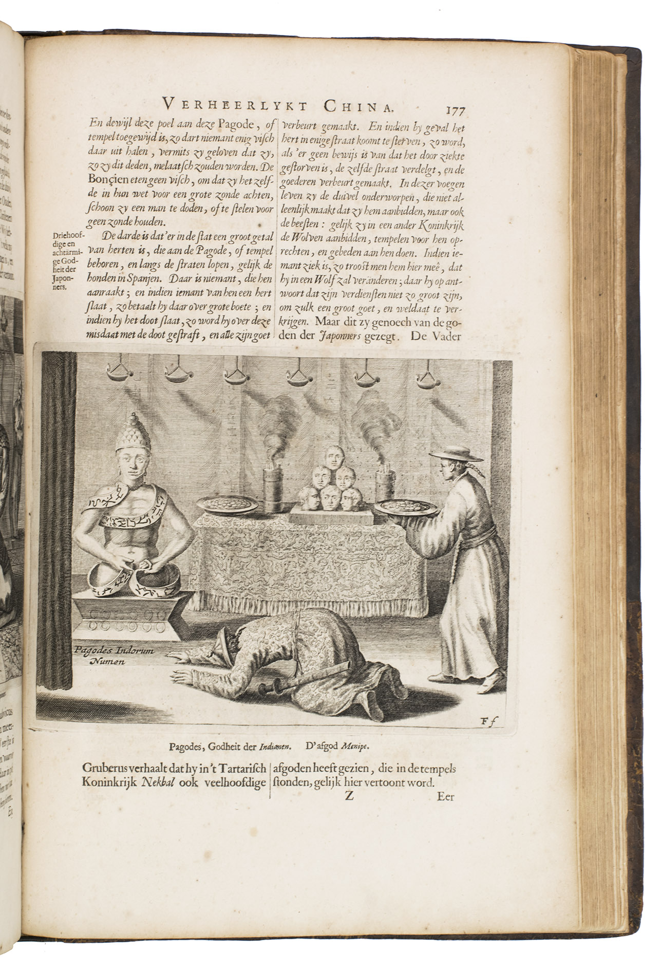 Amsterdam, Johannes Janssonius van Waesberge and the widow of Elizaeus Weyerstraten, 1668. Folio. With engraved frontispiece, engraved author's portrait, 24 engraved plates (including 2 double-page maps and 1 folding plate) and 60 engraved illustrations in text (plus another copy on a separate leaf, without letterpress text, of the engraving on 2F3v). Including maps of China and Asia, traditional Chinese costumes, illustrations of the Chinese and the Mughal rulers in abundantly decorated rooms, linguistic illustrations, zoological illustrations, etc. Contemporary gold-tooled calf, later endpapers (re-cased). [12], 286, [10] pp.
