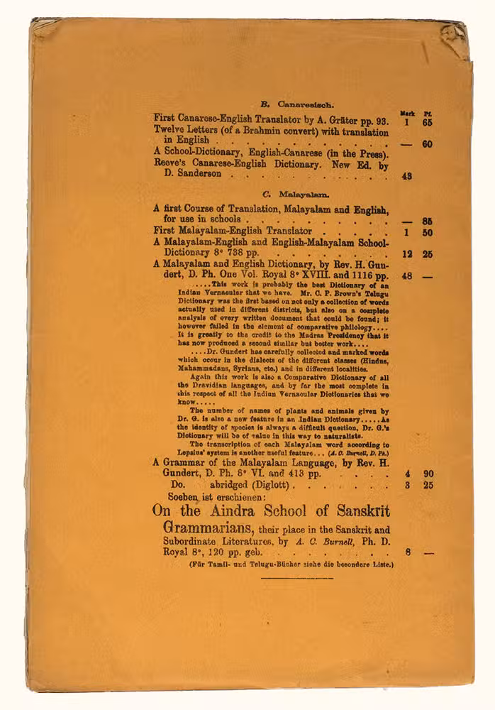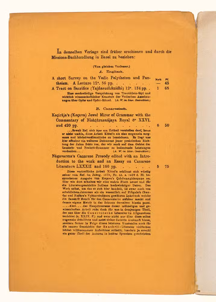 Mangalore, [printed by Stolz & Hirner, Basel Mission Press, Mangalore, for:] Basel mission book & tract depository, 1876. 8vo. With the title on the front wrapper in a printed decorative frame. Orange printed paper wrappers. [2], 48 pp.