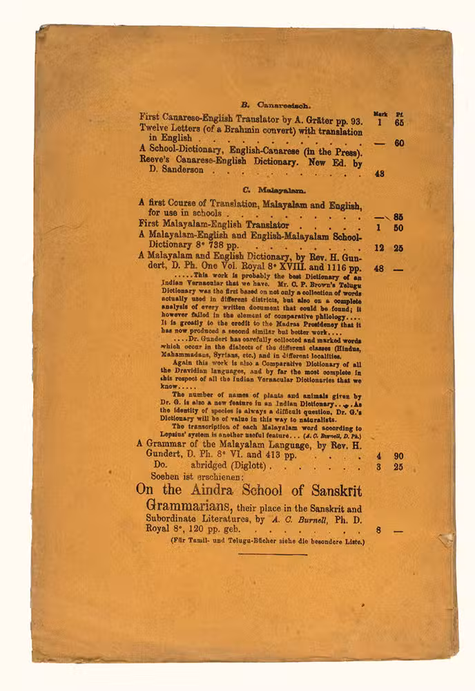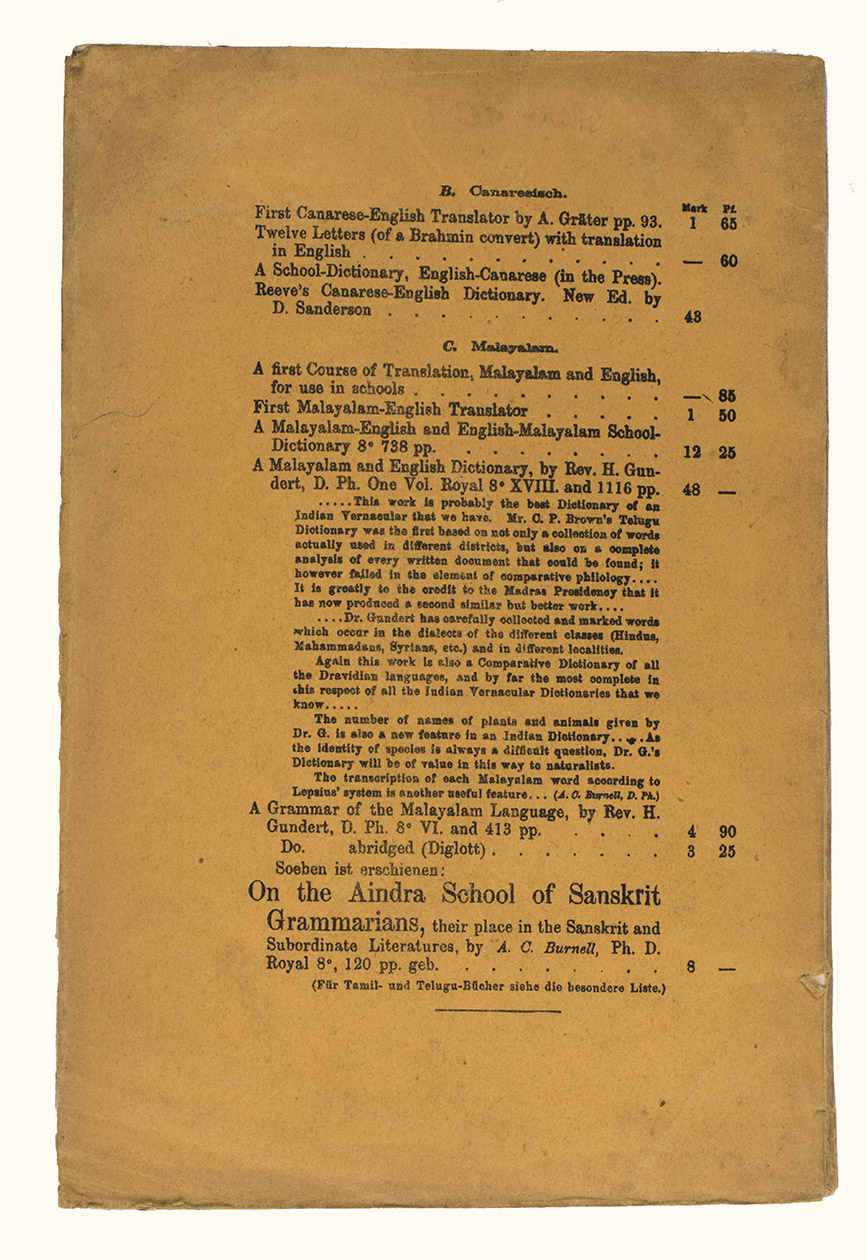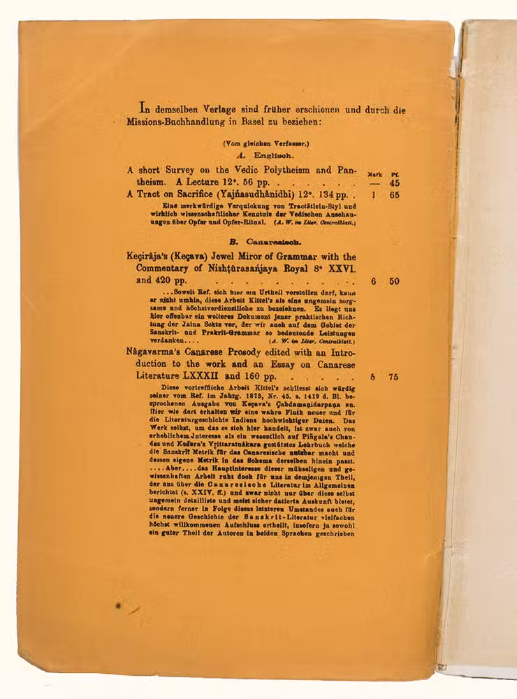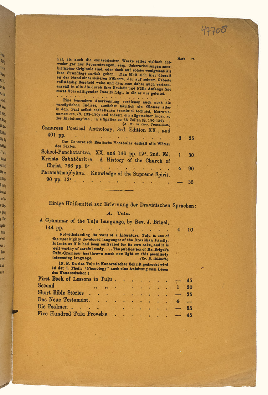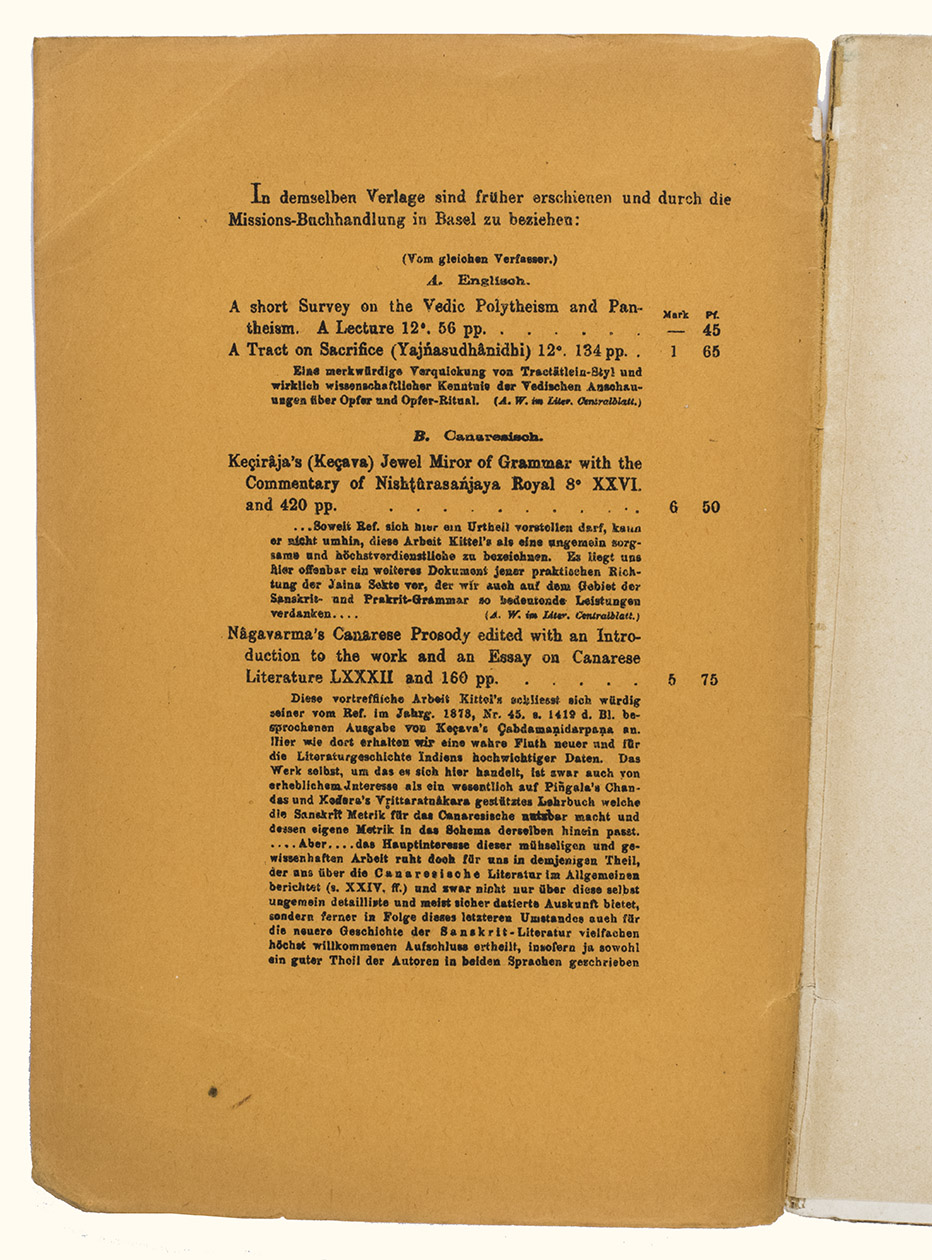 Mangalore, [printed by Stolz & Hirner, Basel Mission Press, Mangalore, for:] Basel mission book & tract depository, 1876. 8vo. With the title on the front wrapper in a printed decorative frame. Orange printed paper wrappers. [2], 48 pp.