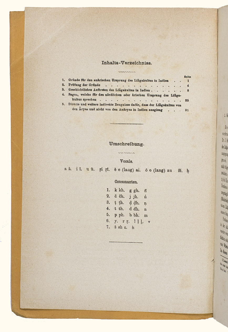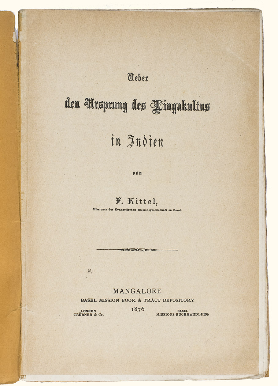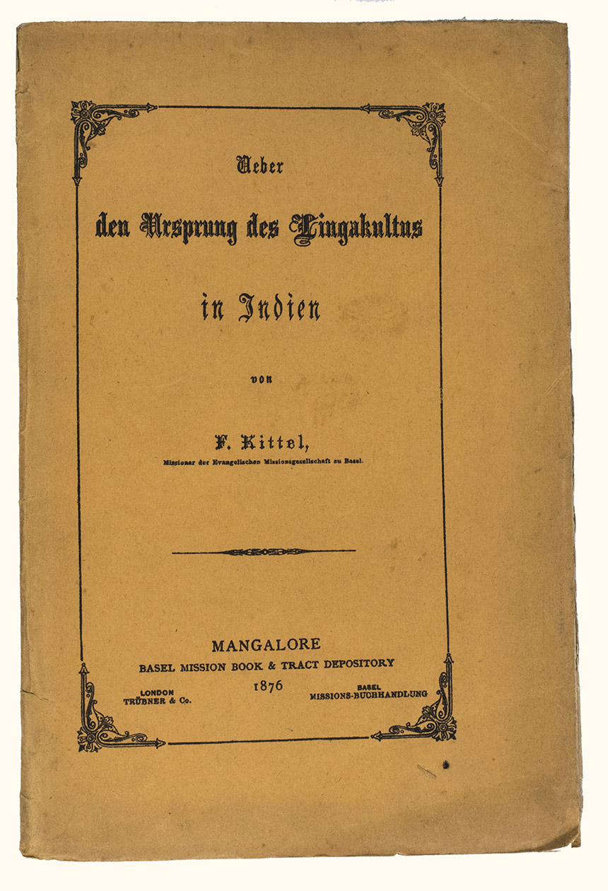 The German missionary to India Ferdinand Kittel (1832-1903), presented in 1876 with his Ueber den Ursprung des Lingakultus in Indien a study on the origins of the cult around the lingam in India. The lingam is a sacred object in Hinduism that represents the god Shiva and is considered a symbol of generative power. It is commonly found in Shaivite temples and private shrines across India and is often placed in the centre, surrounded by other deities. Unlike the sacred images of deities (murtis), the lingam is aniconic, being simply a cylindrical shape. It is typically paired with the yoni, a disk-shaped emblem of the goddess Shakti, to symbolize the union of the male and female principles and all of existence. T