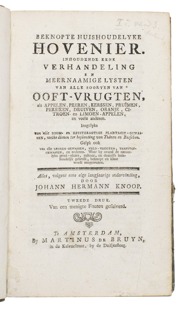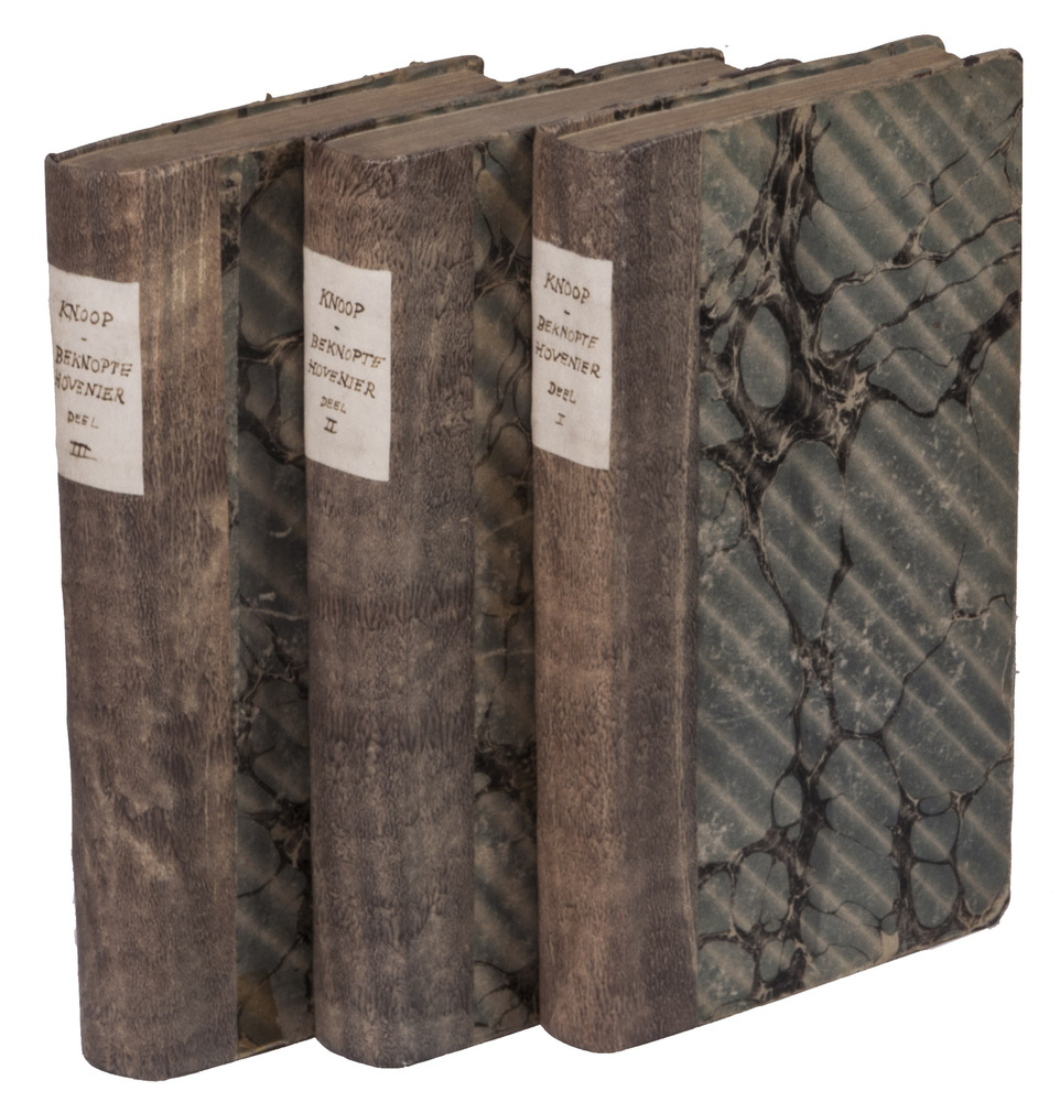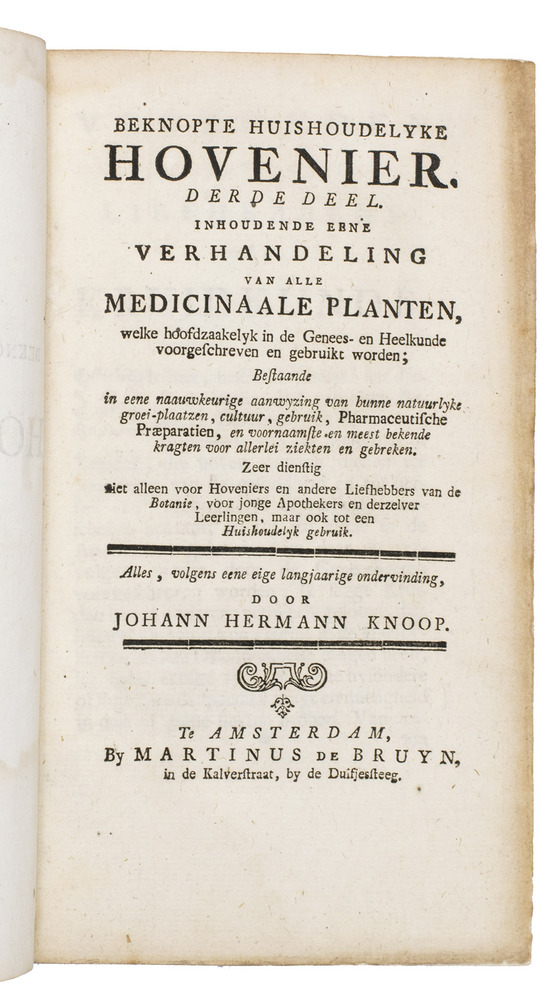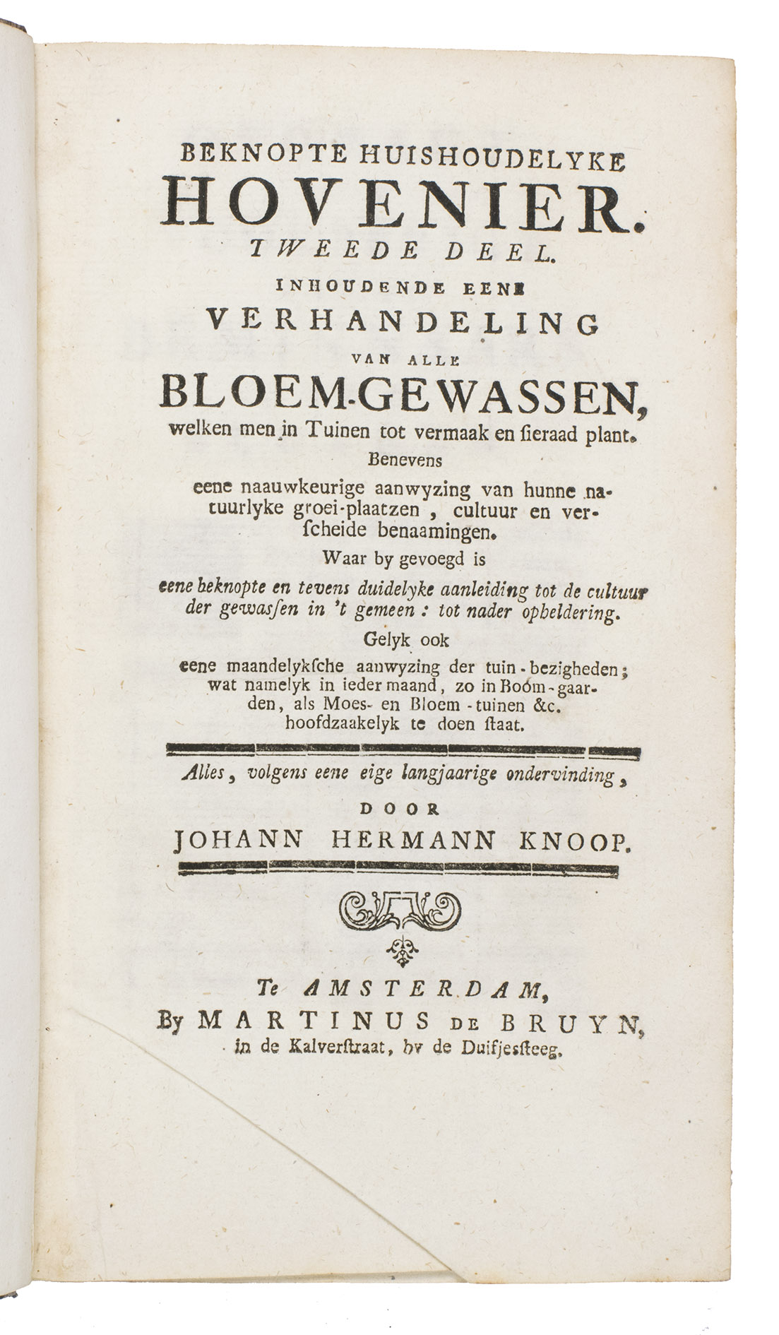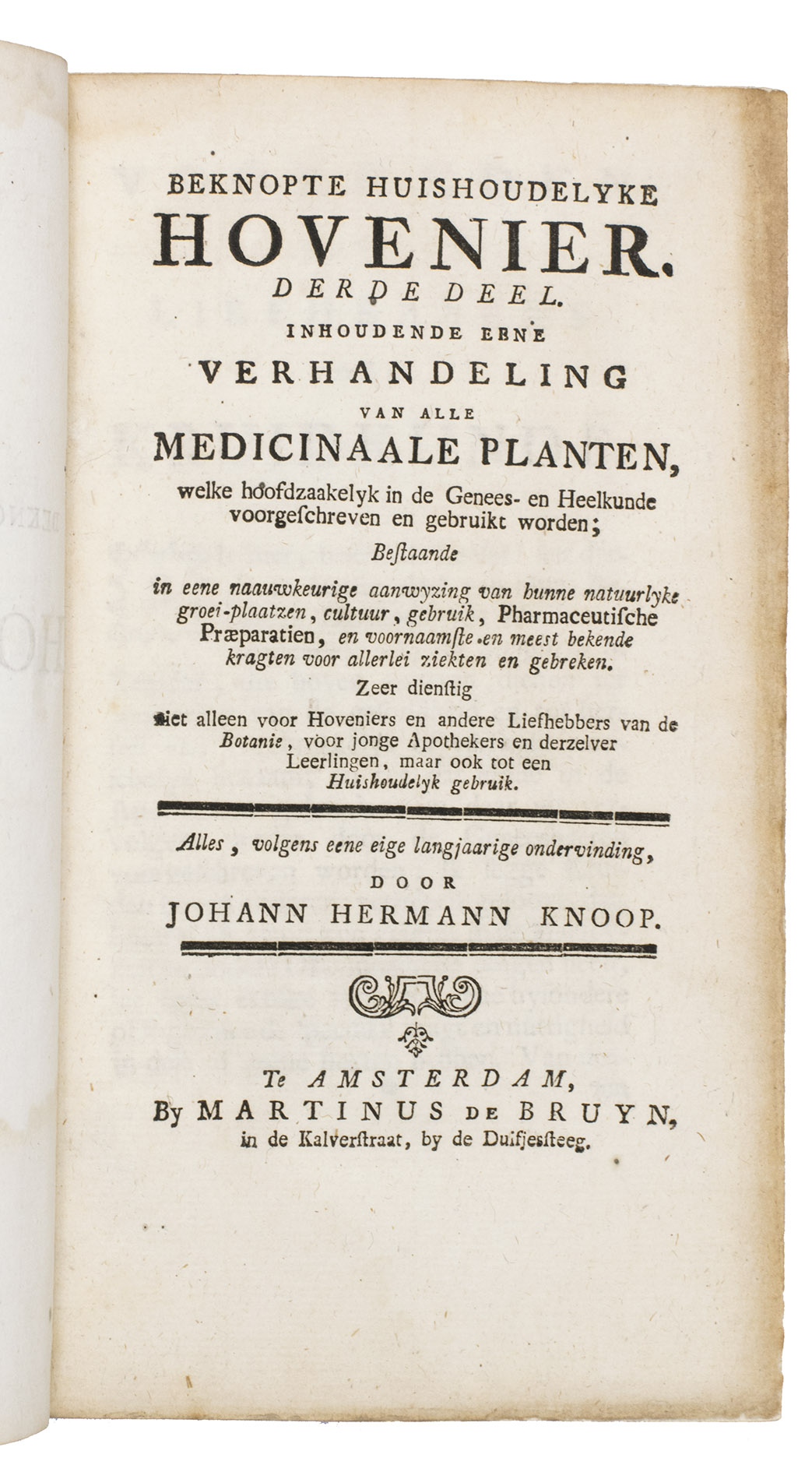 Very rare Amsterdam printing of the second improved and enlarged edition of this encyclopedic manual on all aspects of horticulture, including fruit- and kitchen-gardens, as well as the cultivation of medicinal plants and herbs by Johann Hermann Knoop (ca. 1700-1769). The various trees, plants and herbs are treated alphabetically, and at the end of the second part, devoted to the cultivation of flowers, a gardener's calendar is added. The third part, treating the medicinal plants, virtually present a popular pharmacopeia. The author, who was head gardener at the estate Marienburg near Leeuwarden, later reworked the first part, on fruit-trees, shrubs, and kitchen-gardens, into the famous coloured plates book "Pomologia, Fructologia", published in 4 volumes in the 1770s.