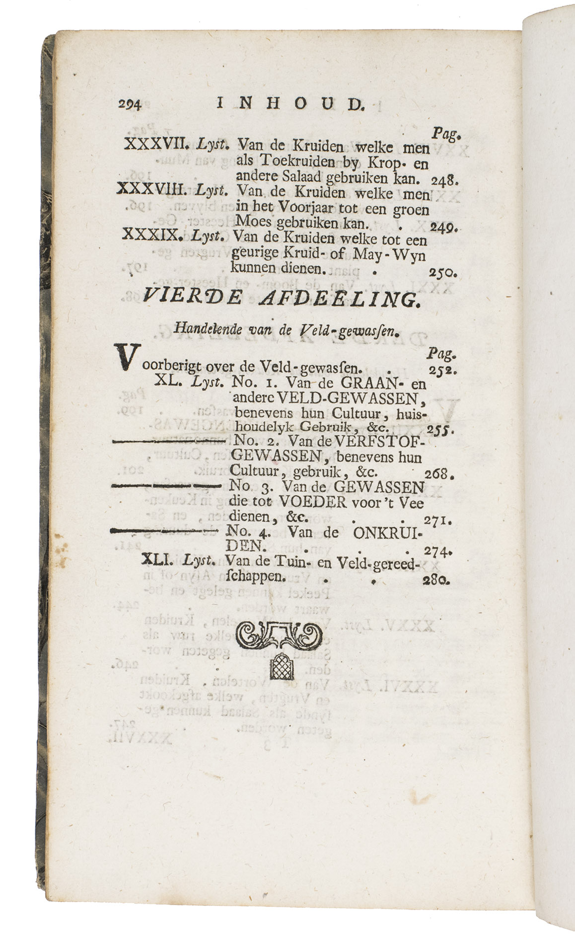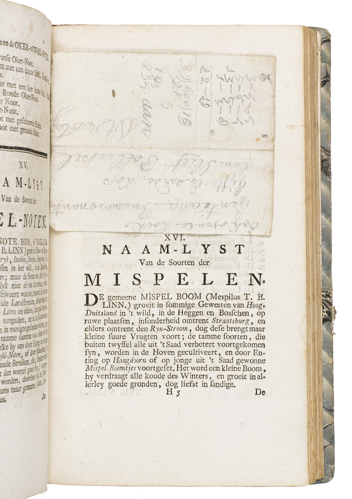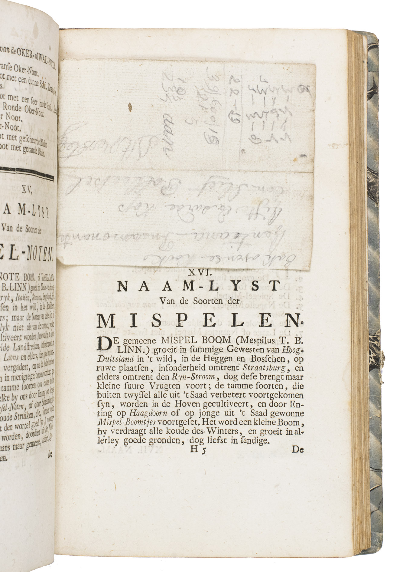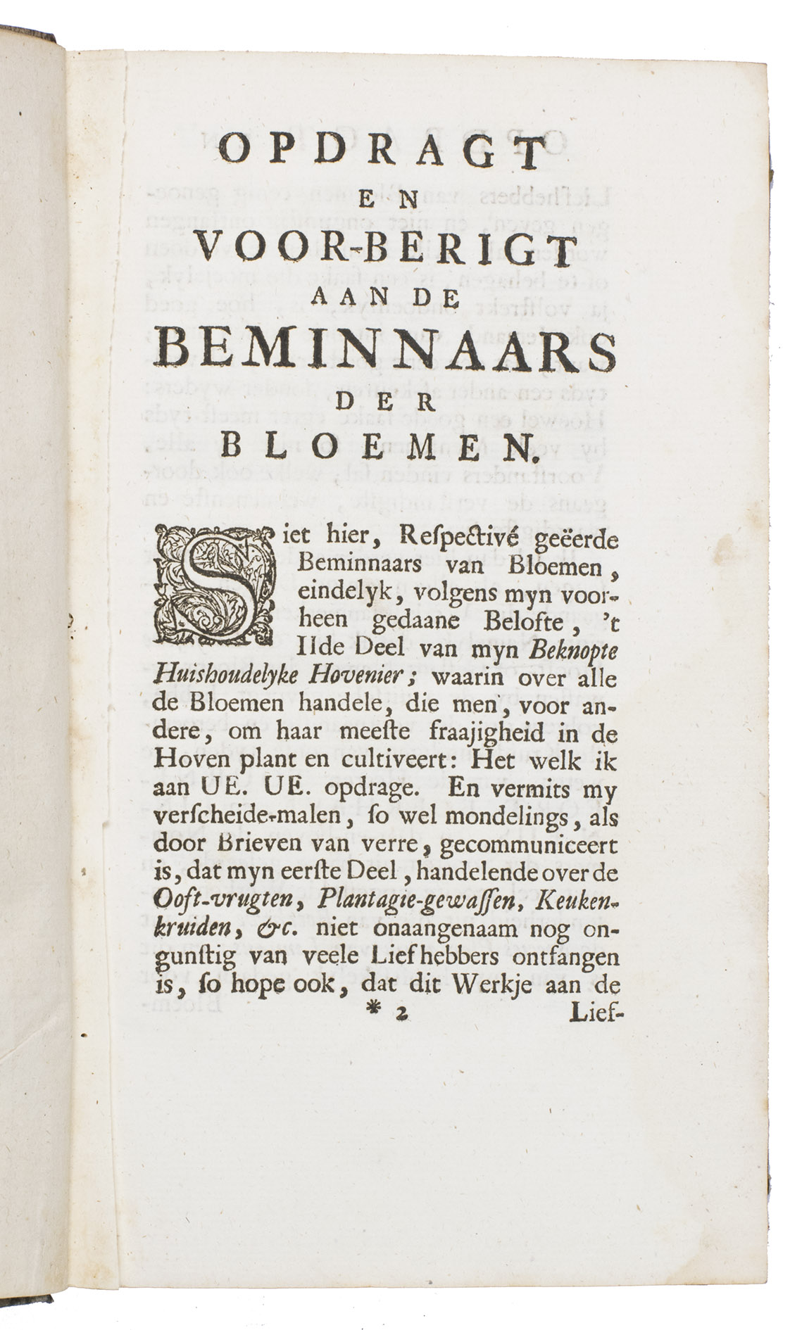 Very rare Amsterdam printing of the second improved and enlarged edition of this encyclopedic manual on all aspects of horticulture, including fruit- and kitchen-gardens, as well as the cultivation of medicinal plants and herbs by Johann Hermann Knoop (ca. 1700-1769). The various trees, plants and herbs are treated alphabetically, and at the end of the second part, devoted to the cultivation of flowers, a gardener's calendar is added. The third part, treating the medicinal plants, virtually present a popular pharmacopeia. The author, who was head gardener at the estate Marienburg near Leeuwarden, later reworked the first part, on fruit-trees, shrubs, and kitchen-gardens, into the famous coloured plates book "Pomologia, Fructologia", published in 4 volumes in the 1770s.