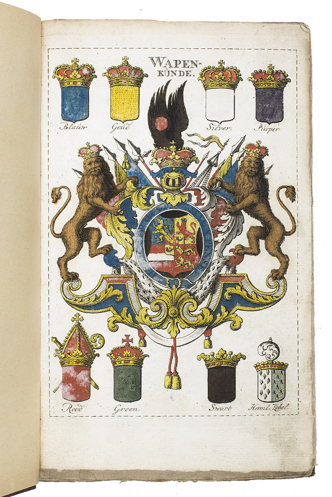 Second and last issue of the rare first and only edition of a heraldic game for young noblemen to learn the heraldry, genealogy, geography and history of the main European kingdoms, duchies, counties, electorates and other states. This was considered very important, since many of these young men were to one day take part in political and governmental activities. The game is to be played with a pack of ordinary playing cards and a map of the world spread over the playing table. Each player takes a turn by randomly drawing a card and describing the genealogy, heraldry, geography and history of the region that the book associates with that card. One of the players serves as arbiter and when a player fails to give a correct and sufficient description, he must pay a fine. The book itself provides the information for describing the heraldry, genealogy, geography and history of the regions it associates with the cards. The preface presents not only the rules of the game, but also several variant versions, and it concludes with a general educational text on heraldry and the lay-out and symbolism of coat-of-arms.