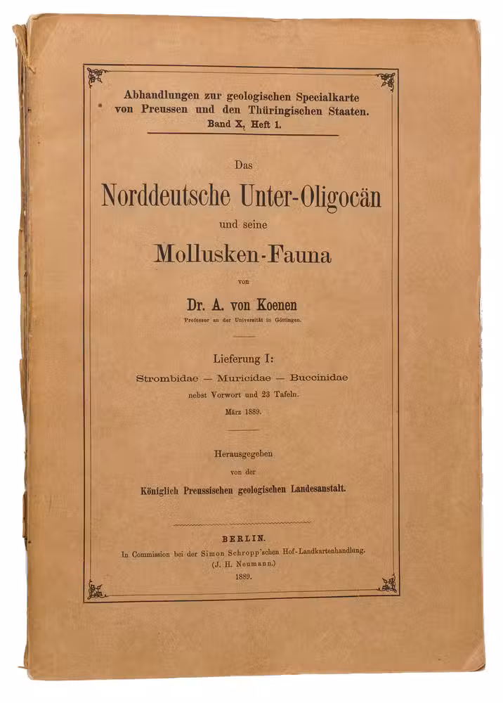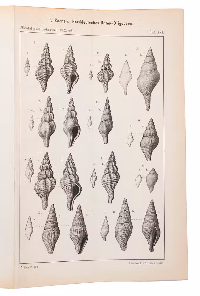 Richly illustrated scientific work written by Adolf von Koenen (1837-1915), which deals with the mollusks of the Lower Oligocene in northern Germany. It was published by the Royal Prussian Geological Survey as a part of the Abhandlungen zur geologischen Specialkarte von Preussen und den Thüringischen Staaten. Band X, Heft 1-7. The work examines various families of marine gastropods, including Strombidae, Muricidae, Buccinidae, Naticidae, Pyramidellidae, Eulimidae, Cerithidae, and Turritellidae. The work is divided into several volumes and contains detailed descriptions and illustrations of the mollusk species. It is an important source for research into the paleontology of the North German Lower Oligocene and the evolution of mollusks in this region.
