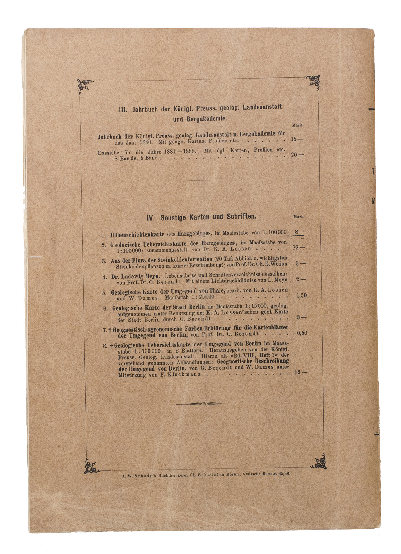 Berlin, Königlich Preussischen geologischen Landesanstat, Im Vertrieb der Simon Schropp, 1889-1894. 7 parts (bound in 7). Large 8vo (25.5 x 17.5 cm). With 101 folding plates. Original printed brown paper wrappers, with the title on the spine (printed for volumes 1-6, manuscript for volume 7). 1458 pp.